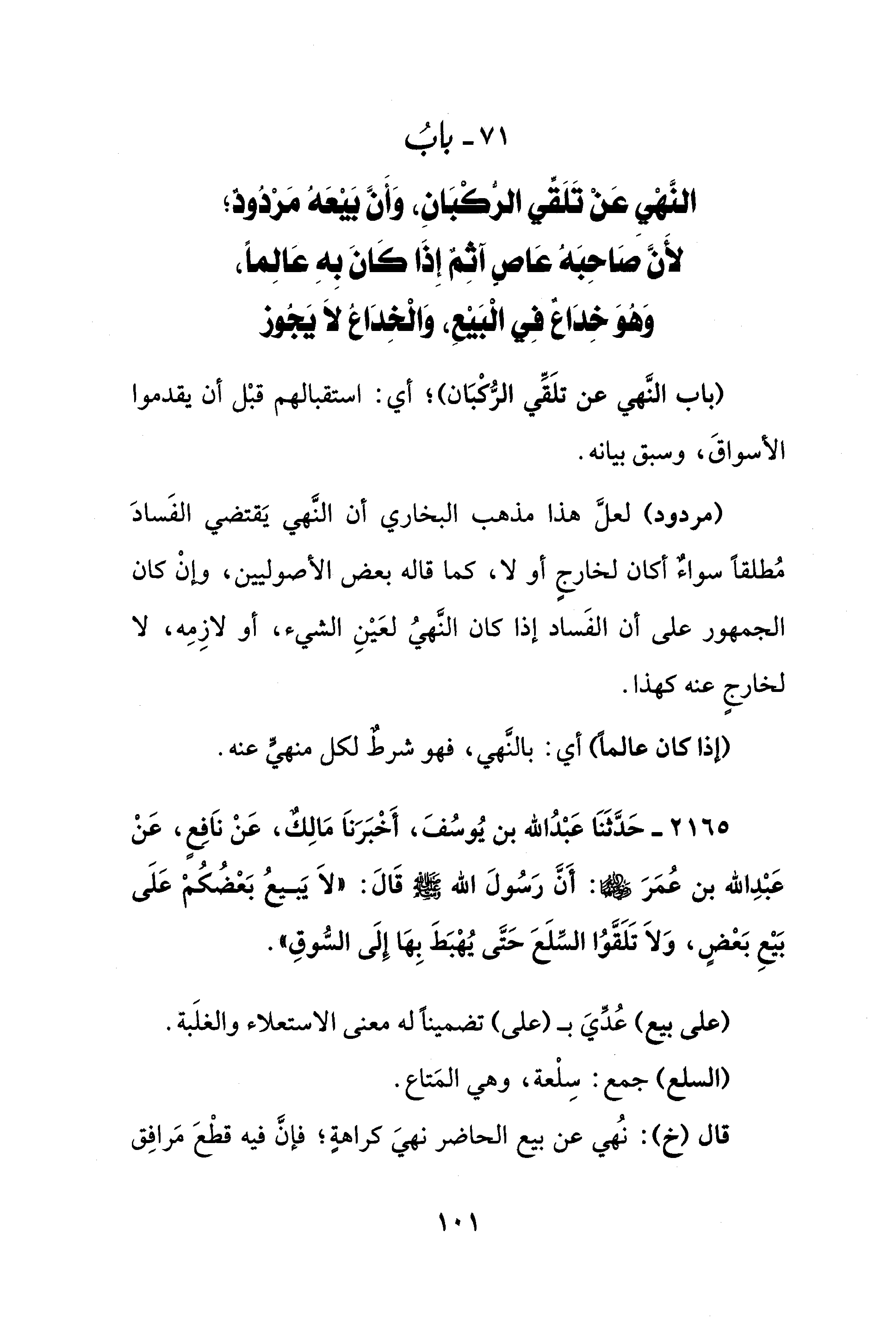 2165 - حَدَّثَنَا عَبْدُ الله بن يُوسُفَ، أَخْبَرَناَ مَالِكٌ، عَنْ ناَفِعٍ، عَنْ عَبْدِ الله بن عُمَرَ - رضي الله عنهما -: أَنَّ رَسُولَ الله - صلى الله عليه وسلم - قَالَ: "لاَ يَبيعُ بَعْضُكُمْ عَلَى بَيْعِ بَعْضٍ، وَلاَ تَلَقَّوُا السِّلَعَ حَتَّى يُهْبَطَ بِهَا إِلَى السُّوقِ".