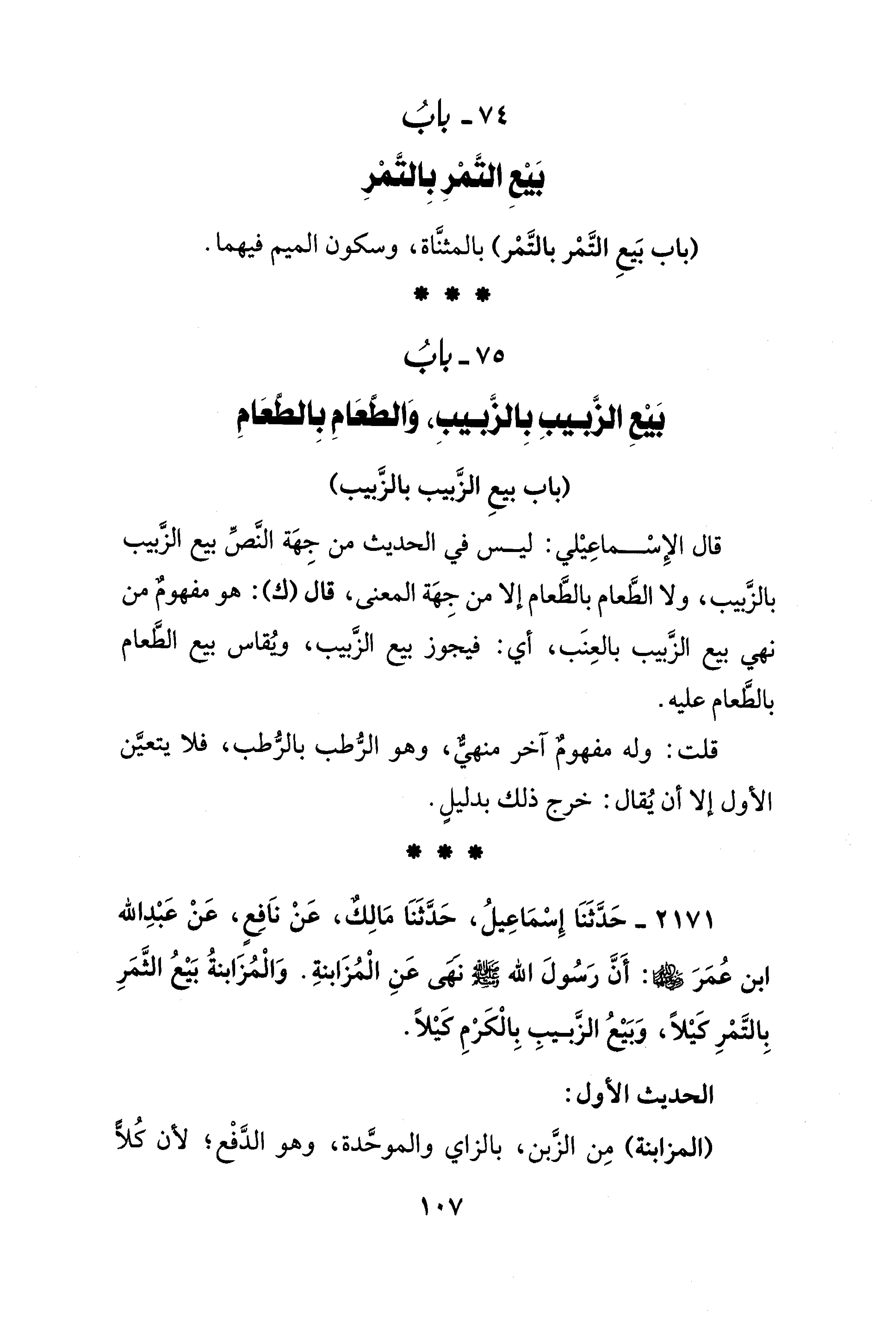 2171 - حَدَّثَنَا إِسْمَاعِيلُ، حَدَّثَنَا مَالِكٌ، عَنْ ناَفِعٍ، عَنْ عَبْدِ الله ابن عُمَرَ - رضي الله عنهما -: أَنَّ رَسُولَ الله - صلى الله عليه وسلم - نَهَى عَنِ الْمُزَابنةِ. وَالْمُزَابنةُ بَيعُ الثَّمَرِ بِالتَّمْرِ كيْلًا، وَبَيْعُ الزَّبيبِ بِالْكَرْمِ كَيْلًا.