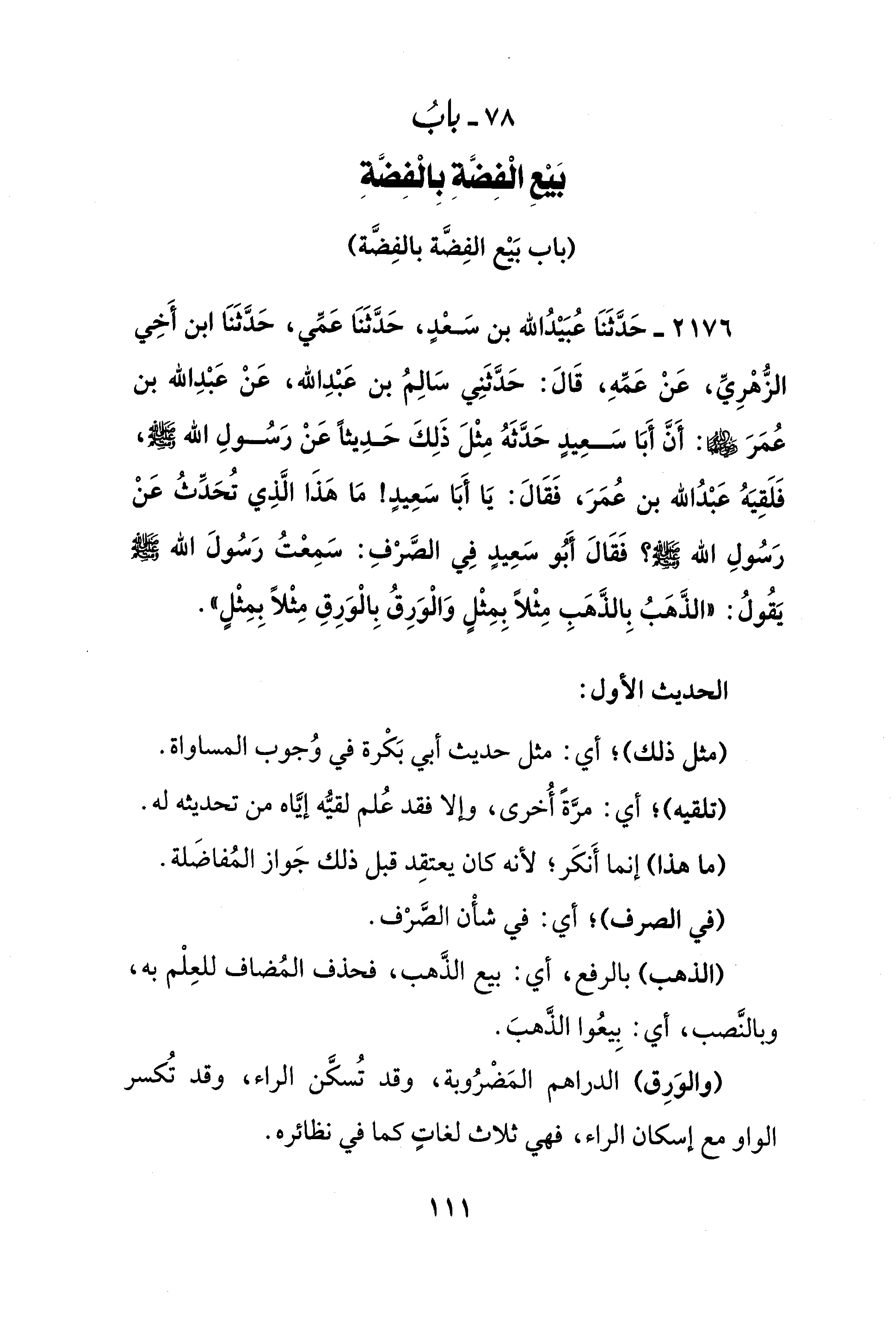 2176 - حَدَّثَنَا عُبَيْدُ الله بن سَعْدٍ، حَدَّثَنَا عَمِّي، حَدَّثَنَا ابن أَخِي الزُّهْرِيِّ، عَنْ عَمِّهِ، قَالَ: حَدَّثَنِي سَالِمُ بن عَبْدِ الله، عَنْ عَبْدِ الله بن عُمَرَ - رضي الله عنهما -: أَنَّ أَبَا سَعِيدٍ حَدَّثَهُ مِثْلَ ذَلِكَ حَدِيثًا عَنْ رَسُولِ الله - صلى الله عليه وسلم -، فَلَقِيَهُ عَبْدُ الله بن عُمَرَ، فَقَالَ: يَا أَبَا سَعِيدٍ! مَا هَذَا الَّذِي تُحَدِّثُ عَنْ رَسُولِ الله - صلى الله عليه وسلم -؟ فَقَالَ أَبُو سَعِيدٍ في الصَّرْفِ: سَمِعْتُ رَسُولَ الله - صلى الله عليه وسلم - يَقُولُ: "الذَّهَبُ بِالذَّهَبِ مِثْلًا بِمِثْلٍ وَالْوَرِقُ بِالْوَرِقِ مِثْلًا بِمِثْل".