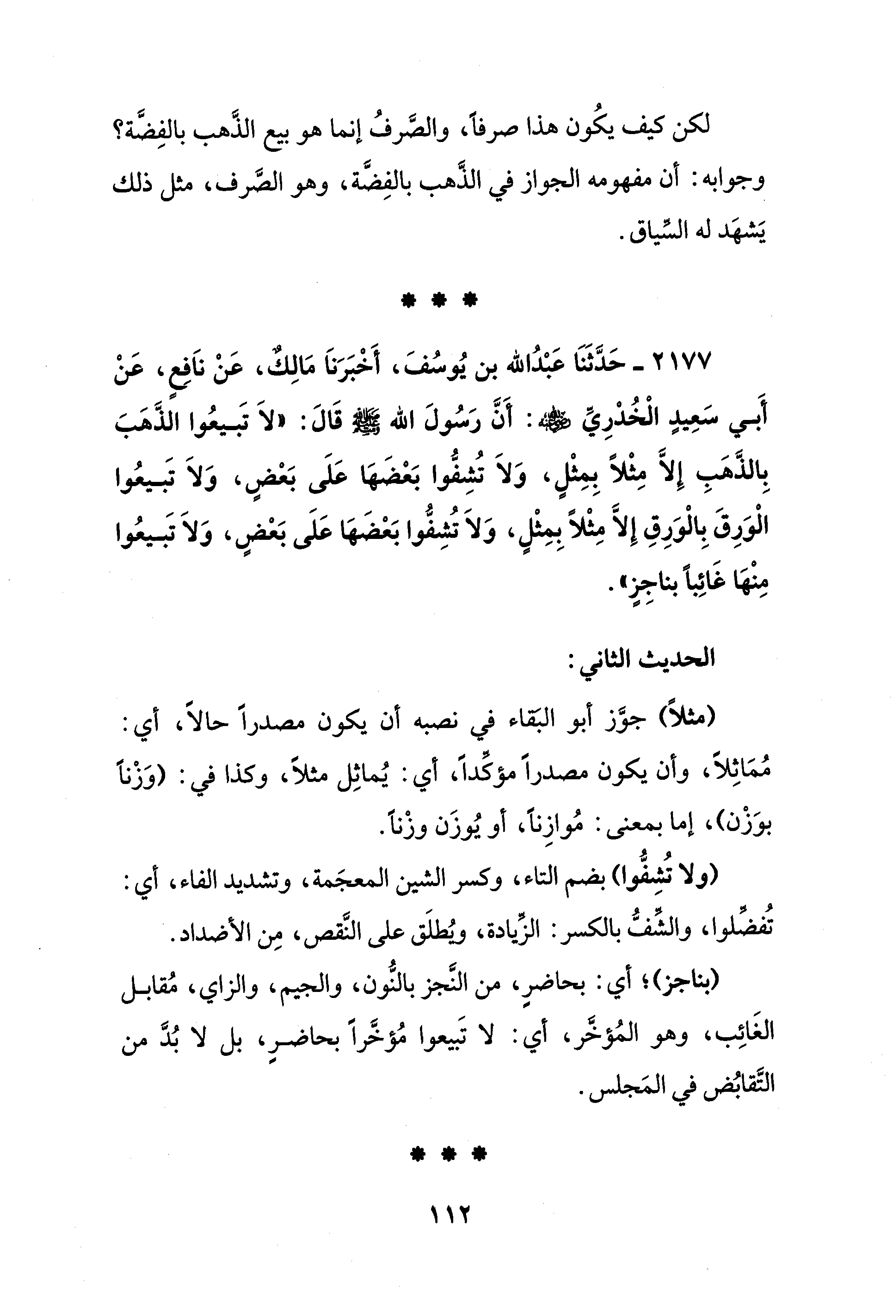 2177 - حَدَّثَنَا عَبْدُ الله بن يُوسُفَ، أَخْبَرَناَ مَالِكٌ، عَنْ ناَفِعٍ، عَنْ أَبي سَعِيدٍ الْخُدْرِيِّ - رضي الله عنه -: أَنَّ رَسُولَ الله - صلى الله عليه وسلم - قَالَ: "لاَ تَبيعُوا الذَّهَبَ بِالذَّهَبِ إِلَّا مِثْلًا بِمِثْلٍ، وَلاَ تُشِفُّوا بَعْضَهَا عَلَى بَعْضٍ، وَلاَ تَبيعُوا الْوَرِقَ بِالْوَرِقِ إِلَّا مِثْلًا بِمِثْلٍ، وَلاَ تُشِفُّوا بَعْضَهَا عَلَى بَعْضٍ، وَلاَ تَبيعُوا مِنْهَا غَائِبًا بناجِزٍ".
