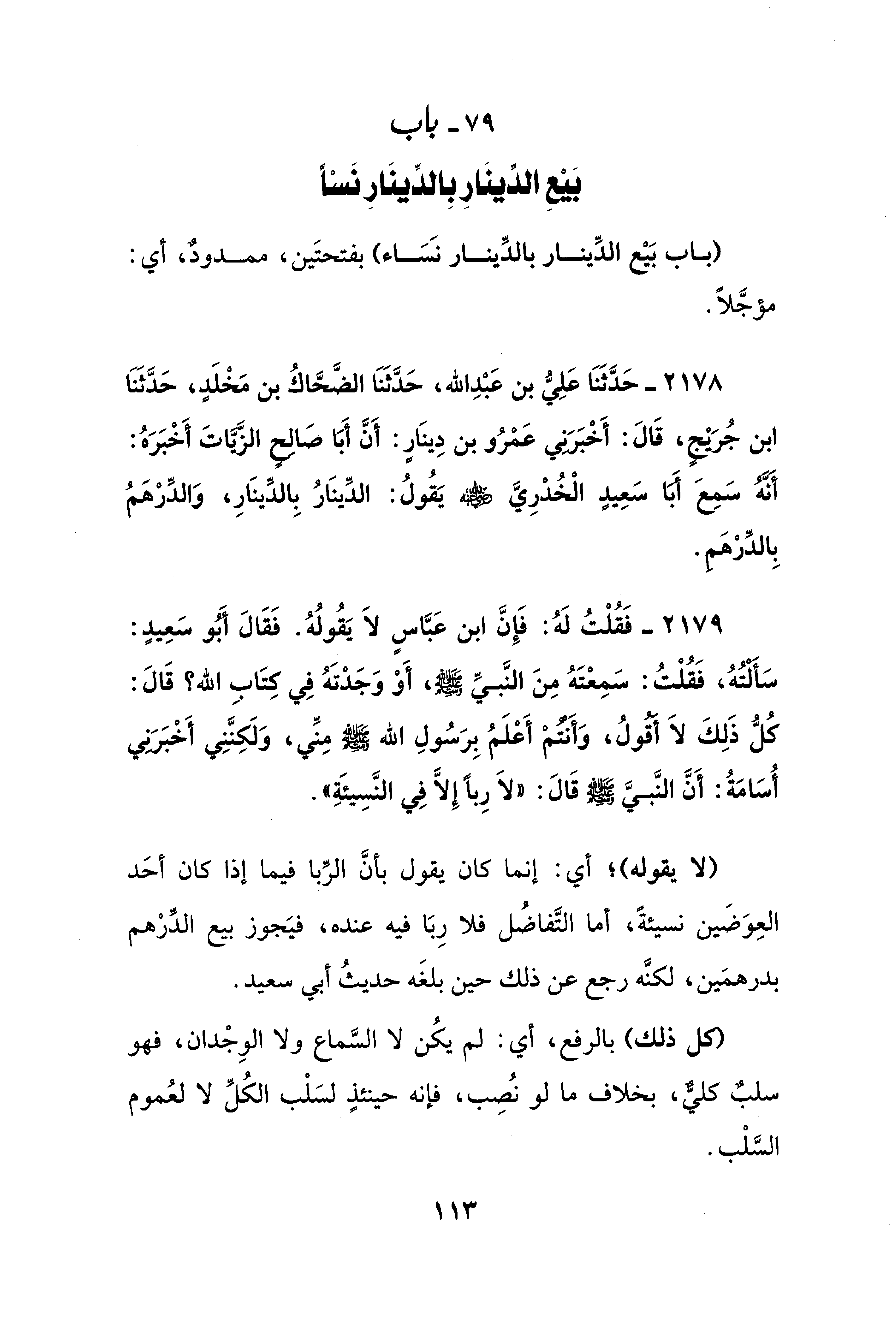 2178 - حَدَّثَنَا عَلِيُّ بن عَبْدِ الله، حَدَّثَنَا الضَّحَّاكُ بن مَخْلَدٍ، حَدَّثَنَا ابن جُرَيْجٍ، قَالَ: أَخْبَرَنِي عَمْرُو بن دِينَارٍ: أَنَّ أَبَا صَالِحٍ الزَّيَّاتَ أَخْبَرَهُ: أنَّهُ سَمِعَ أَبَا سَعِيدٍ الْخُدْرِيَّ - رضي الله عنه - يَقُولُ: الدِّينَارُ بِالدِّينَارِ، وَالدِّرْهَمُ بِالدِّرْهَمِ.