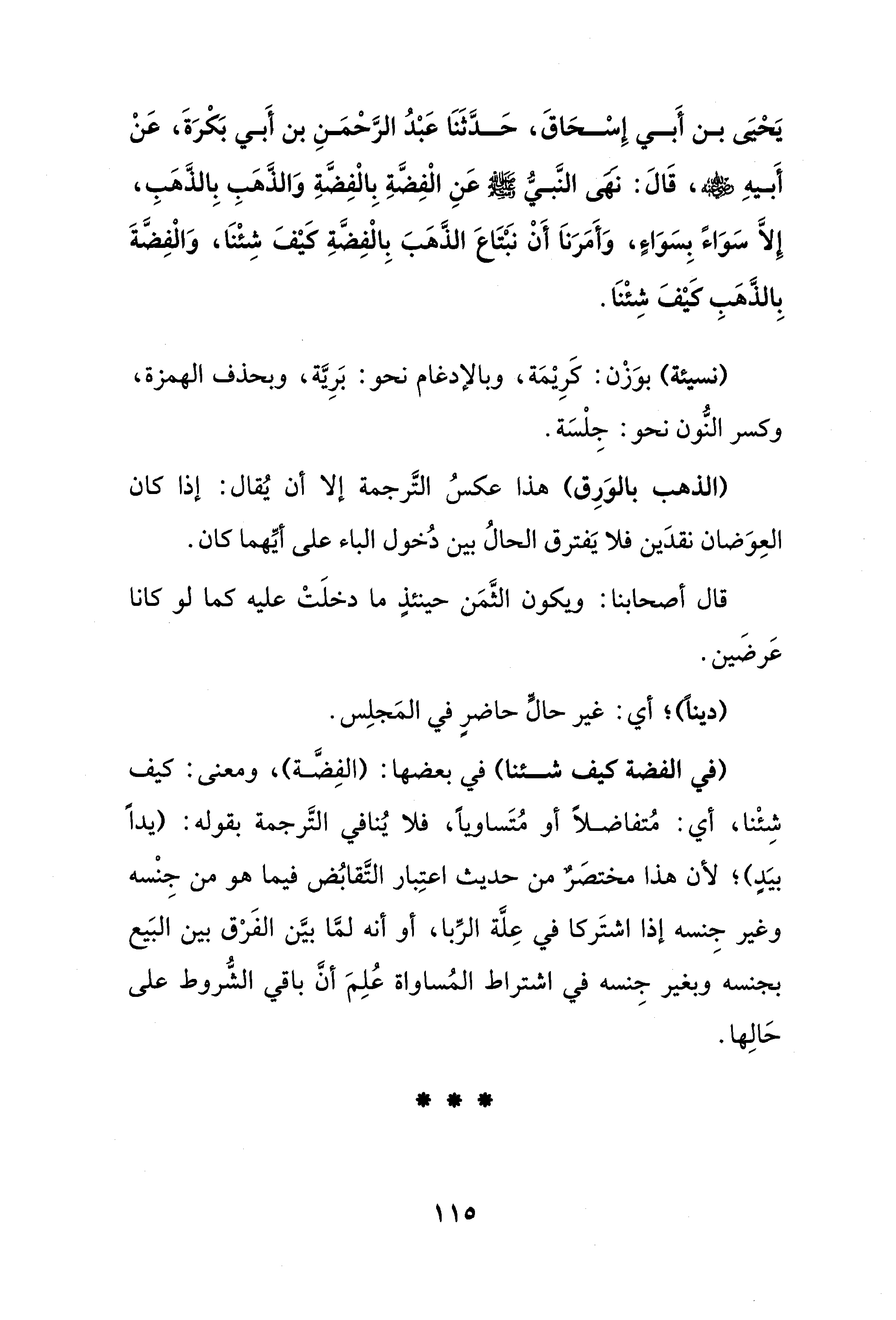 يَحْيَى بن أَبي إِسْحَاقَ، حَدَّثَنَا عَبْدُ الرَّحْمَنِ بن أَبي بَكْرَةَ، عَنْ أَبيهِ - رضي الله عنه -، قَالَ: نَهَى النَّبيُّ - صلى الله عليه وسلم - عَنِ الْفِضَّةِ بِالْفِضَّةِ وَالذَهَبِ، بِالذَّهَبِ، إِلَّا سَوَاءً بِسَوَاءٍ، وَأَمَرَناَ أَنْ نَبْتَاعَ الذَّهَبَ بِالْفِضَّةِ كَيْفَ شِئْنَا، وَالْفِضَّةَ بِالذَّهَبِ كيْفَ شِئْنَا.