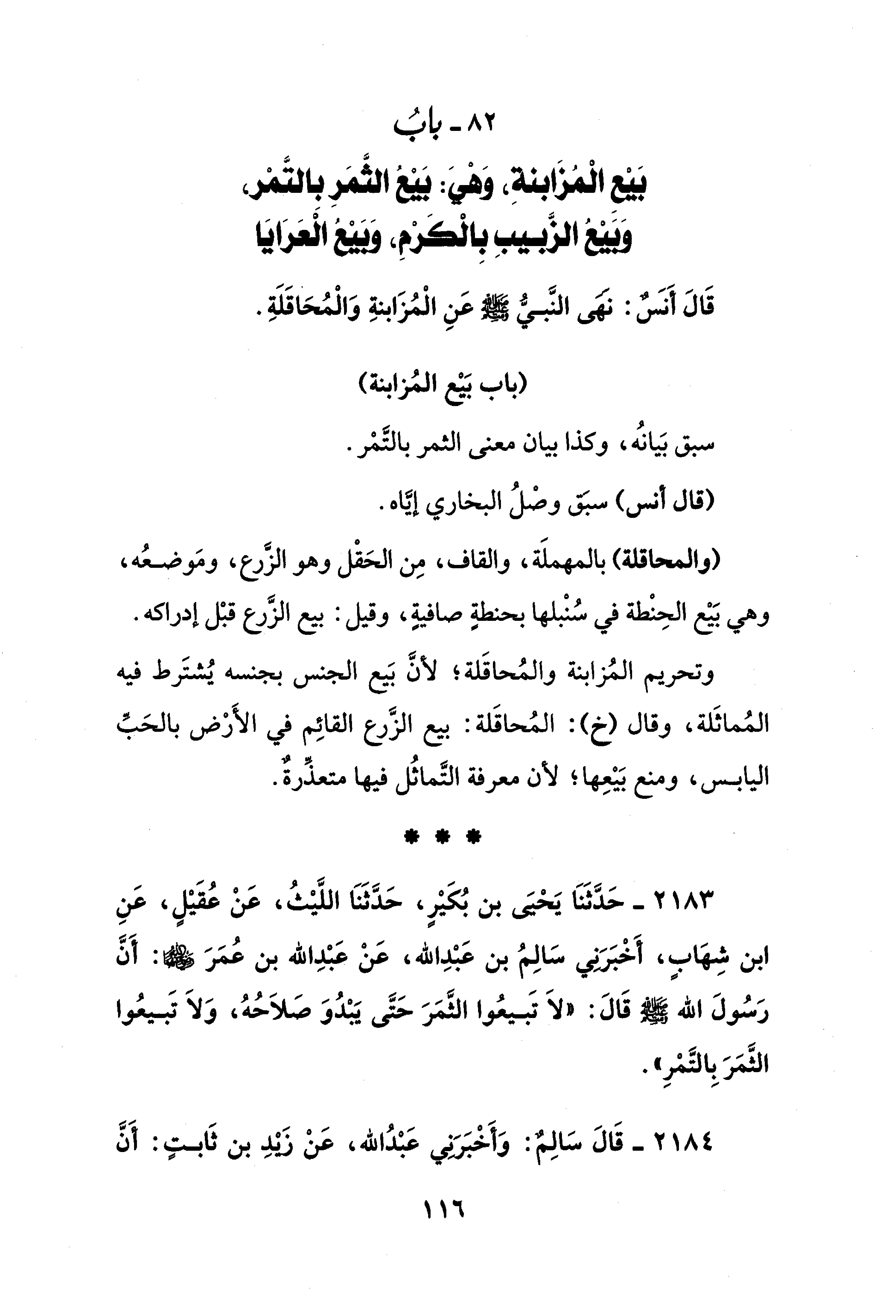 2183 - حَدَّثَنَا يَحْيَى بن بُكَيْرٍ، حَدَّثَنَا اللَّيْثُ، عَنْ عُقَيْلٍ، عَنِ ابن شِهَابٍ، أَخْبَرَنِي سَالِمُ بن عَبْدِ الله، عَنْ عَبْدِ الله بن عُمَرَ - رضي الله عنهما -: أَنَّ رَسُولَ الله - صلى الله عليه وسلم - قَالَ: "لاَ تَبيعُوا الثَّمَرَ حَتَّى يَبْدُوَ صَلاَحُهُ، وَلاَ تَبيعُوا الثَّمَرَ بِالتَّمْرِ".