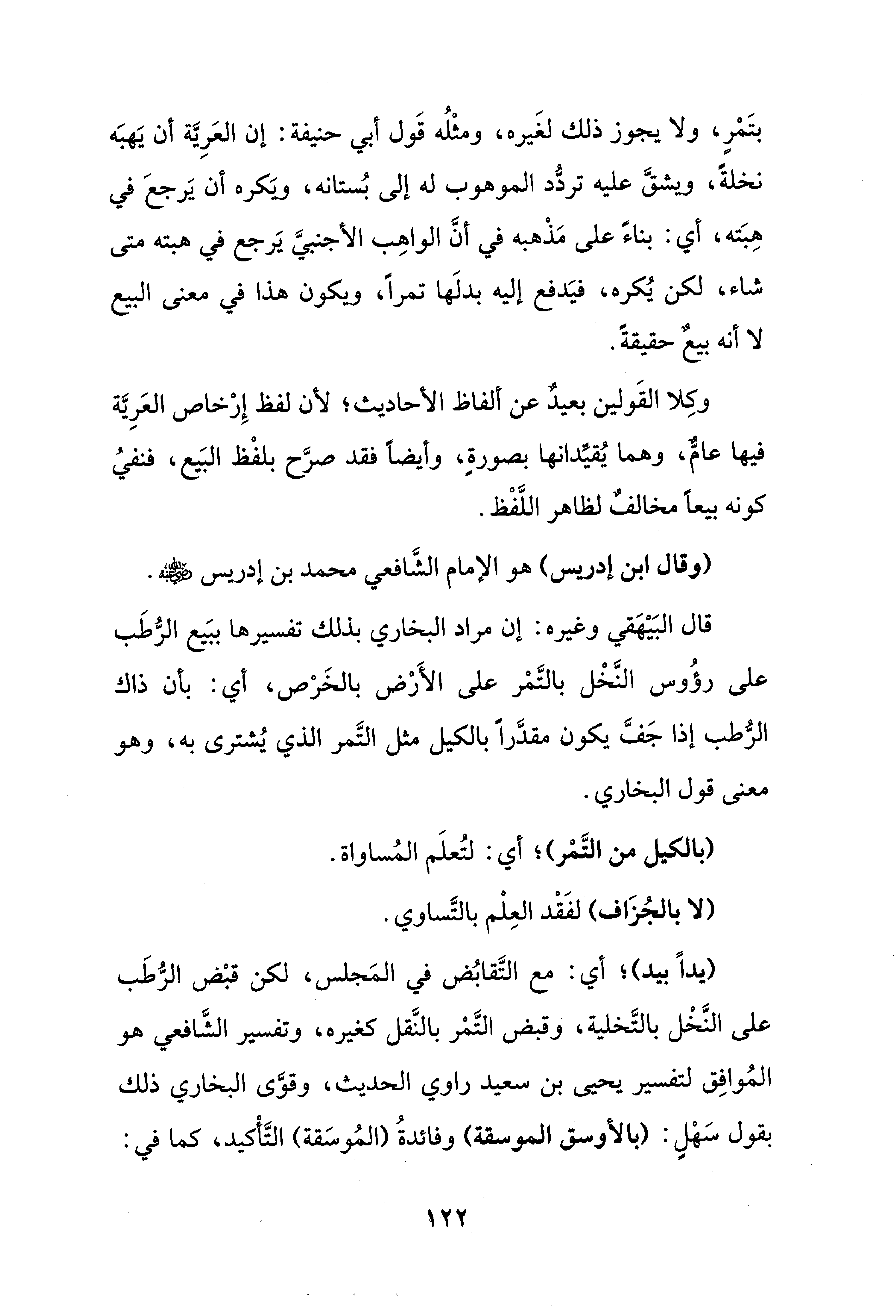 بتَمْرٍ، ولا يجوز ذلك لغَيره، ومثْلُه قَول أبي حنيفة: إن العَرِيَّة أن يَهبَه نخلةً، ويشقَّ عليه تردُّد الموهوب له إلى بُستانه، ويَكره أن يَرجعَ في هِبَته، أي: بناءً على مَذْهبه في أنَّ الواهِب الأجنبيَّ يَرجع في هبته متى شاء، لكن يُكره، فيَدفع إليه بدلَها تمرًا، ويكون هذا في معنى البيع لا أنه بيعٌ حقيقةً.