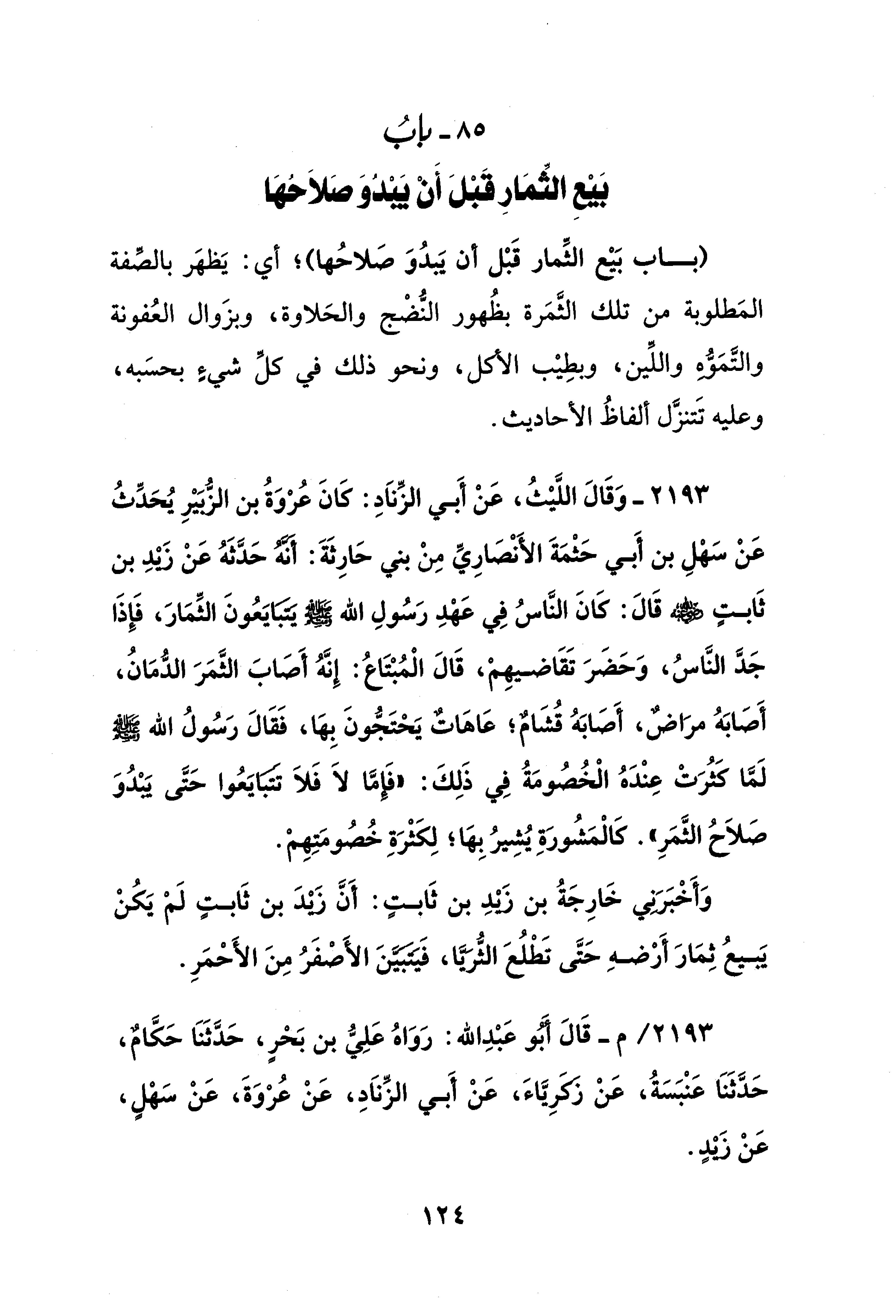 2193 - وَقَالَ اللَّيْثُ، عَنْ أَبي الزِّناَدِ: كَانَ عُرْوَةُ بن الزُّبَيْرِ يُحَدِّثُ عَنْ سَهْلِ بن أَبي حَثْمَةَ الأَنْصَارِيِّ مِنْ بني حَارِثَةَ: أَنَّهُ حَدَّثَهُ عَنْ زيدِ بن ثَابتٍ - رضي الله عنه - قَالَ: كَانَ النَّاسُ في عَهْدِ رَسُولِ الله - صلى الله عليه وسلم - يَتَبَايَعُونَ الثِّمَارَ، فَإذَا جَدَّ النَّاسُ، وَحَضَرَ تَقَاضيهِمْ، قَالَ الْمُبْتَاعُ: إِنَّهُ أَصَابَ الثَّمَرَ الدُّمَانُ، أَصَابَهُ مرَاضٌ، أَصَابَهُ قُشَامٌ؛ عَاهَاتٌ يَحْتَجُّونَ بِهَا، فَقَالَ رَسُولُ الله - صلى الله عليه وسلم - لَمَّا كثُرَتْ عِنْدَهُ الْخُصُومَةُ في ذَلِكَ: "فَإِمَّا لاَ فَلاَ تَتَبَايَعُوا حَتَّى يَبْدُوَ صَلاَحُ الثَّمَرِ". كَالْمَشُورَةِ يُشِيرُ بِهَا؛ لِكثْرَةِ خُصُومَتِهِمْ.