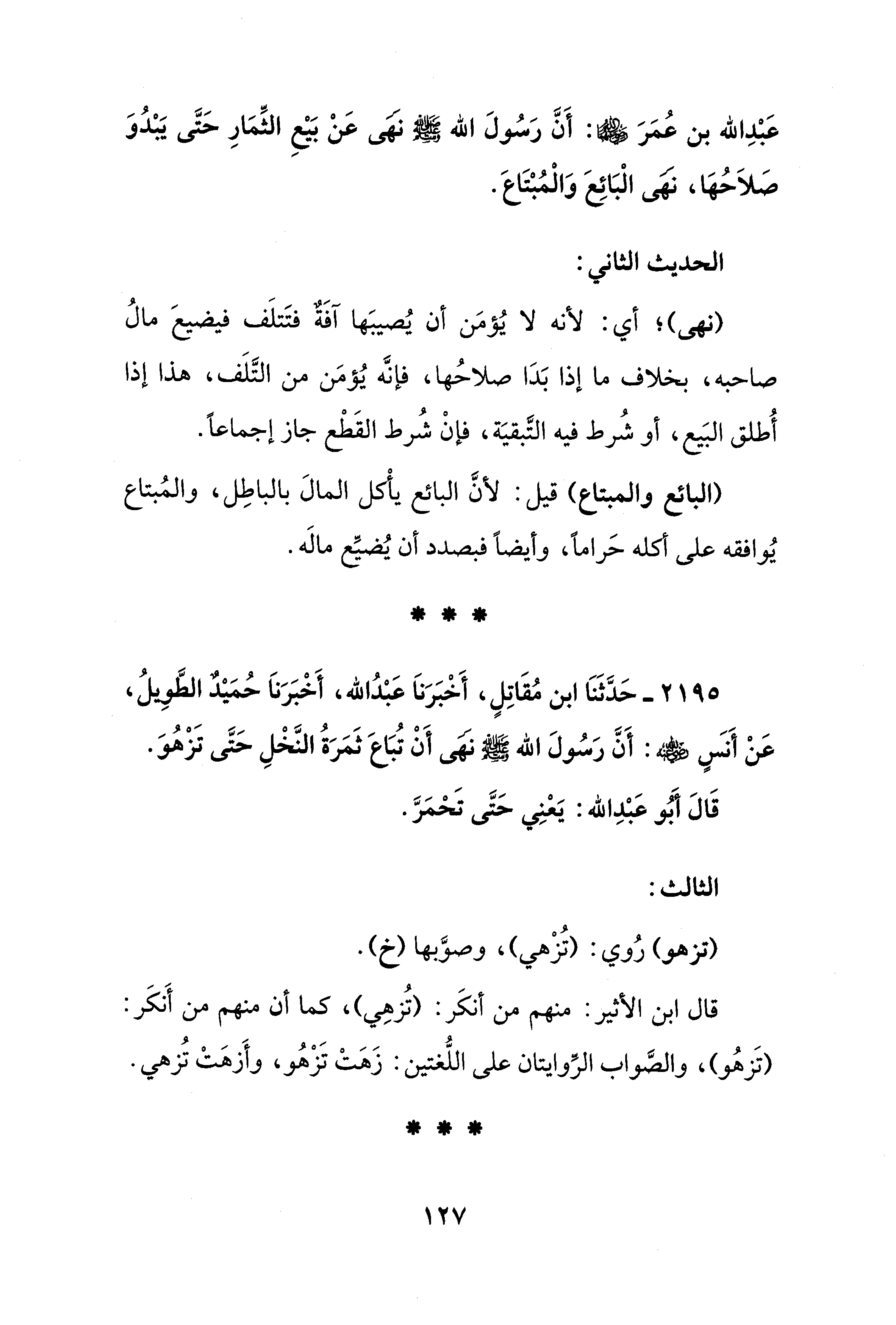 2195 - حَدَّثَنَا ابن مُقَاتِلٍ، أَخْبَرَناَ عَبْدُ الله، أَخْبَرَناَ حُمَيْدٌ الطَّوِيلُ، عَنْ أَنَسٍ - رضي الله عنه -: أَنَّ رَسُولَ الله - صلى الله عليه وسلم - نَهَى أَنْ تُبَاعَ ثَمَرَةُ النَّخْلِ حَتَّى تَزْهُوَ.