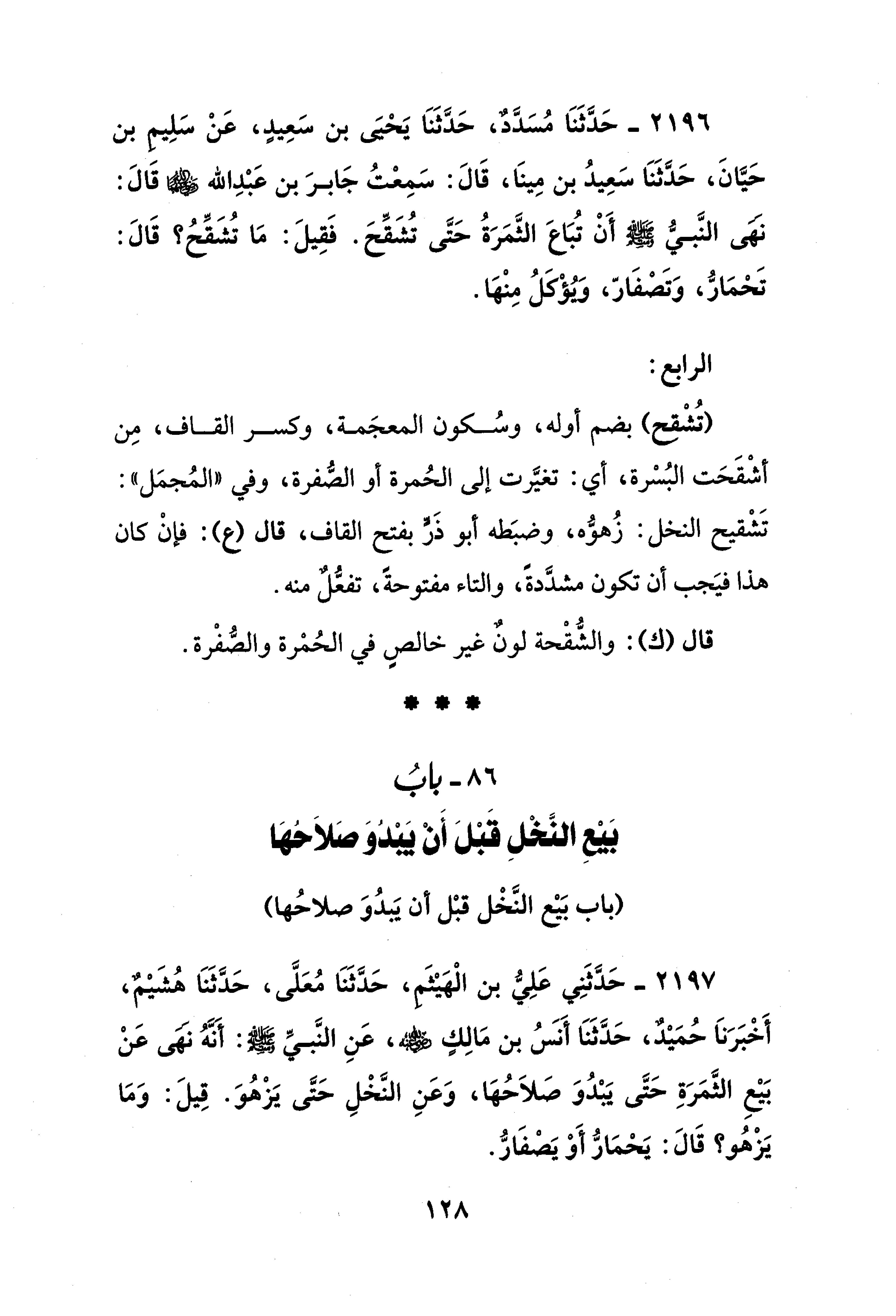 2196 - حَدَّثَنَا مُسَدَّدٌ، حَدَّثَنَا يَحْيَى بن سَعِيدٍ، عَنْ سَلِيمِ بن حَيَّانَ، حَدَّثَنَا سَعِيدُ بن مِينَا، قَالَ: سَمِعْتُ جَابرَ بن عَبْدِ الله - رضي الله عنهما - قَالَ: نَهَى النَّبيُّ - صلى الله عليه وسلم - أَنْ تُبَاعَ الثَّمَرَةُ حَتَّى تُشَقِّحَ. فَقِيلَ: مَا تُشَقِّحُ؟ قَالَ: تَحْمَارُّ، وَتَصْفَارّ، ويُؤْكَلُ مِنْهَا.