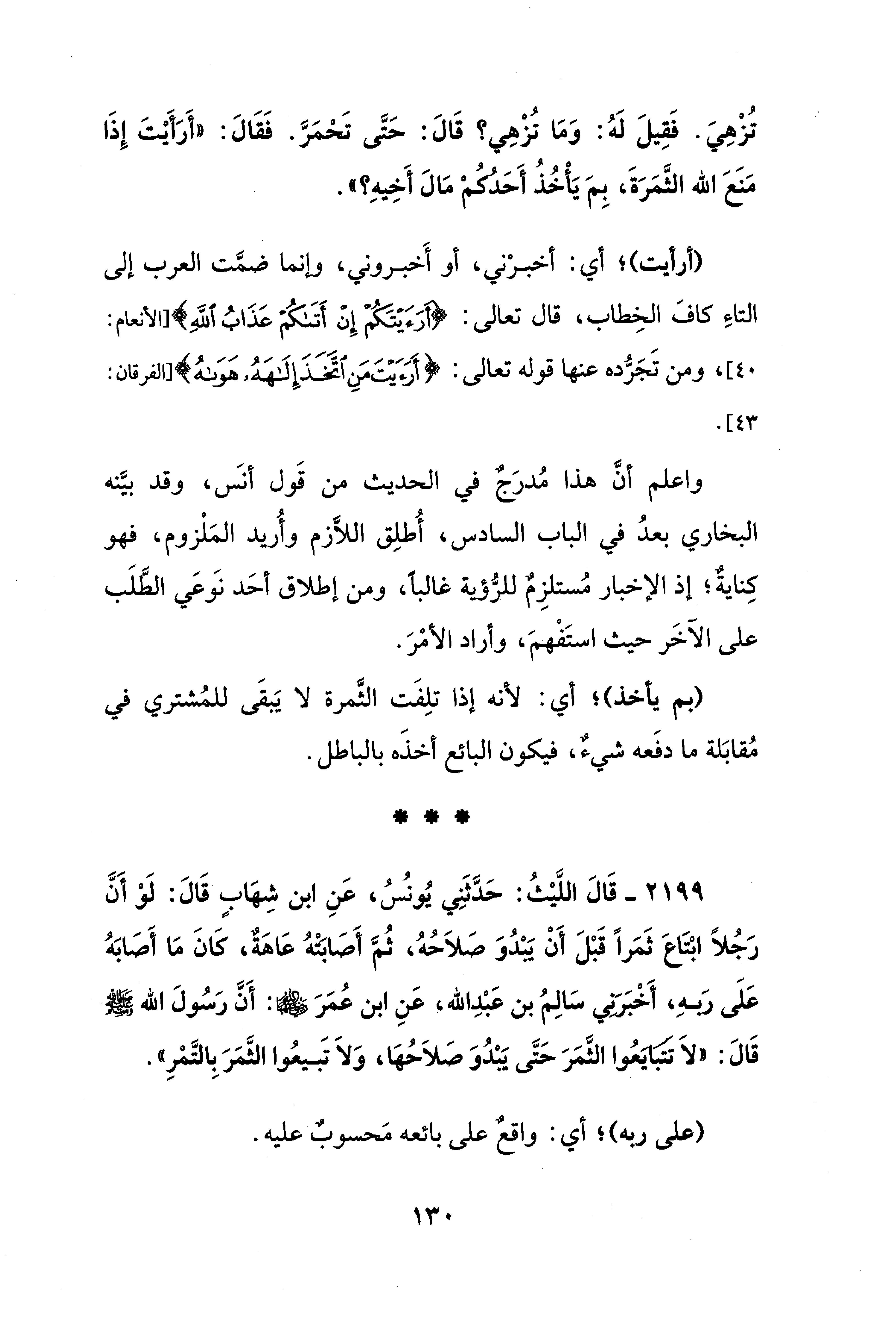 2199 - قَالَ اللَّيْثُ: حَدَّثَنِي يُونُسُ، عَنِ ابن شِهَابٍ قَالَ: لَوْ أَنَّ رَجُلًا ابْتَاعَ ثَمَرًا قَبْلَ أَنْ يَبْدُوَ صَلاَحُهُ، ثُمَّ أَصَابَتْهُ عَاهَةٌ، كَانَ مَا أَصَابَهُ عَلَى رَبهِ، أَخْبَرَنِي سَالِمُ بن عَبْدِ الله، عَنِ ابن عُمَرَ - رضي الله عنهما -: أَنَّ رَسُولَ الله - صلى الله عليه وسلم - قَالَ: "لاَ تتبايَعُوا الثَّمَرَ حَتَّى يَبْدُوَ صَلاَحُهَا، وَلاَ تَبيعُوا الثَّمَرَ بِالتَّمْرِ".
