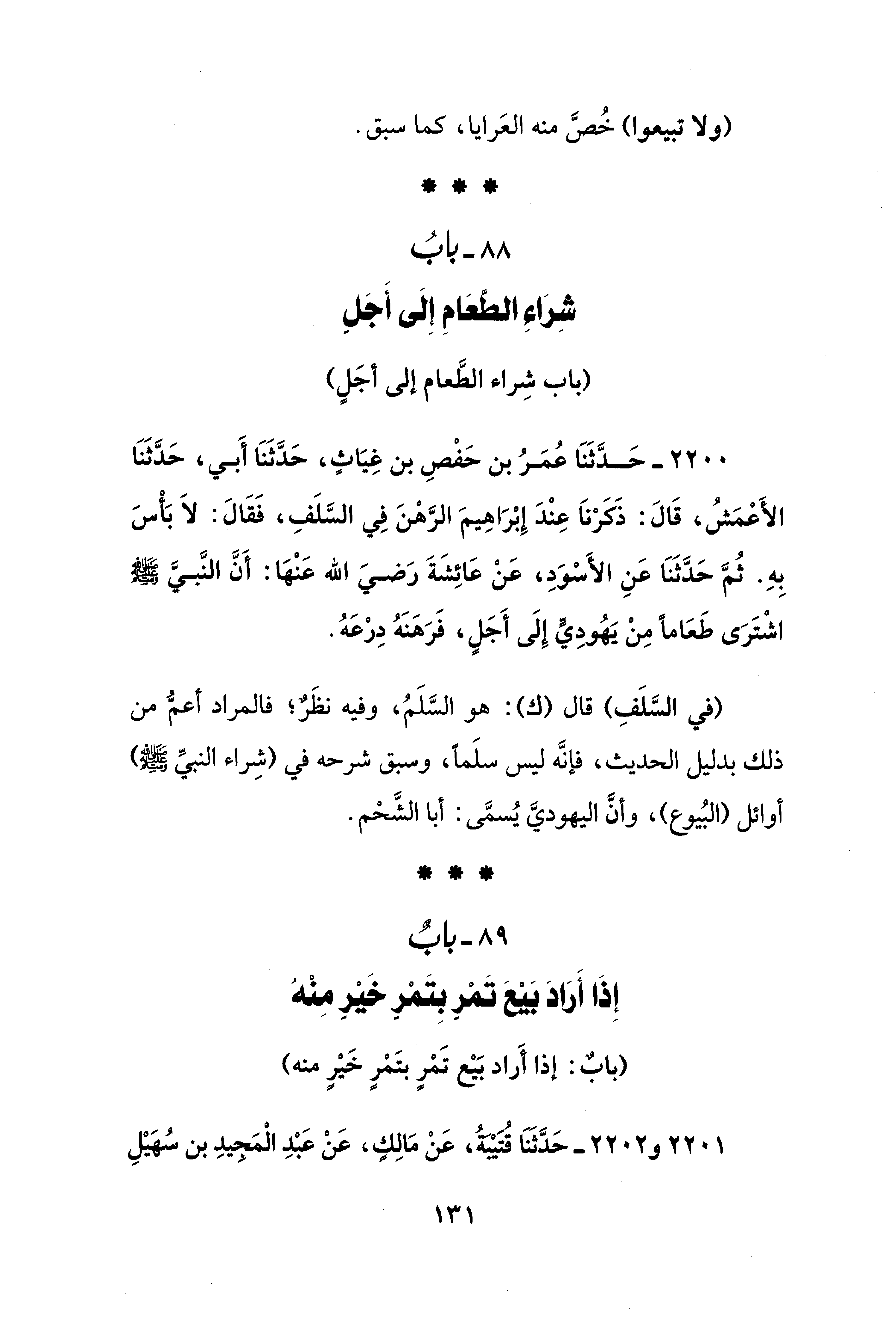 2200 - حَدَّثَنَا عُمَرُ بن حَفْصِ بن غِيَاثٍ، حَدَّثَنَا أَبي، حَدَّثَنَا الأَعْمَشُ، قَالَ: ذَكَرْناَ عِنْدَ إِبْرَاهِيمَ الرَّهْنَ في السَّلَفِ، فَقَالَ: لاَ بَأْسَ بِهِ. ثُمَّ حَدَّثَنَا عَنِ الأَسْوَدِ، عَنْ عَائِشَةَ رَضيَ الله عَنْهَا: أَنَّ النَّبيَّ - صلى الله عليه وسلم - اشْتَرَى طَعَامًا مِنْ يَهُودِيٍّ إِلَى أَجَلٍ، فَرَهَنَهُ دِرْعَهُ.
