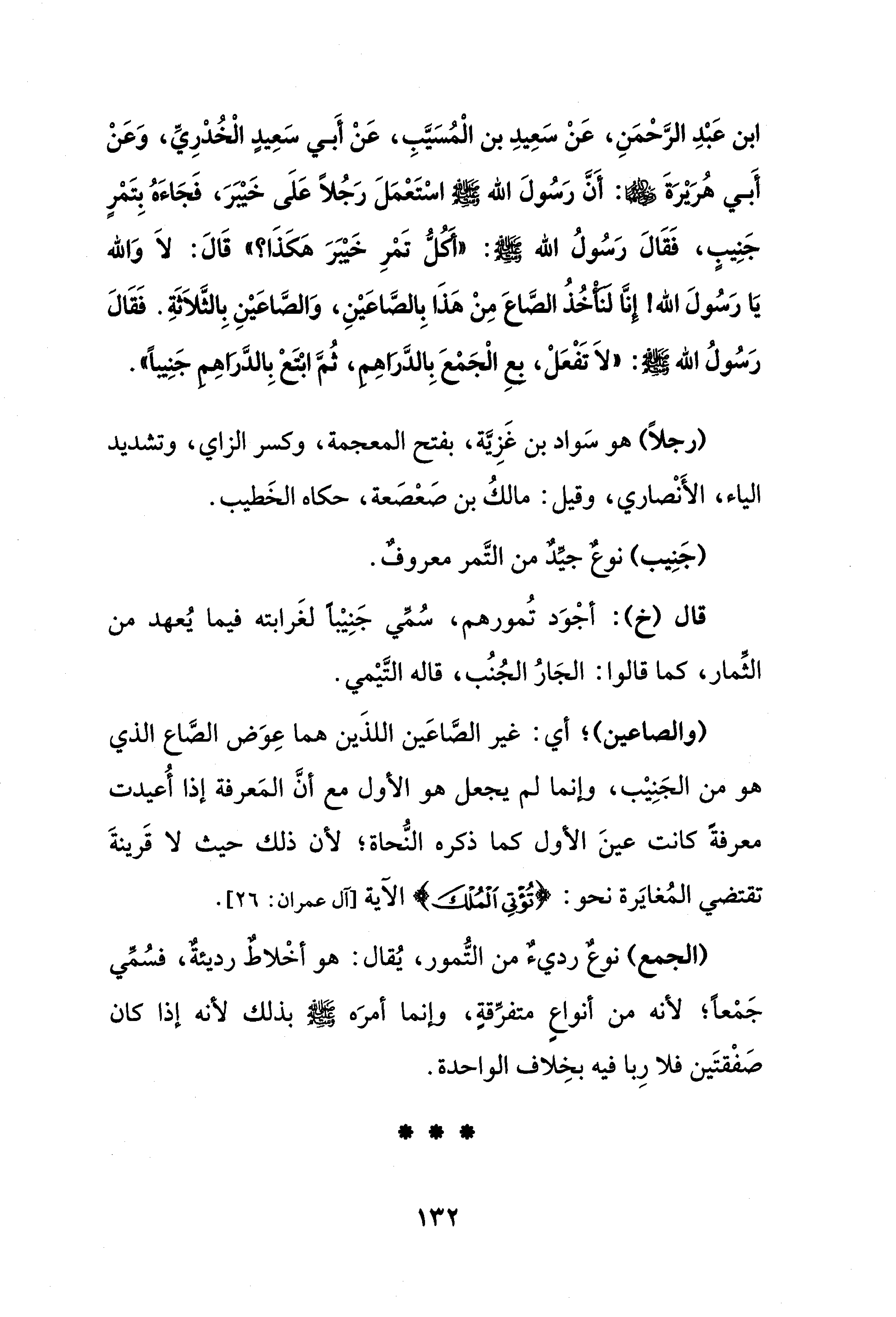 ابن عَبْدِ الرَّحْمَنِ، عَنْ سَعِيدِ بن الْمُسَيَّبِ، عَنْ أَبي سَعِيدٍ الْخُدْرِيِّ، وَعَنْ أَبي هُرَيْرَةَ: أَنَّ رَسُولَ الله - صلى الله عليه وسلم - اسْتَعْمَلَ رَجُلًا عَلَى خَيْبَرَ، فَجَاءَهُ بِتَمْرٍ جَنِيبٍ، فَقَالَ رَسُولُ الله - صلى الله عليه وسلم -: "أَكُلُّ تَمْرِ خَيْبَرَ هَكَذَا؟ " قَالَ: لاَ وَالله يَا رَسُولَ الله! إِنَّا لَنَأْخُذُ الصَّاعَ مِنْ هَذَا بِالصَّاعَيْنِ، وَالصَّاعَيْنِ بِالثَّلاَثَةِ. فَقَالَ رَسُولُ الله - صلى الله عليه وسلم -: "لاَ تَفْعَلْ، بعِ الْجَمْعَ بِالدَّرَاهِمِ، ثُمَّ ابْتَعْ بِالدَّرَاهِمِ جَنِيبًا".
