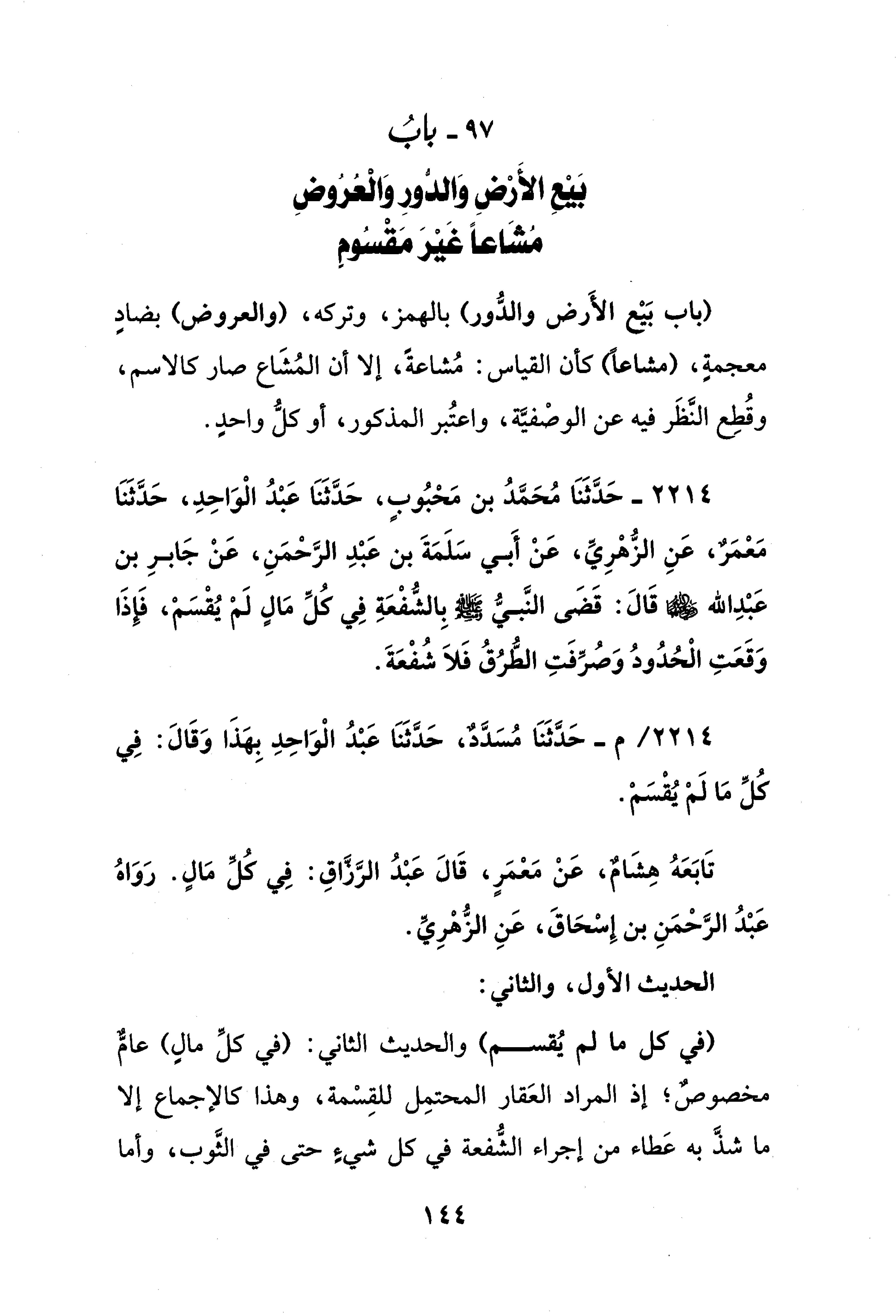 97 - بابُ بَيْعِ الأَرْضِ وَالدُّورِ وَالْعُرُوضِ مُشَاعًا غَيْرَ مَقسُومٍ