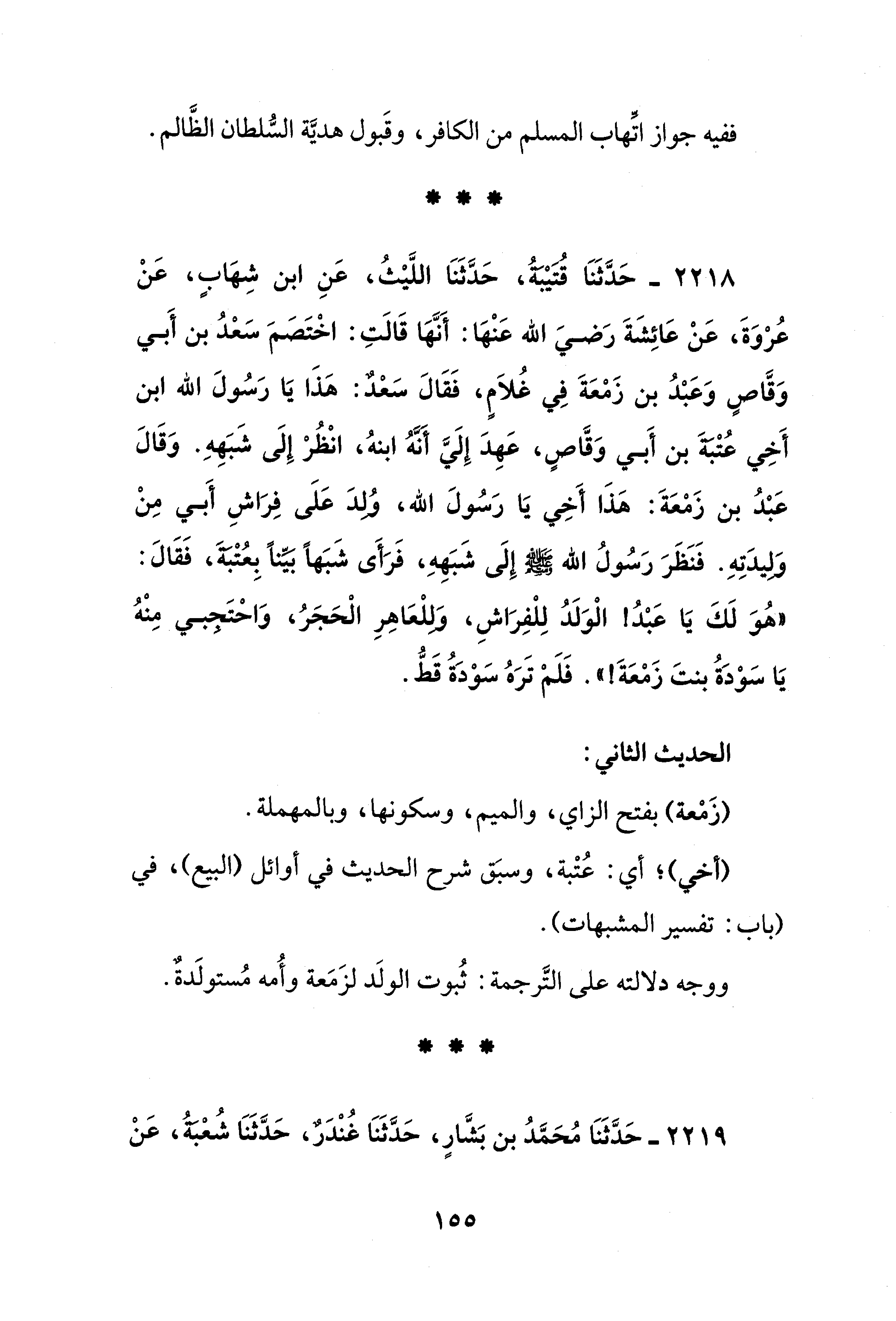 2218 - حَدَّثَنَا قُتَيْبَةُ، حَدَّثَنَا اللَّيْثُ، عَنِ ابن شِهَابٍ، عَنْ عُرْوَةَ، عَنْ عَائِشَةَ رَضيَ الله عَنْهَا: أَنَّهَا قَالَتِ: اخْتَصَمَ سَعْدُ بن أَبي وَقَّاصٍ وَعَبْدُ بن زَمْعَةَ في غُلاَمٍ، فَقَالَ سَعْدٌ: هَذَا يَا رَسُولَ الله ابن أَخِي عُتْبَةَ بن أَبي وَقَّاصٍ، عَهِدَ إِلَيَّ أنَّهُ ابنهُ، انْظُرْ إِلَى شَبَهِهِ. وَقَالَ عَبْدُ بن زَمْعَةَ: هَذَا أَخِي يَا رَسُولَ الله، وُلِدَ عَلَى فِرَاشِ أَبي مِنْ وَلِيدَتِهِ. فَنَظَرَ رَسُولُ الله - صلى الله عليه وسلم - إِلَى شَبَهِهِ، فَرَأَى شَبَهًا بَيِّنًا بِعُتْبَةَ، فَقَالَ: "هُوَ لَكَ يَا عَبْدُ! الْوَلَدُ لِلْفِرَاشِ، وَلِلْعَاهِرِ الْحَجَرُ، وَاحْتَجِبي مِنْهُ يَا سَوْدَةُ بنتَ زَمْعَةَ! ". فَلَمْ تَرَهُ سَوْدَةُ قَطُّ.