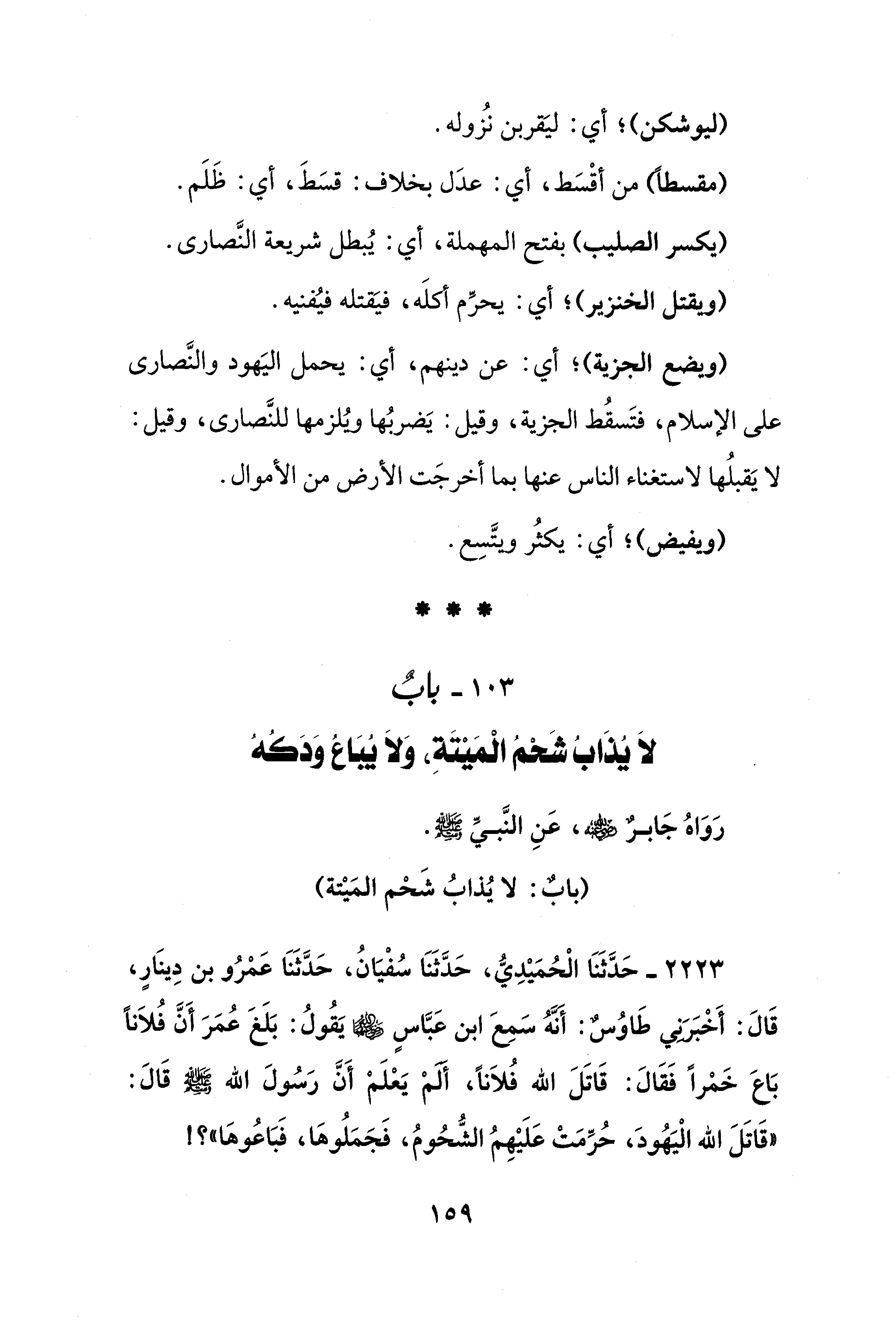 103 - بابٌ لاَ يُذَابُ شَحْمُ الْمَيْتَةِ، وَلاَ يُبَاعُ وَدَكُهُ