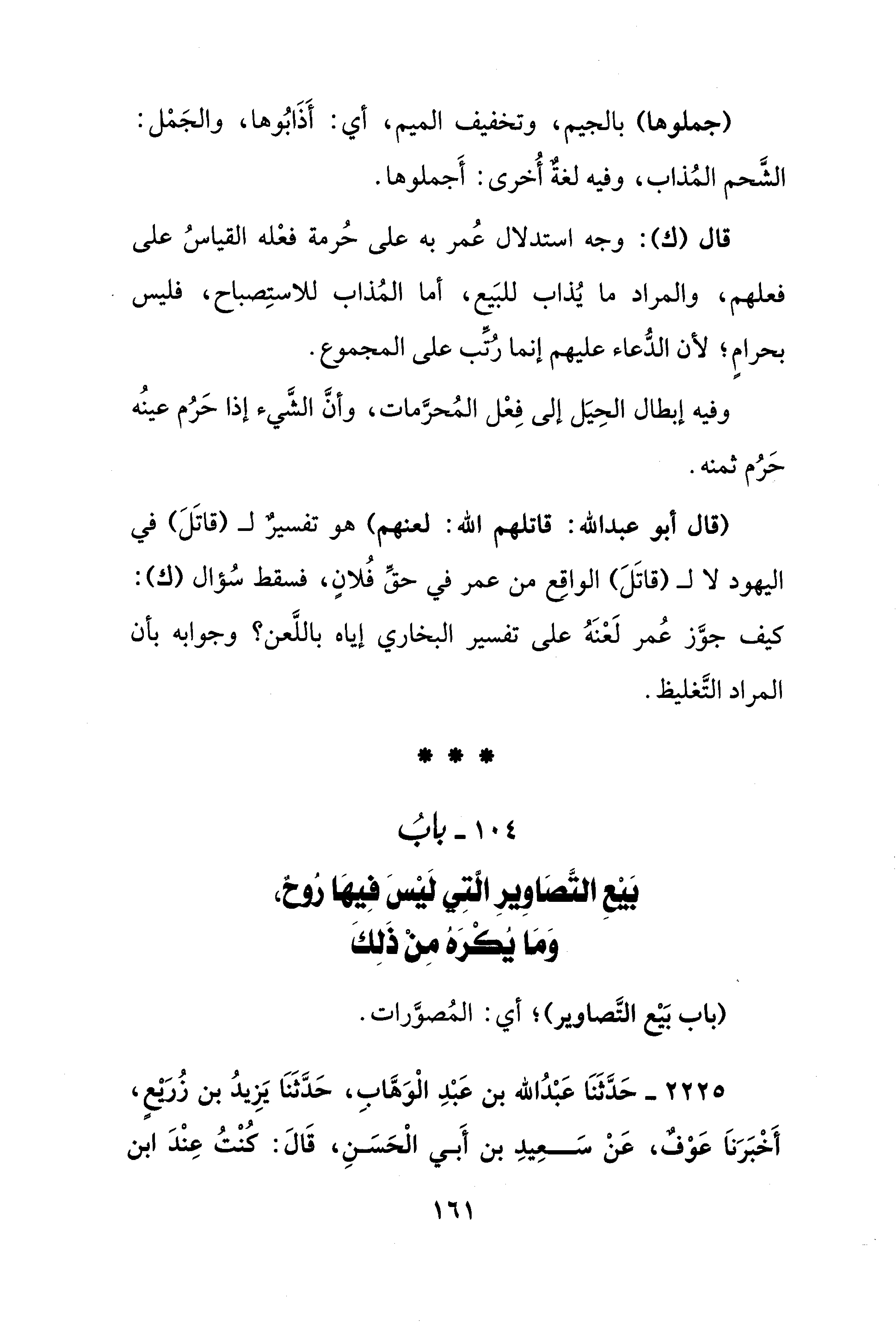 قال (ك): وجه استدلال عُمر به على حُرمة فعْله القياسُ على فعلهم، والمراد ما يُذاب للبَيع، أما المُذاب للاستِصباح، فليس بحرامٍ؛ لأن الدُّعاء عليهم إنما رُتِّب على المجموع.