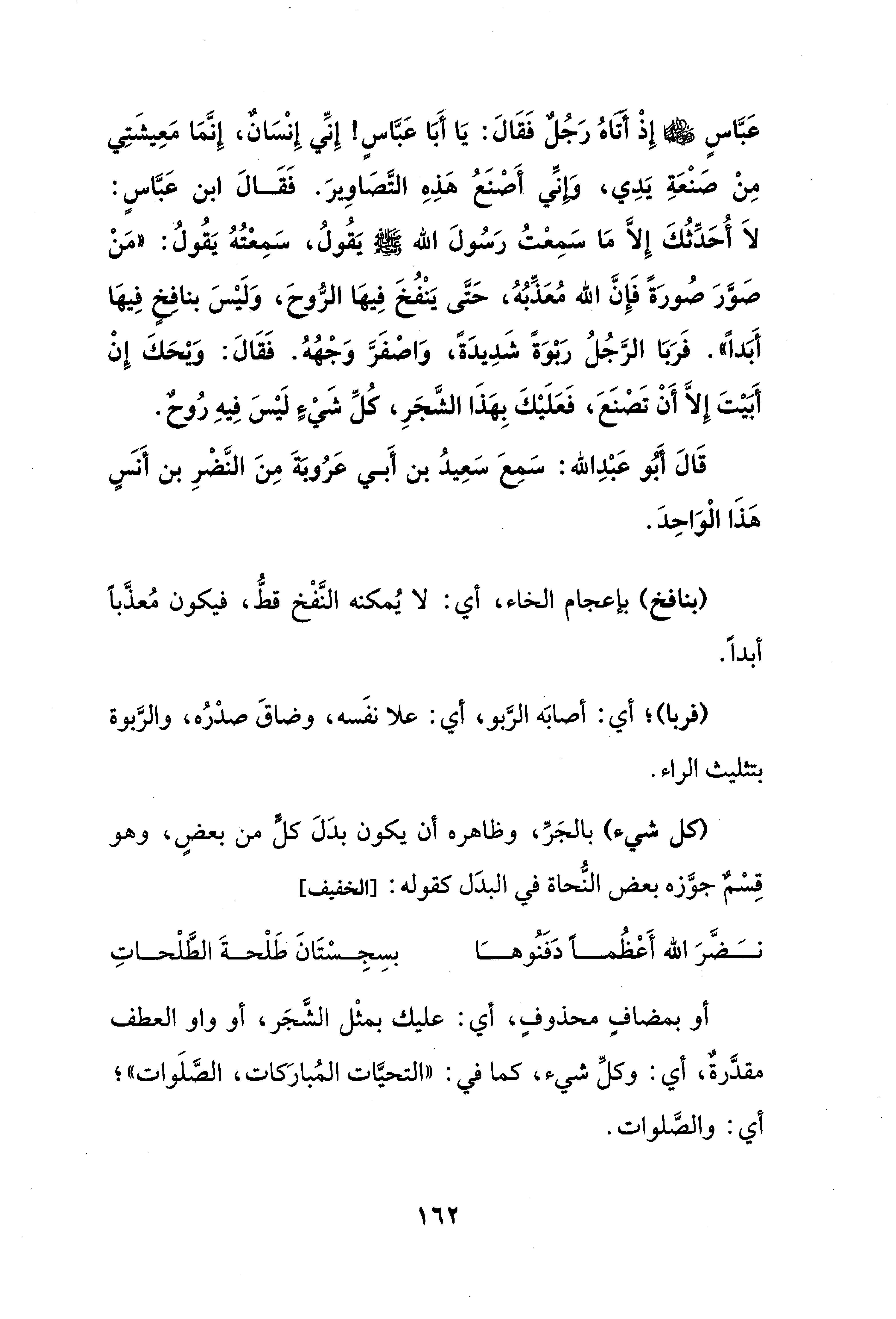 عَبَّاسٍ - رضي الله عنهما - إِذْ أتاهُ رَجُلٌ فَقَالَ: يَا أَبَا عَبَّاسٍ! إِنِّي إِنْسَانٌ، إِنَّمَا مَعِيشَتِي مِنْ صَنْعَةِ يَدِي، وإِنِّي أَصْنَعُ هَذِهِ التَّصَاوِيرَ. فَقَالَ ابن عَبَّاسٍ: لاَ أُحَدِّثُكَ إِلَّا مَا سَمِعْتُ رَسُولَ الله - صلى الله عليه وسلم - يَقُولُ، سَمِعْتُهُ يَقُولُ: "مَنْ صَوَّرَ صُورَةً فَإنَّ الله مُعَذِّبُهُ، حَتَّى يَنْفُخَ فِيهَا الرُّوحَ، وَلَيْسَ بنافِخٍ فِيهَا أَبَدًا". فَرَبَا الرَّجُلُ رَبْوَةً شَدِيدَةً، وَاصْفَرَّ وَجْهُهُ. فَقَالَ: وَيْحَكَ إِنْ أَبَيْتَ إِلَّا أَنْ تَصْنَعَ، فَعَلَيْكَ بِهَذَا الشَّجَرِ، كُلِّ شَيْء لَيْسَ فِيهِ رُوحٌ.