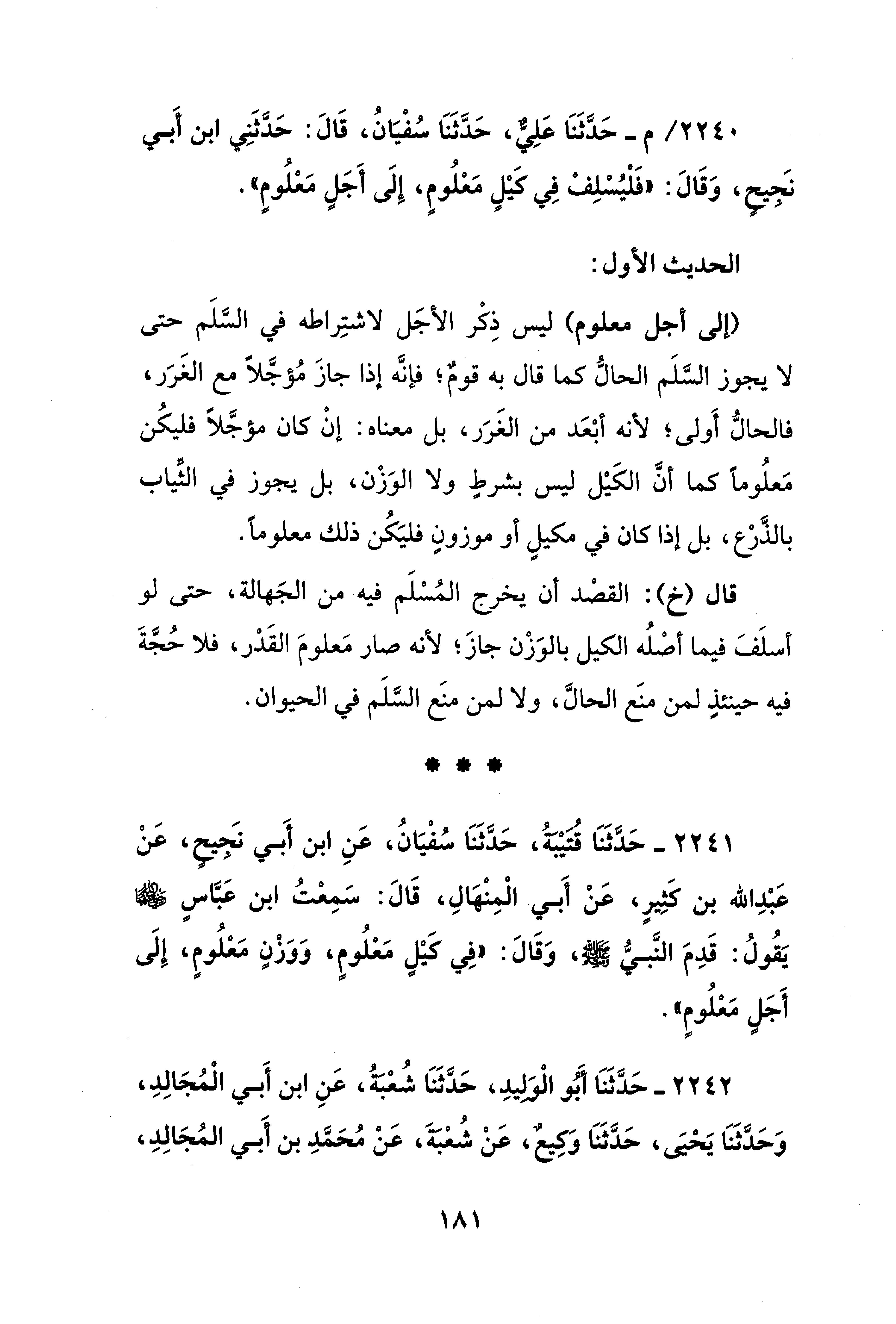 2241 - حَدَّثَنَا قُتَيْبَةُ، حَدَّثَنَا سُفْيَانُ، عنِ ابن أَبي نَجيحٍ، عَنْ عَبْدِ الله بن كَثِيرٍ، عَنْ أَبي الْمِنْهَالِ، قالَ: سَمِعْتُ ابن عَبَّاسٍ - رضي الله عنهما - يَقُولُ: قَدِمَ النَّبيُّ - صلى الله عليه وسلم -، وَقالَ: "في كَيْلٍ مَعْلُومٍ، وَوَزْنٍ مَعْلُومٍ، إِلَى أَجَلٍ مَعْلُومٍ".