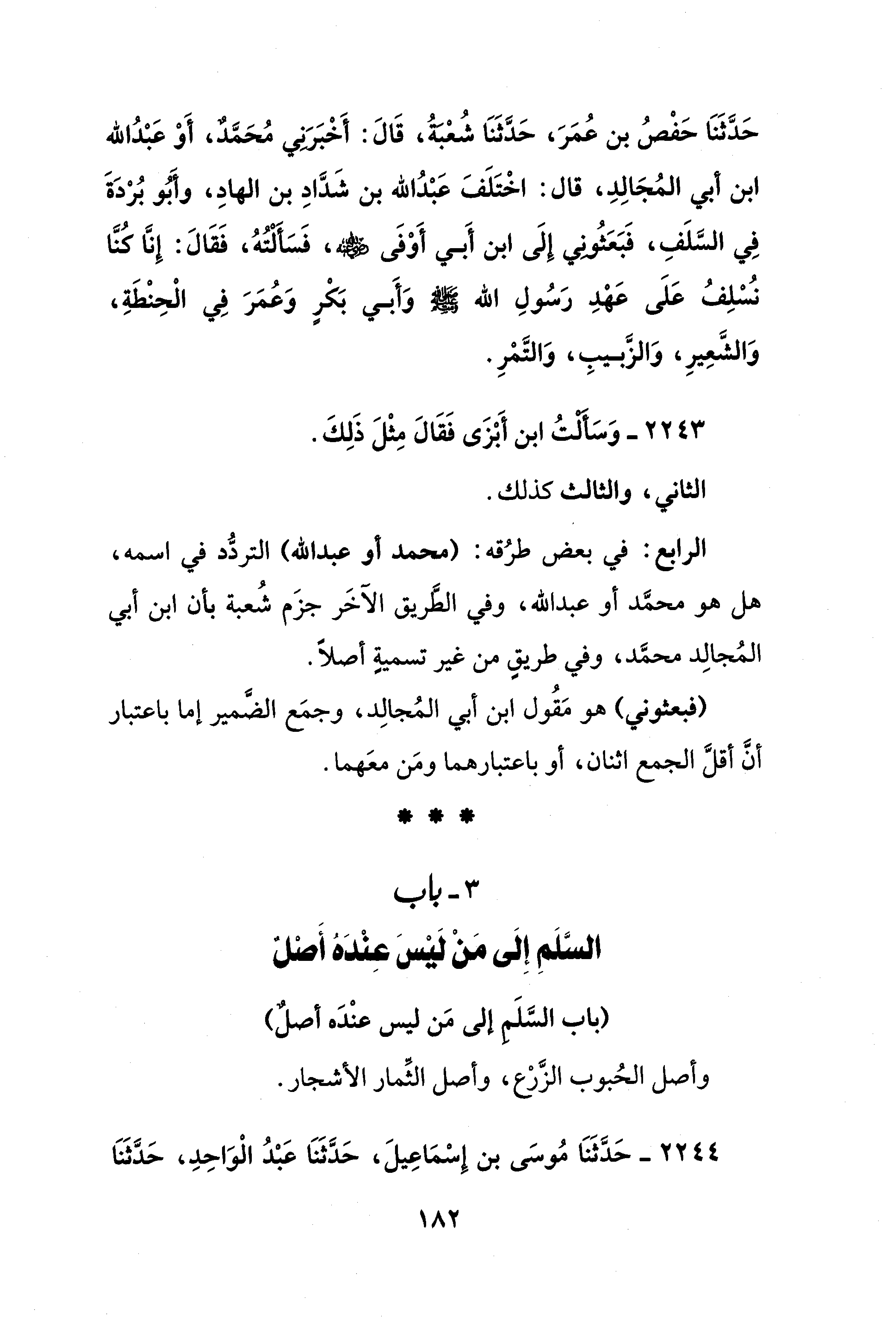 حَدَّثَنَا حَفْصُ بن عُمَرَ، حَدَّثَنَا شُعْبَةُ، قَالَ: أَخْبَرَنِي مُحَمَّدٌ، أَوْ عَبْدُ الله ابن أبي المُجَالِدِ، قال: اخْتَلَفَ عَبْدُ الله بن شَدَّادِ بن الهادِ، وأَبُو بُرْدَةَ فِي السَّلَفِ، فَبَعَثُونِي إِلَى ابن أَبي أَوْفَى - رضي الله عنه -، فَسَاَلْتُهُ، فَقَالَ: إِنَّا كُنَّا نُسْلِفُ عَلَى عَهْدِ رَسُولِ الله - صلى الله عليه وسلم - وَأَبي بَكْرٍ وَعُمَرَ في الْحِنْطَةِ، وَالشَّعِيرِ، وَالزَّبيبِ، وَالتَّمْرِ.
