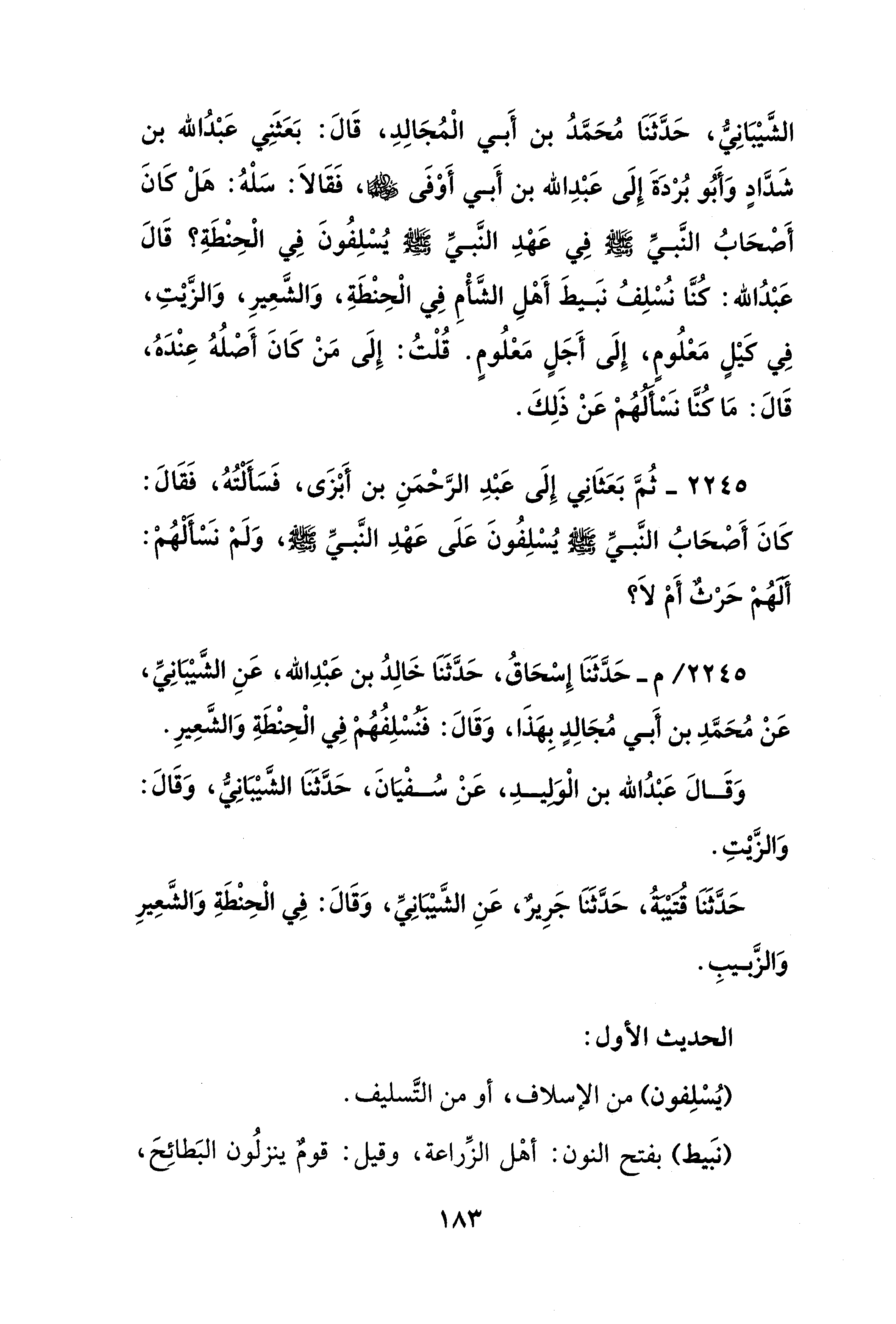 2245 / -م - حَدَّثَنَا إِسْحَاقُ، حَدَّثَنَا خَالِدُ بن عَبْدِ الله، عَنِ الشَّيْبَانِيِّ، عَنْ مُحَمَّدِ بن أَبي مُجَالِدٍ بِهَذَا، وَقَالَ: فَنُسْلِفُهُمْ في الْحِنْطَةِ وَالشَّعِيرِ.
