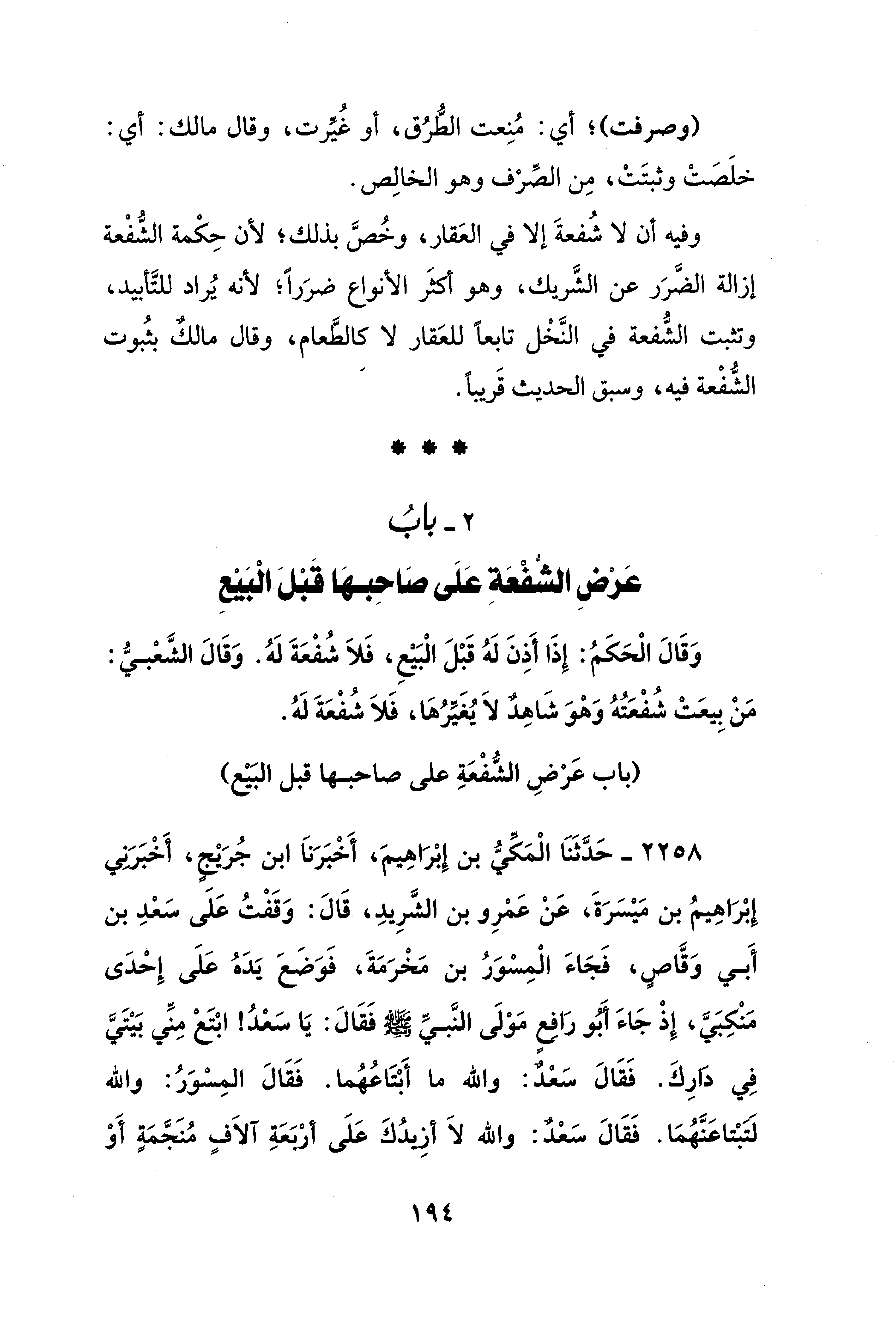 وفيه أن لا شُفعةَ إلا في العَقار، وخُصَّ بذلك؛ لأن حِكْمة الشُّفْعة إزالة الضَّرَر عن الشَّريك، وهو أكثَر الأنواع ضرَرًا؛ لأنه يُراد للتَّأبيد، وتثبت الشُّفعة في النَّخْل تابعًا للعَقار لا كالطَّعام، وقال مالكٌ بثُبوت الشُّفْعة فيه، وسبق الحديث قَريبًا.
