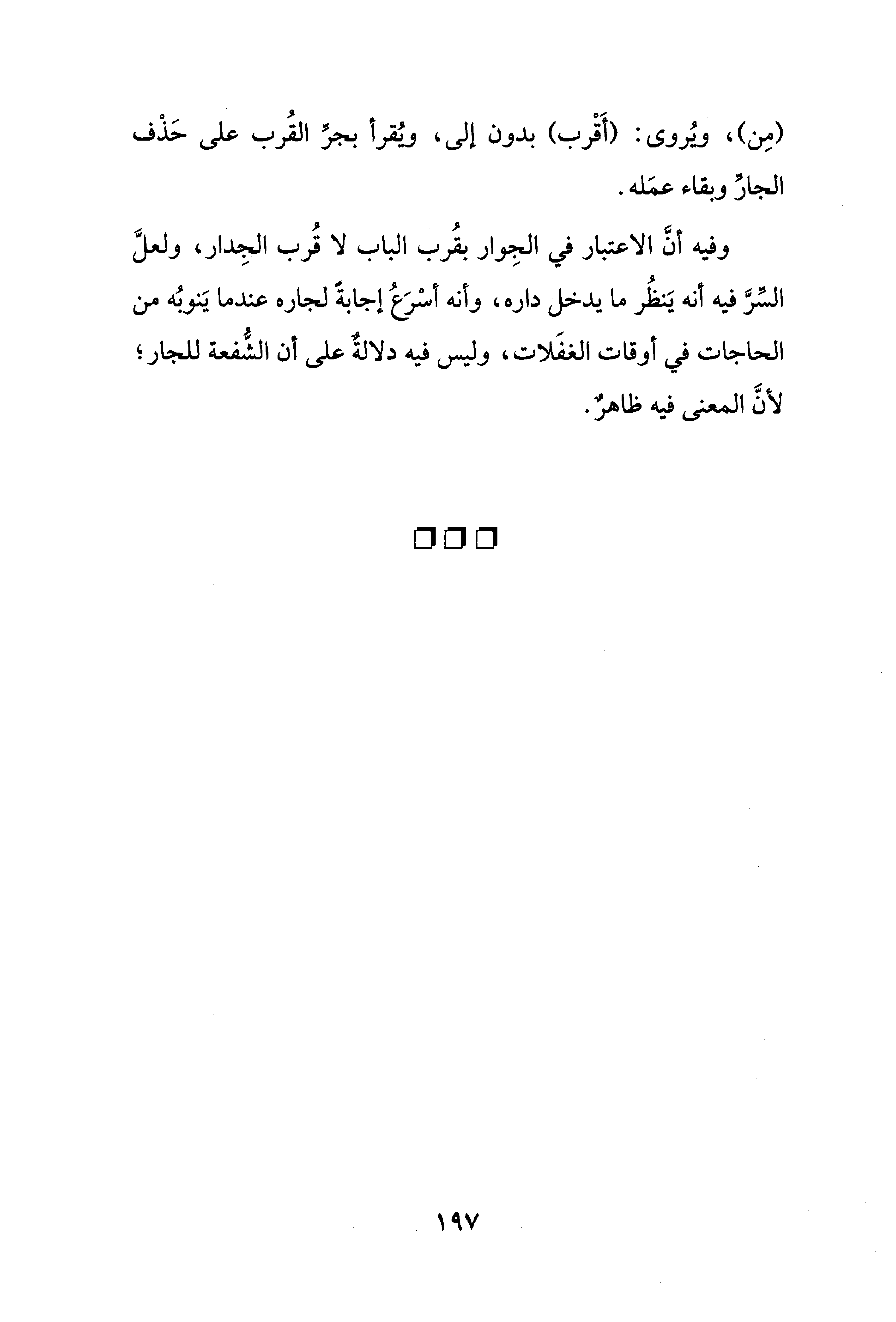 وفيه أنَّ الاعتبار في الجِوار بقُرب الباب لا قُرب الجِدار، ولعلَّ السِّرَّ فيه أنه يَنظُر ما يدخل داره، وأنه أسْرَعُ إجابةً لجاره عندما يَنوبُه من الحاجات في أوقات الغفَلات، وليس فيه دلالةٌ على أن الشُّفعة للجار؛ لأنَّ المعنى فيه ظاهرٌ.