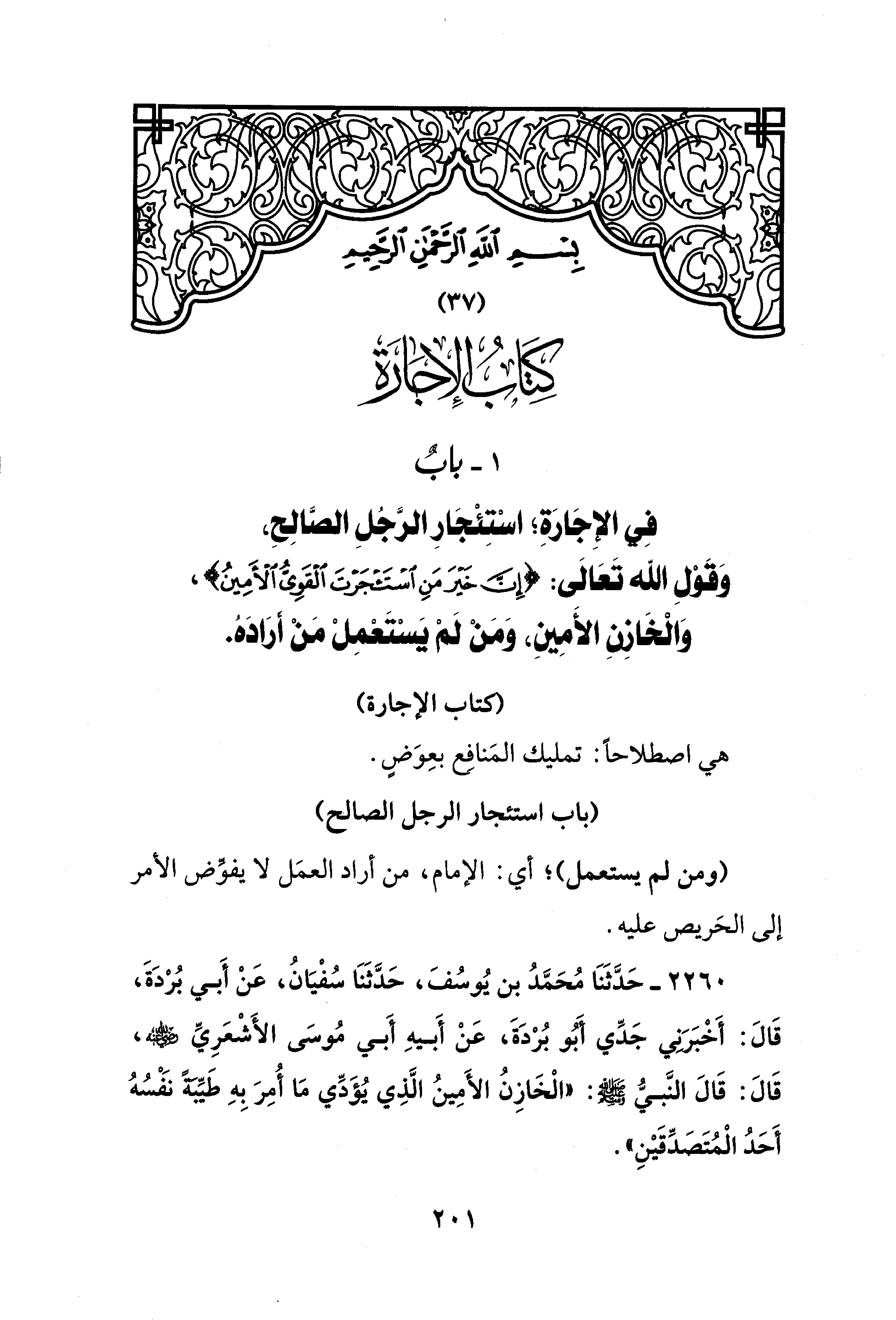 1 - بابٌ فِي الإِجَارَةِ؛ اسْتِئْجَارِ الرَّجُلِ الصَّالِحِ، وَقَوْلِ الله تَعَالَى: {إِنَّ خَيْرَ مَنِ اسْتَأْجَرْتَ الْقَوِيُّ الْأَمِينُ} وَالْخَازِنِ الأَمِينِ، وَمَنْ لَمْ يَسْتَعْمِلْ مَنْ أرَادَهُ.
