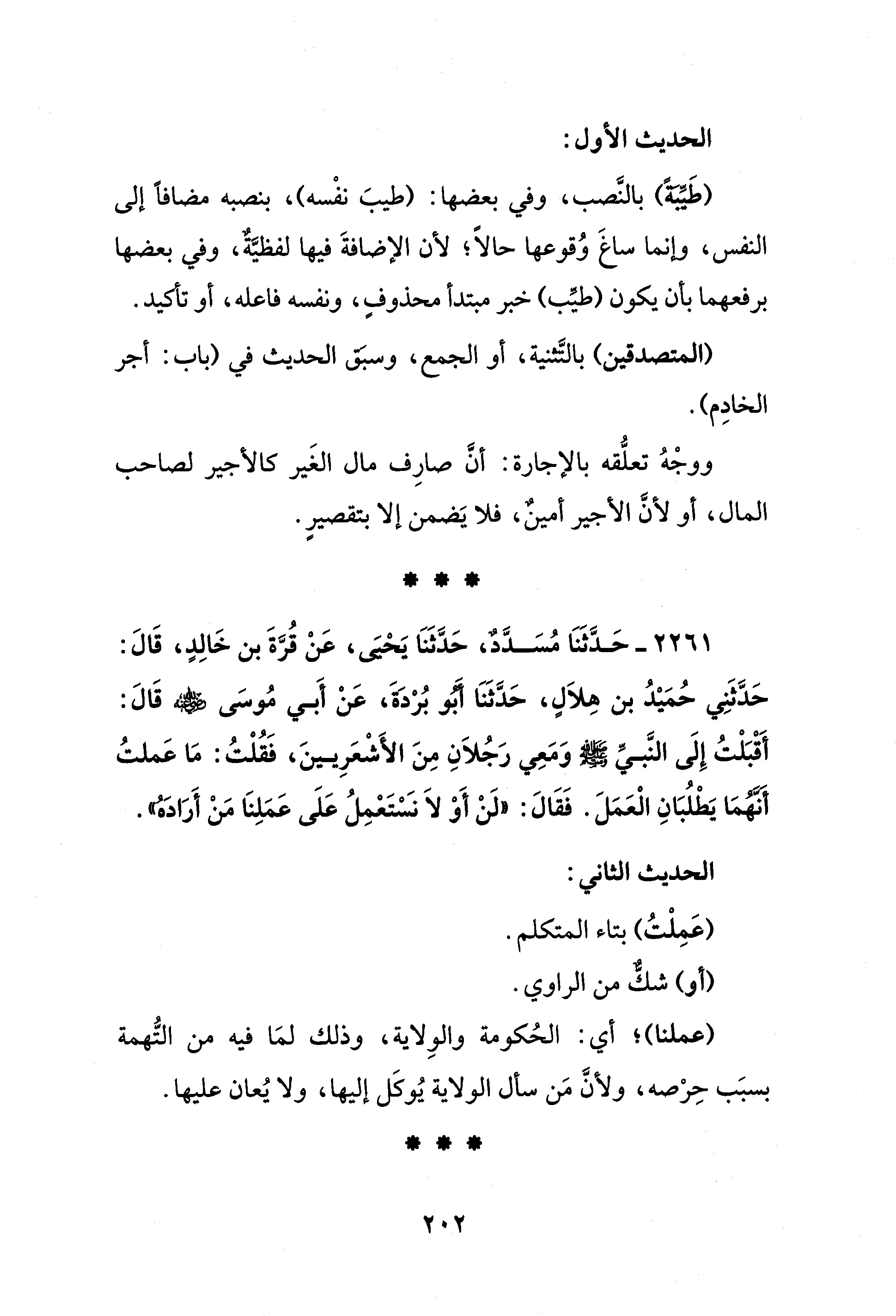 2261 - حَدَّثَنَا مُسَدَّدٌ، حَدَّثَنَا يَحْيَى، عَنْ قُرَّةَ بن خَالِدٍ، قَالَ: حَدَّثَنِي حُمَيْدُ بن هِلاَلٍ، حَدَّثَنَا أَبُو بُرْدَةَ، عَنْ أَبي مُوسَى - رضي الله عنه - قَالَ: أَقْبَلْتُ إِلَى النَّبيِّ - صلى الله عليه وسلم - وَمَعِي رَجُلاَنِ مِنَ الأَشْعَرِيينَ، فَقُلْتُ: مَا عَملتُ أَنَّهُمَا يَطْلُبَانِ الْعَمَلَ. فَقَالَ: "لَنْ أَوْ لاَ نستَعْمِلُ عَلَى عَمَلِنَا مَنْ أَرَادَهُ".