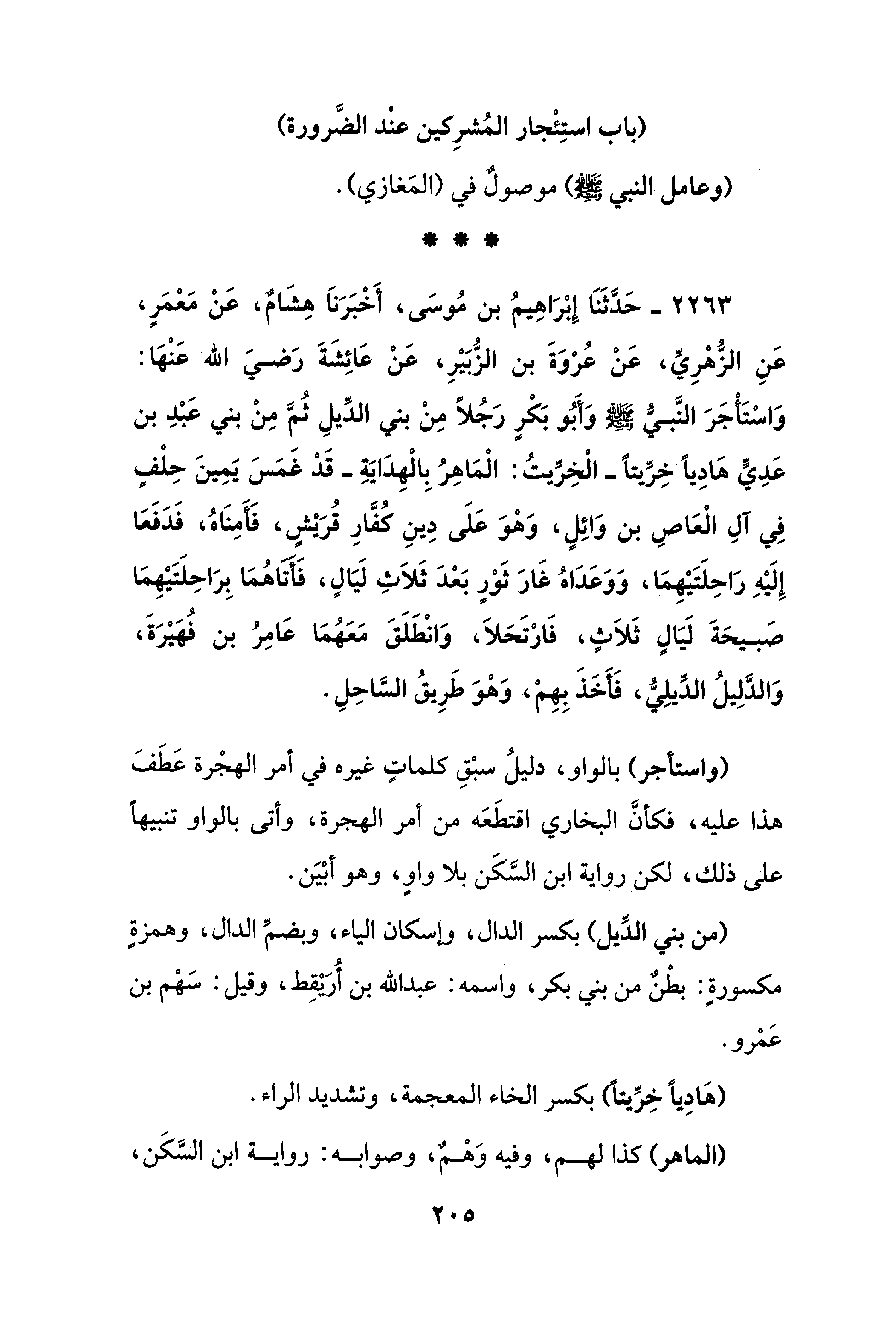 2263 - حَدَّثَنَا إِبْرَاهِيمُ بن مُوسَى، أَخْبَرَناَ هِشَامٌ، عَنْ مَعْمَرٍ، عَنِ الزُّهْرِيِّ، عَنْ عُرْوَةَ بن الزُّبَيْرِ، عَنْ عَائِشَةَ رَضيَ الله عَنْهَا: وَاسْتَأْجَرَ النَّبيُّ - صلى الله عليه وسلم - وَأَبُو بَكْرٍ رَجُلًا مِنْ بني الدِّيلِ ثُمَّ مِنْ بني عَبْدِ بن عَدِيٍّ هَادِيًا خِرِّيتًا -الْخِرِّيتُ: الْمَاهِرُ بِالْهِدَايَةِ- قَدْ غَمَسَ يَمِينَ حِلْفٍ فِي آلِ الْعَاصِ بن وَائِلٍ، وَهْوَ عَلَى دِينِ كُفَّارِ قُرَيْشٍ، فَأَمِنَاهُ، فَدَفَعَا إِلَيْهِ رَاحِلَتَيْهِمَا، وَوَعَدَاهُ غَارَ ثَوْرٍ بَعْدَ ثَلاَثِ لَيَالٍ، فَأَتَاهُمَا بِرَاحِلَتَيْهِمَا صَبيحَةَ لَيَالٍ ثَلاَثٍ، فَارْتَحَلاَ، وَانْطَلَقَ مَعَهُمَا عَامِرُ بن فُهَيْرَةَ، وَالدَّلِيلُ الدِّيلِيُّ، فَأَخَذَ بِهِمْ، وَهْوَ طَرِيقُ السَّاحِلِ.