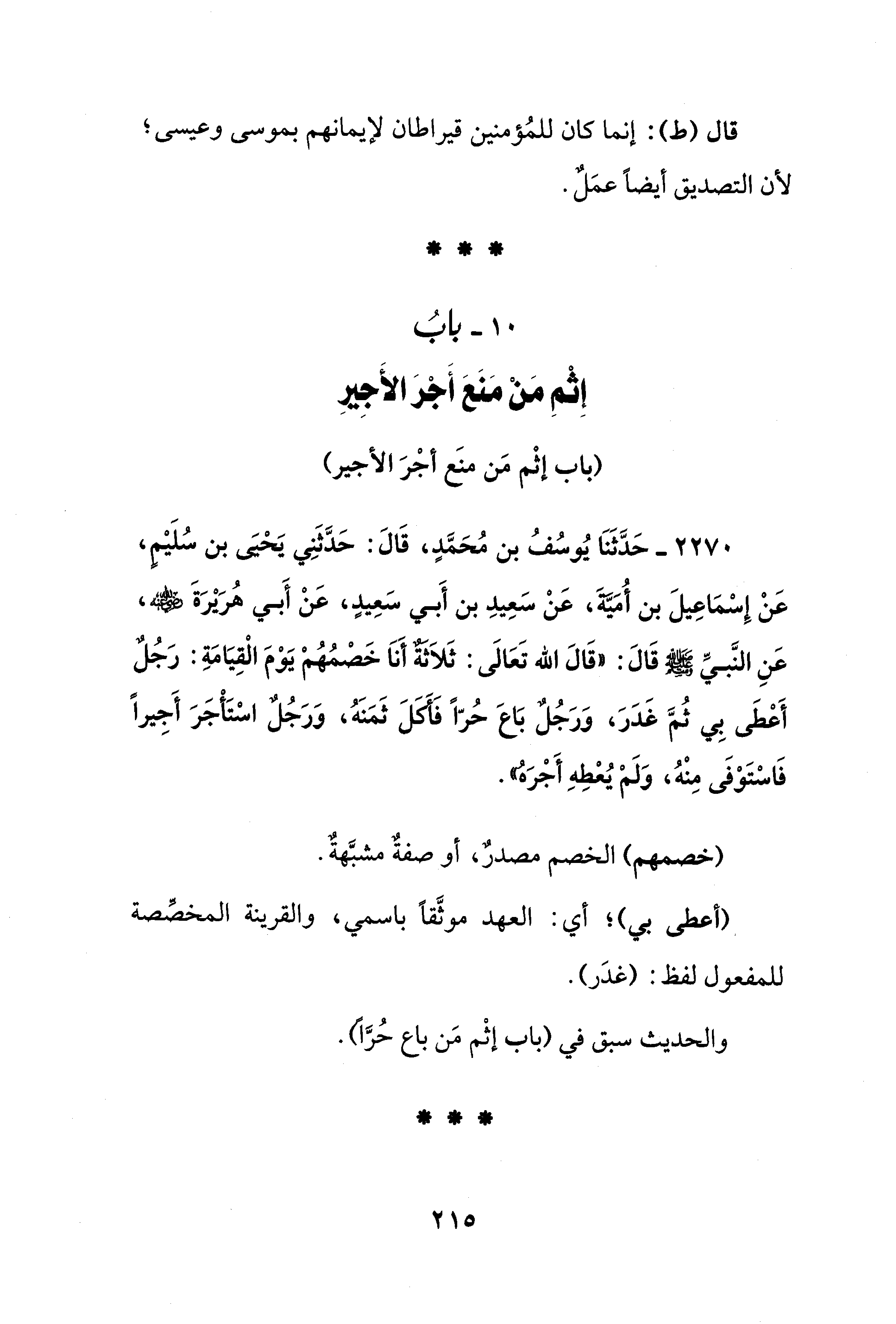 2270 - حَدَّثَنَا يُوسُفُ بن مُحَمَّدٍ، قَالَ: حَدَّثَنِي يَحْيَى بن سُلَيْمٍ، عَنْ إِسْمَاعِيلَ بن أُمَيَّةَ، عَنْ سَعِيدِ بن أَبي سَعِيدٍ، عَنْ أَبي هُرَيْرَةَ - رضي الله عنه -، عَنِ النَّبيِّ - صلى الله عليه وسلم - قَالَ: "قَالَ الله تَعَالَى: ثَلاَثَةٌ أَناَ خَصْمُهُمْ يَوْمَ الْقِيَامَةِ: رَجُلٌ أَعْطَى بِي ثُمَّ غَدَرَ، وَرَجُلٌ بَاعَ حُرًّا فَأَكَلَ ثَمَنَهُ، وَرَجُلٌ اسْتَأْجَرَ أَجِيرًا فَاسْتَوْفَى مِنْهُ، وَلَمْ يُعْطِهِ أَجْرَهُ".