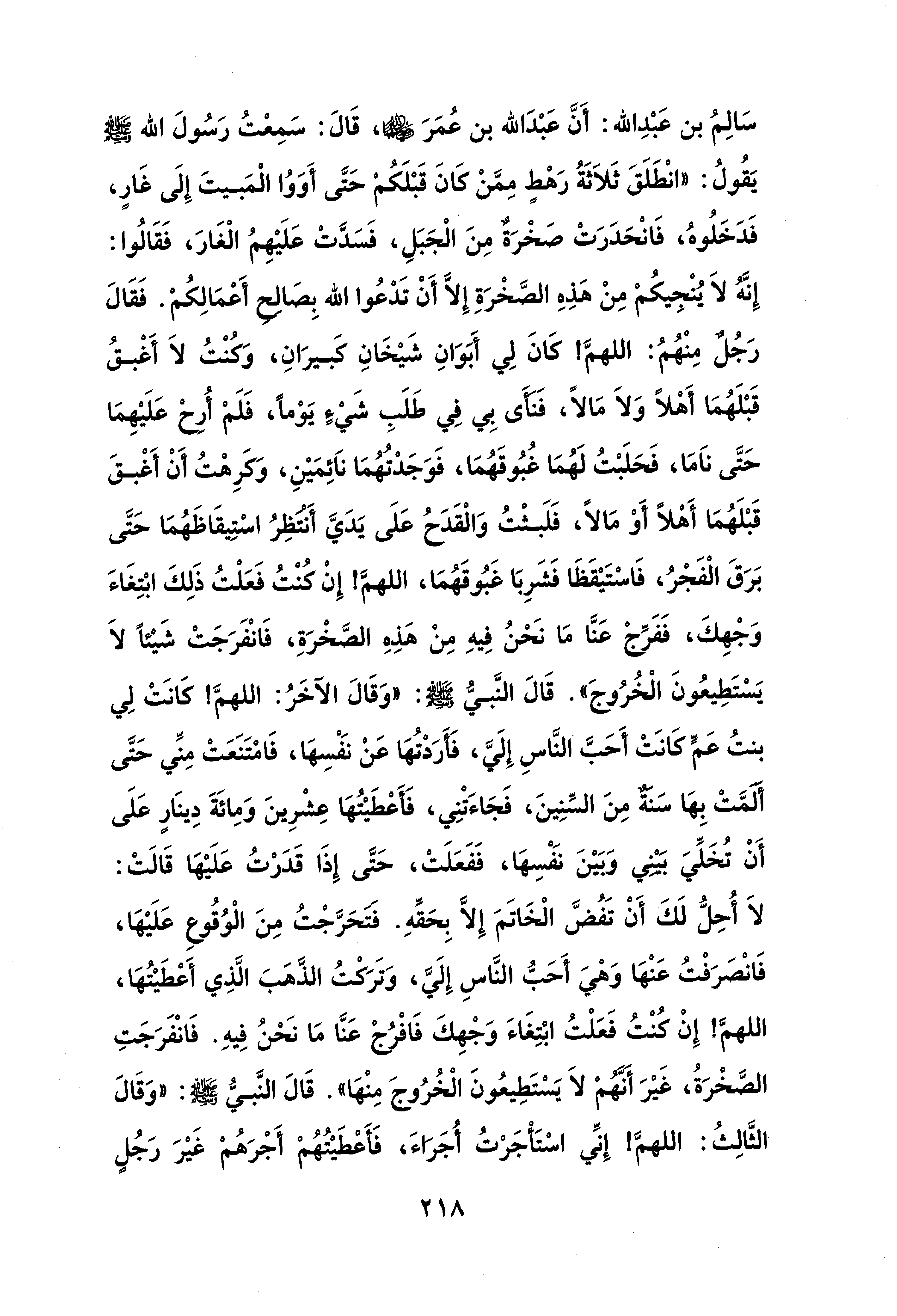 سَالِمُ بن عَبْدِ الله: أَنَّ عَبْدَ الله بن عُمَرَ - رضي الله عنه -، قَالَ: سَمِعْتُ رَسُولَ الله - صلى الله عليه وسلم - يَقُولُ: "انْطَلَقَ ثَلاَثَةُ رَهْطٍ مِمَّنْ كَانَ قَبْلَكُمْ حَتَّى أَوَوُا الْمَبيتَ إِلَى غَارٍ، فَدَخَلُوهُ، فَانْحَدَرَتْ صَخْرَةٌ مِنَ الْجَبَلِ، فَسَدَّتْ عَلَيْهِمُ الْغَارَ، فَقَالُوا: إِنَّهُ لاَ يُنْجيكُمْ مِنْ هَذِهِ الصَّخْرَةِ إِلَّا أَنْ تَدْعُوا الله بِصَالِحِ أَعْمَالِكُمْ. فَقَالَ رَجُلٌ مِنْهُمُ: اللهمَّ! كَانَ لِي أَبَوَانِ شَيْخَانِ كَبيرَانِ، وَكُنْتُ لاَ أَغْبقُ قَبْلَهُمَا أَهْلًا وَلاَ مَالًا، فَنأَى بِي فِي طَلَبِ شَيْءٍ يَوْمًا، فَلَمْ أُرِحْ عَلَيْهِمَا حَتَّى ناَمَا، فَحَلَبْتُ لَهُمَا غُبُوقَهُمَا، فَوَجَدْتُهُمَا ناَئِمَيْنِ، وَكَرِهْتُ أَنْ أَغْبقَ قَبْلَهُمَا أَهْلًا أَوْ مَالًا، فَلَبثْتُ وَالْقَدَحُ عَلَى يَدَيَّ أَنْتَظِرُ اسْتِيقَاظَهُمَا حَتَّى بَرَقَ الْفَجْرُ، فَاسْتَيْقَظَا فَشَرِبَا غَبُوقَهُمَا، اللهمَّ! إِنْ كُنْتُ فَعَلْتُ ذَلِكَ ابْتِغَاءَ وَجْهِكَ، فَفَرِّجْ عَنَّا مَا نَحْنُ فِيهِ مِنْ هَذِهِ الصَّخْرَةِ، فَانْفَرَجَتْ شَيْئًا لاَ يَسْتَطِيعُونَ الْخُرُوجَ". قَالَ النَّبيُّ - صلى الله عليه وسلم -: "وَقَالَ الآخَرُ: اللهمَّ! كَانَتْ لِي بنتُ عَمٍّ كَانَتْ أَحَبَّ النَّاسِ إِلَيَّ، فَأَرَدْتُهَا عَنْ نَفْسِهَا، فَامْتَنَعَتْ مِنِّي حَتَّى أَلَمَّتْ بِهَا سَنَةٌ مِنَ السِّنِينَ، فَجَاءَتْنِي، فَأَعْطَيْتُهَا عِشْرِينَ وَمِائَةَ دِينَارٍ عَلَى أَنْ تُخَلِّيَ بَيْنِي وَبَيْنَ نَفْسِهَا، فَفَعَلَتْ، حَتَّى إِذَا قَدَرْتُ عَلَيْهَا قَالَتْ: لاَ أُحِلُّ لَكَ أَنْ تَفُضَّ الْخَاتَمَ إِلَّا بِحَقِّهِ. فتحَرَّجْتُ مِنَ الْوُقُوعِ عَلَيْهَا، فَانْصَرَفْتُ عَنْهَا وَهْيَ أَحَبُّ النَّاسِ إِلَيَّ، وَتَرَكْتُ الذَّهَبَ الَّذِي أَعْطَيْتُهَا، اللهمَّ! إِنْ كُنْتُ فَعَلْتُ ابْتِغَاءَ وَجْهِكَ فَافْرُجْ عَنَّا مَا نَحْنُ فِيهِ. فَانْفَرَجَتِ الصَّخْرَةُ، غير أنَّهُمْ لاَ يَسْتَطِيعُونَ الْخُرُوجَ مِنْهَا". قَالَ النَّبيُّ - صلى الله عليه وسلم -: "وَقَالَ الثَّالِثُ: اللهمَّ! إِنِّي اسْتَأْجَرْتُ أُجَرَاءَ، فَأَعْطَيْتُهُمْ أَجْرَهُمْ غَيْرَ رَجُلٍ