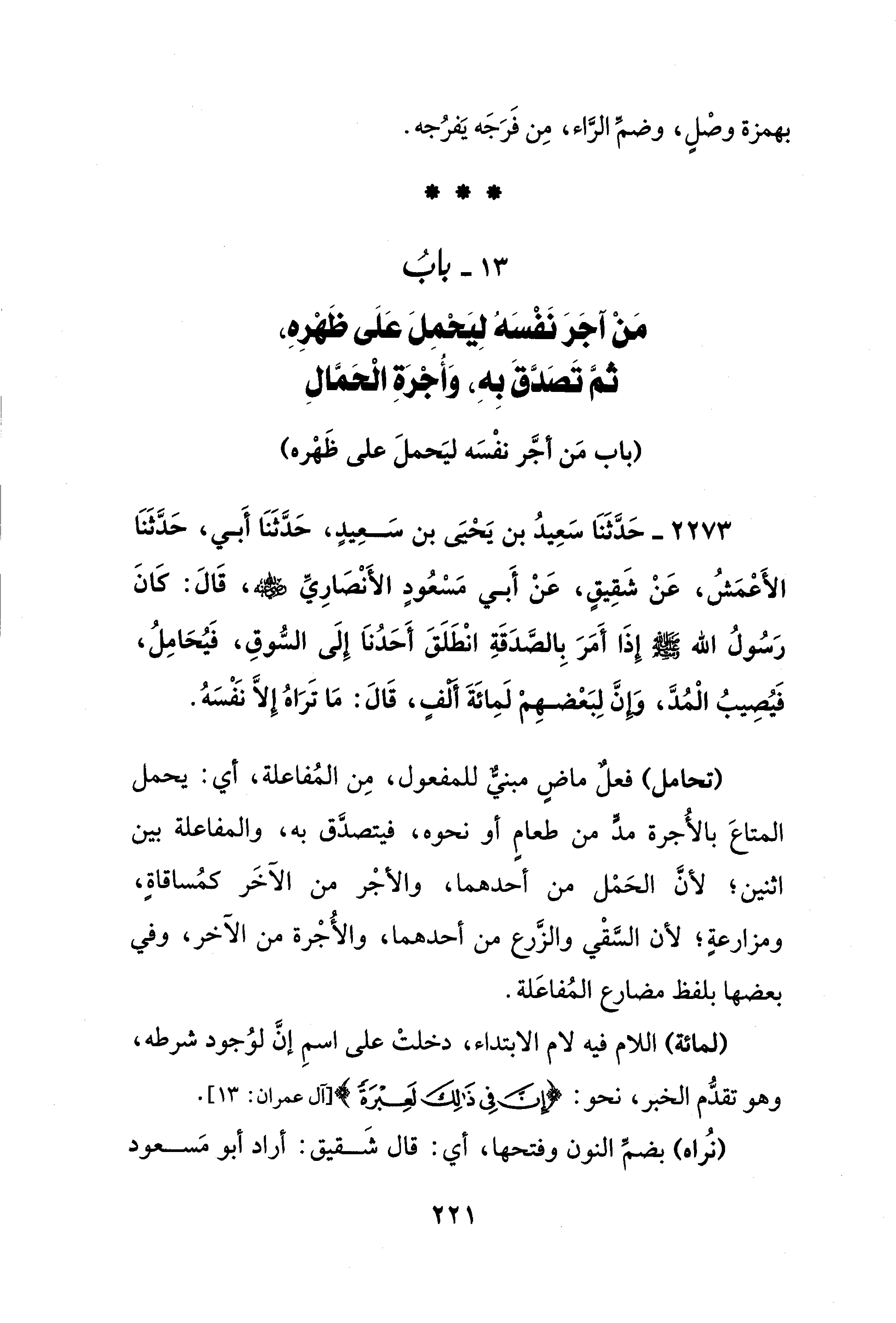 2273 - حَدَّثَنَا سَعيد بن يَحْيَى بن سَعِيدٍ، حَدَّثَنَا أَبي، حَدَّثَنَا الأَعْمَش، عَنْ شَقِيقٍ، عَنْ أَبي مَسْعُودٍ الأَنْصَارِيِّ - رضي الله عنه -، قَالَ: كَانَ رَسول الله - صلى الله عليه وسلم - إِذَا أَمَرَ بِالصَّدَقَةِ انْطَلَقَ أَحَدُناَ إِلَى السُّوقِ، فَيُحَامِلُ، فَيُصِيبُ الْمُدَّ، وَإِنَّ لِبَعْضهِمْ لَمِائَةَ أَلْفٍ، قَالَ: مَا تَرَاهُ إِلَّا نَفْسَهُ.