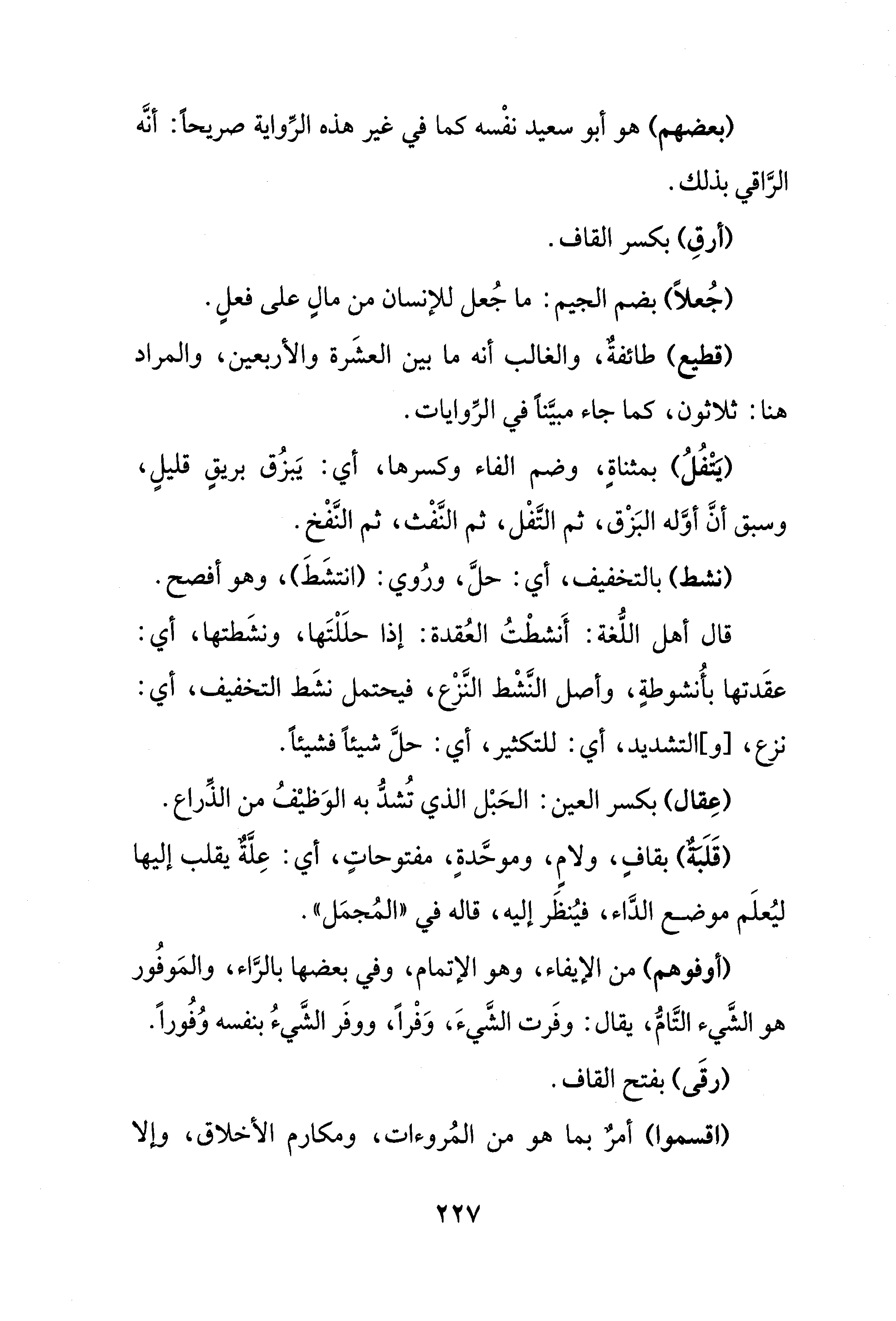 قال أهل اللُّغة: أَنشطْتُ العُقدة: إذا حلَلْتَها، ونشَطتها، أي: عقَدتها بأُنشوطةٍ، وأصل النَّشْط النَّزْع، فيحتمل نشَط التخفيف، أي: نزع، [و] التشديد، أي: للتكثير، أي: حلَّ شيئًا فشيئًا.