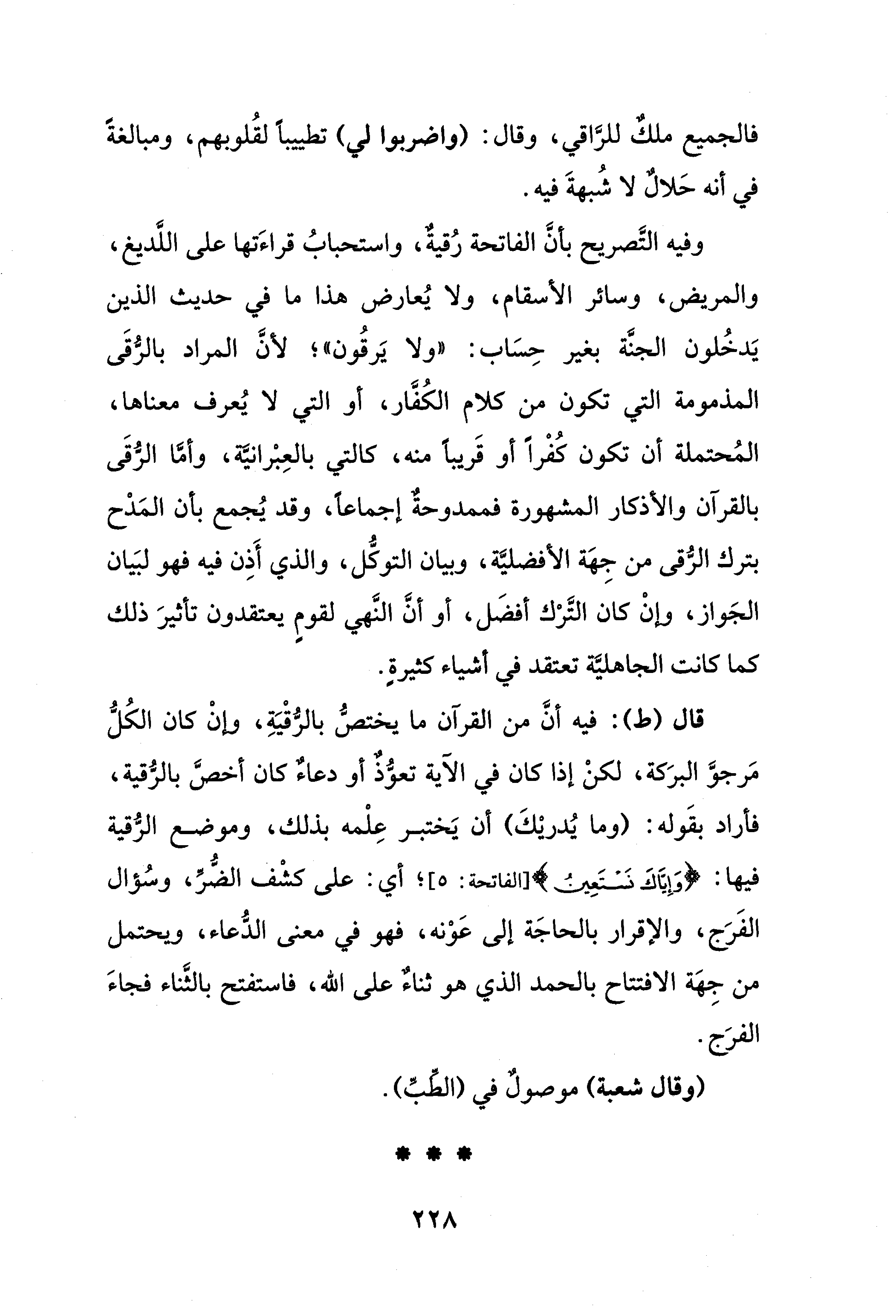 وفيه التَّصريح بأنَّ الفاتحة رُقيةٌ، واستحبابُ قراءَتها على اللَّديغ، والمريض، وسائر الأسقام، ولا يُعارض هذا ما في حديث الذين يَدخُلون الجنَّة بغير حِسَاب: "ولا يَرقُون"؛ لأنَّ المراد بالرُّقَى المذمومة التي تكون من كلام الكُفَّار، أو التي لا يُعرف معناها، المُحتملة أن تكون كُفْرًا أو قَريبًا منه، كالتي بالعِبْرانيَّة، وأمَّا الرُّقَى بالقرآن والأذكار المشهورة فممدوحةٌ إجماعًا، وقد يُجمع بأن المَدْح بترك الرُّقى من جِهَة الأفضليَّة، وبيان التوكُّل، والذي أَذِن فيه فهو لبَيان الجَواز، وإنْ كان التَّرْك أفضَل، أو أنَّ النَّهي لقومٍ يعتقدون تأثيرَ ذلك كما كانت الجاهليَّة تعتقد في أشياء كثيرةٍ.