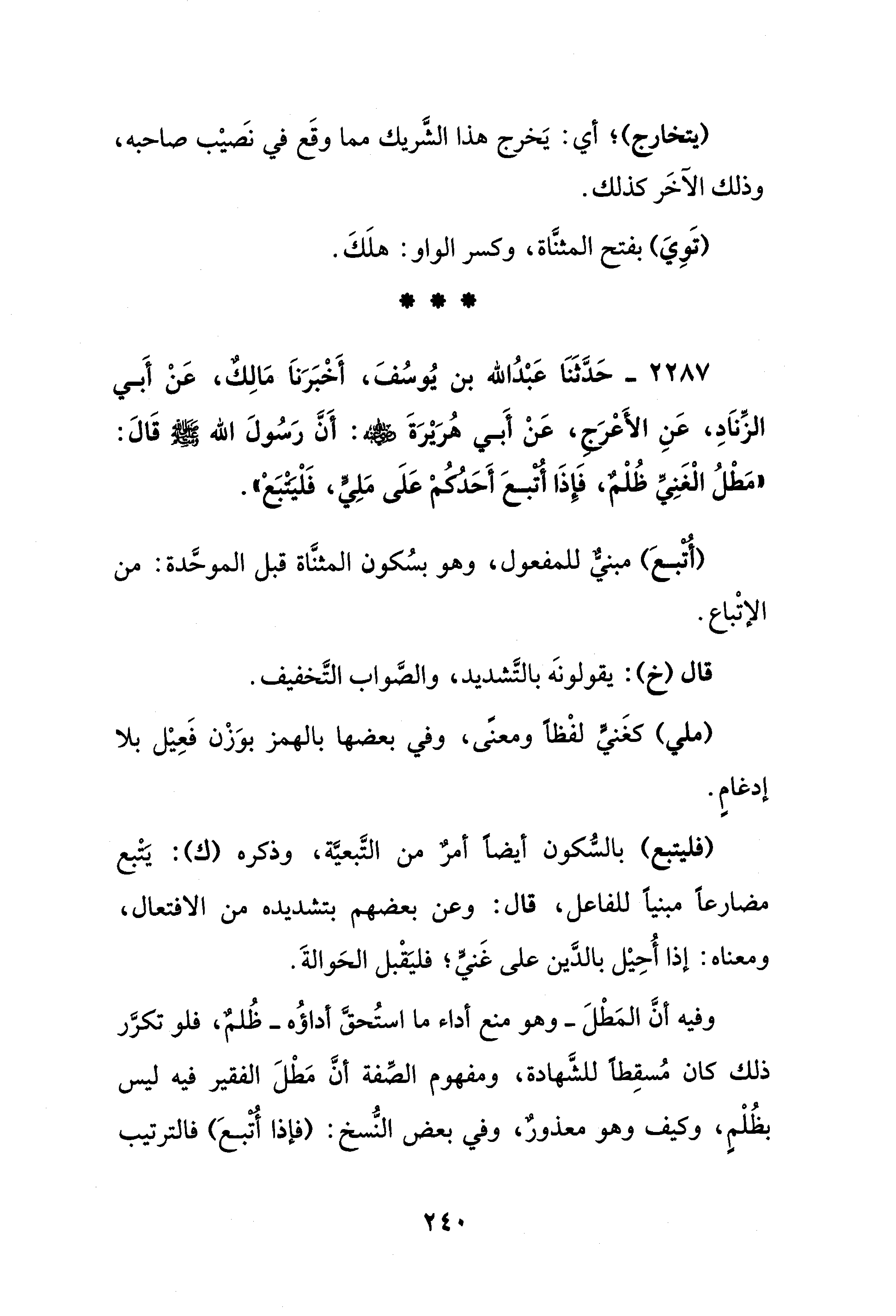 2287 - حَدَّثَنَا عَبْدُ الله بن يُوسُفَ، أَخْبَرَناَ مَالِكٌ، عَنْ أَبي الزِّناَدِ، عَنِ الأَعْرَجِ، عَنْ أَبي هُرَيْرَةَ - رضي الله عنه -: أَنَّ رَسُولَ الله - صلى الله عليه وسلم - قَالَ: "مَطْلُ الْغَنِيِّ ظُلْمٌ، فَإِذَا أُتْبعَ أَحَدُكُمْ عَلَى مَلِيٍّ، فَلْيَتْبَعْ".