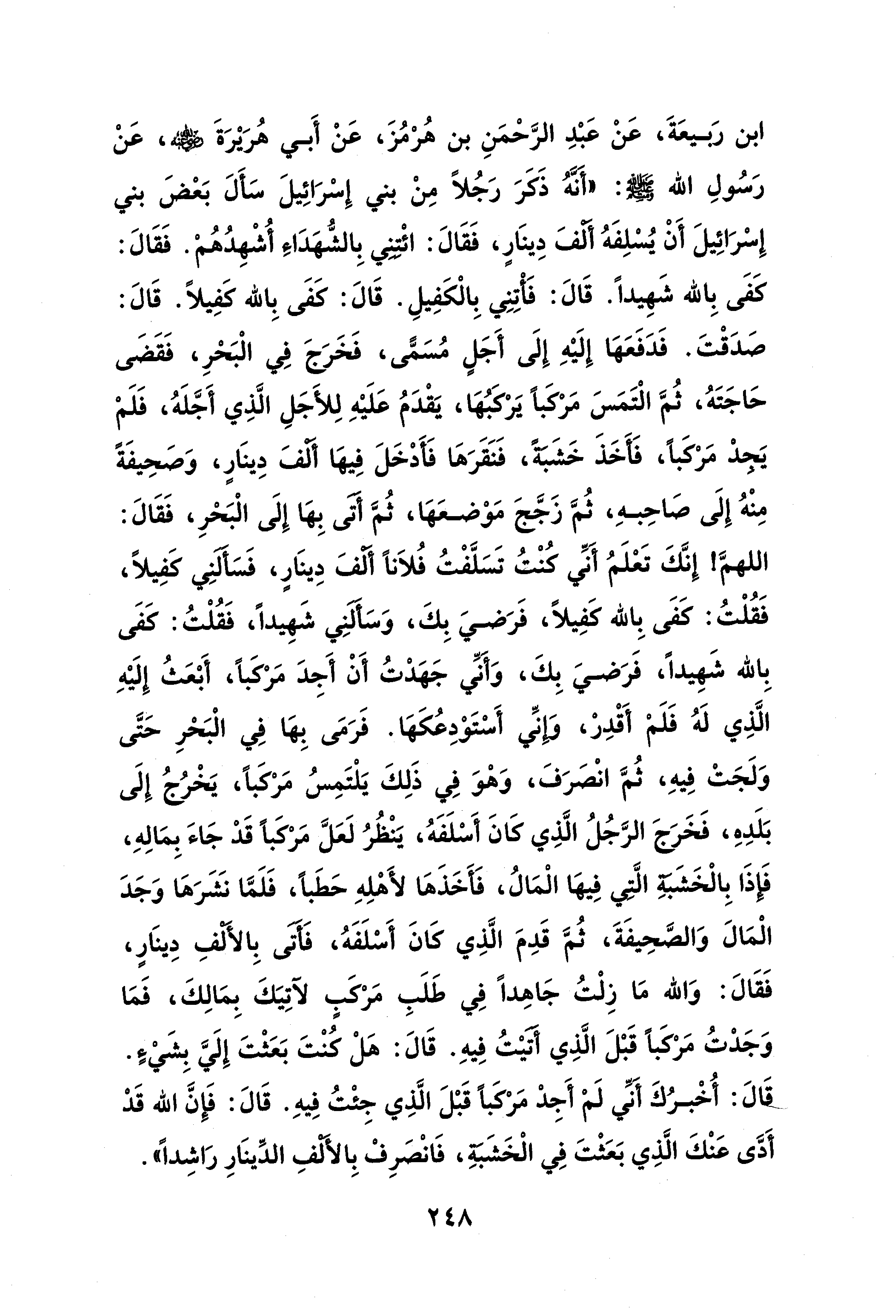 ابن رَبيعَةَ، عَنْ عَبْدِ الرَّحْمَنِ بن هُرْمُزَ، عَنْ أَبي هُرَيْرَةَ - رضي الله عنه -، عَنْ رَسُولِ الله - صلى الله عليه وسلم -: "أَنَّهُ ذَكَرَ رَجُلًا مِنْ بني إِسْرَائِيلَ سَأَلَ بَعْضَ بني إِسْرَائِيلَ أَنْ يُسْلِفَهُ أَلْفَ دِينَارٍ، فَقَالَ: ائْتِنِي بِالشُّهَدَاءِ أُشْهِدُهُمْ. فَقَالَ: كَفَى بِالله شَهِيدًا. قَالَ: فَأْتِنِي بِالْكَفِيلِ. قَالَ: كَفَى بِالله كَفِيلًا. قَالَ: صَدَقْتَ. فَدَفَعَهَا إِلَيْهِ إِلَى أَجَلٍ مُسَمًّى، فَخَرَجَ في الْبَحْرِ، فَقَضَى حَاجَتَهُ، ثُمَّ الْتَمَسَ مَرْكَبًا يَرْكَبُهَا، يَقْدَمُ عَلَيْهِ لِلأَجَلِ الَّذِي أَجَّلَهُ، فَلَمْ يَجِدْ مَرْكَبًا، فَأَخَذَ خَشَبَةً، فَنَقَرَهَا فَأَدْخَلَ فِيهَا أَلْفَ دِينَارٍ، وَصَحِيفَةً مِنْهُ إِلَى صَاحِبهِ، ثُمَّ زَجَّجَ مَوْضعَهَا، ثُمَّ أَتَى بِهَا إِلَى الْبَحْرِ، فَقَالَ: اللهمَّ! إِنَّكَ تَعْلَمُ أَنِّي كُنْتُ تَسَلَّفْتُ فُلاَنًا أَتَي دِينَارٍ، فَسَأَلَنِي كَفِيلًا، فَقُلْتُ: كَفَى بِالله كَفِيلًا، فَرَضيَ بِكَ، وَسَألَنِي شَهِيدًا، فَقُلْتُ: كَفَى بِالله شَهِيدًا، فَرَضيَ بِكَ، وَأَنِّي جَهَدْتُ أَنْ أَجِدَ مَرْكَبًا، أَبْعَثُ إِلَيْهِ الَّذِي لَهُ فَلَمْ أَقْدِرْ، وَإِنِّي أَسْتَوْدِعُكَهَا. فَرَمَى بِهَا فِي الْبَحْرِ حَتَّى وَلَجَتْ فِيهِ، ثُمَّ انْصَرَفَ، وَهْوَ في ذَلِكَ يَلْتَمِسُ مَرْكَبًا، يَخْرُجُ إِلَى بَلَدِهِ، فَخَرَجَ الرَّجُلُ الَّذِي كَانَ أَسْلَفَهُ، يَنْظُرُ لَعَلَّ مَرْكَبًا قَدْ جَاءَ بِمَالِهِ، فَإذَا بِالْخَشَبَةِ الَّتِي فِيهَا الْمَالُ، فَأَخَذَهَا لأَهْلِهِ حَطَبًا، فَلَمَّا نَشَرَهَا وَجَدَ الْمَالَ وَالصَّحِيفَةَ، ثُمَّ قَدِمَ الَّذِي كَانَ أَسْلَفَهُ، فَأَتَى بِالأَلْفِ دِينَارٍ، فَقَالَ: وَالله مَا زِلْتُ جَاهِدًا في طَلَبِ مَرْكَبٍ لآتِيَكَ بِمَالِكَ، فَمَا وَجَدْتُ مَرْكَبًا قَبْلَ الَّذِي أَتَيْتُ فِيهِ. قَالَ: هَلْ كُنْتَ بَعَثْتَ إِلَيَّ بِشَيْءٍ. قَالَ: أُخْبرُكَ أَنِّي لَمْ أَجِدْ مَرْكَبًا قَبْلَ الَّذِي جِئْتُ فِيهِ. قَالَ: فَإنَّ الله قَدْ أَدَّى عَنْكَ الَّذِي بَعَثْتَ فِي الْخَشَبَةِ، فَانْصَرِفْ بِالأَلْفِ الدِّينَارِ رَاشِدًا".