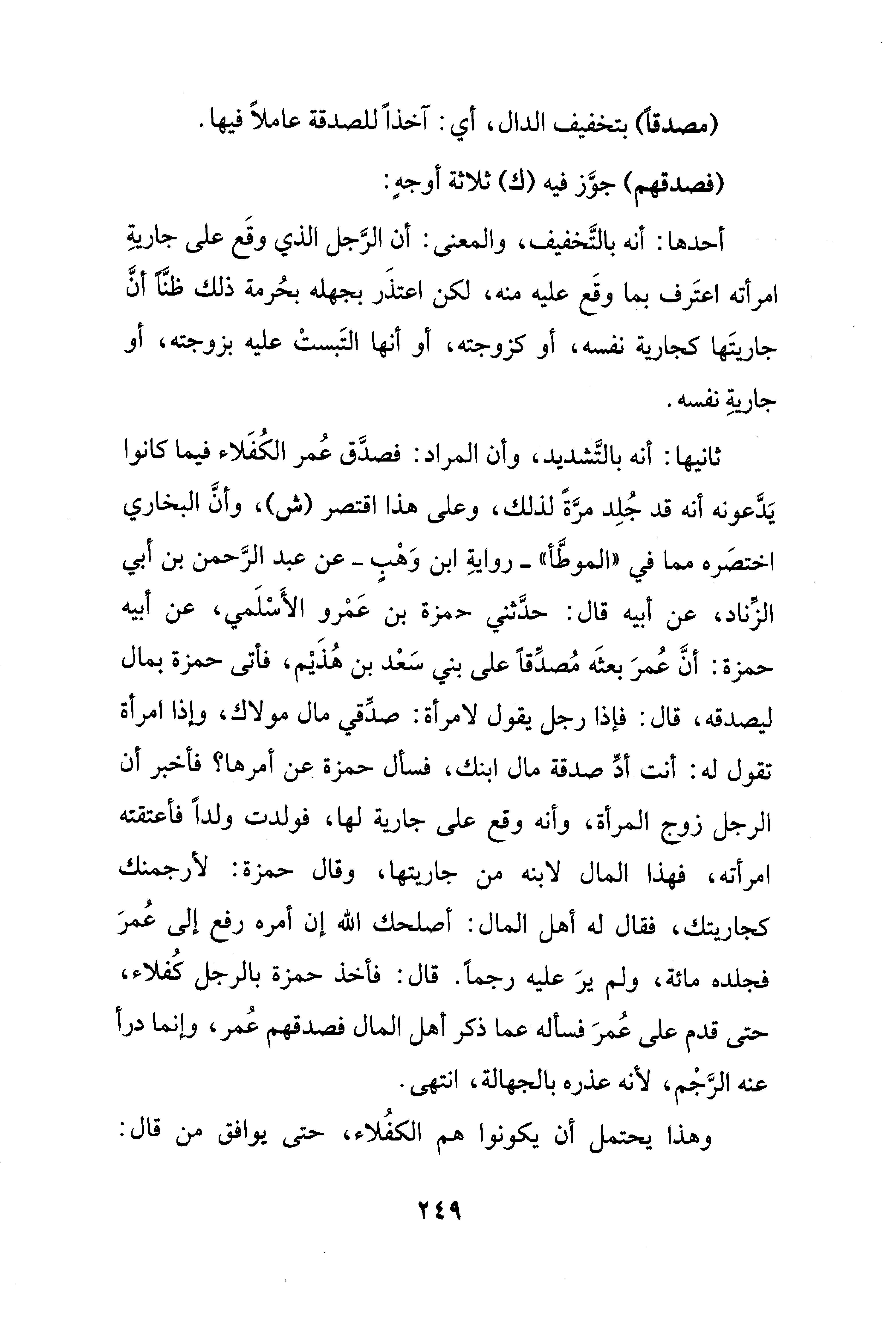 ثانيها: أنه بالتَّشديد، وأن المراد: فصدَّق عُمر الكُفَلاء فيما كانوا يَدَّعونه أنه قد جُلِد مرَّةً لذلك، وعلى هذا اقتصر (ش)، وأنَّ البخاري اختصَره مما في "الموطَّأ" -روايةِ ابن وَهْبٍ- عن عبد الرَّحمن بن أبي الزِّناد، عن أبيه قال: حدَّثني حمزة بن عَمْرو الأَسْلَمي، عن أبيه حمزة: أنَّ عُمرَ بعثَه مُصدِّقًا علي بني سَعْد بن هُذَيْم، فأتى حمزة بمال ليصدقه، قال: فإذا رجل يقول لامرأة: صدِّقي مال مولاك، وإذا امرأة تقول له: أنت أدِّ صدقة مال ابنك، فسأل حمزة عن أمرها؟ فأخبر أن الرجل زوج المرأة، وأنه وقع على جارية لها، فولدت ولدًا فأعتقته امرأته، فهذا المال لابنه من جاريتها، وقال حمزة: لأرجمنك كجاريتك، فقال له أهل المال: أصلحك الله إن أمره رفع إلى عُمرَ فجلده مائة، ولم يرَ عليه رجمًا. قال: فأخذ حمزة بالرجل كُفلاء، حتى قدم على عُمرَ فسأله عما ذكر أهل المال فصدقهم عُمر، وإنما درأ عنه الرَّجْم؛ لأنه عذره بالجهالة، انتهى.