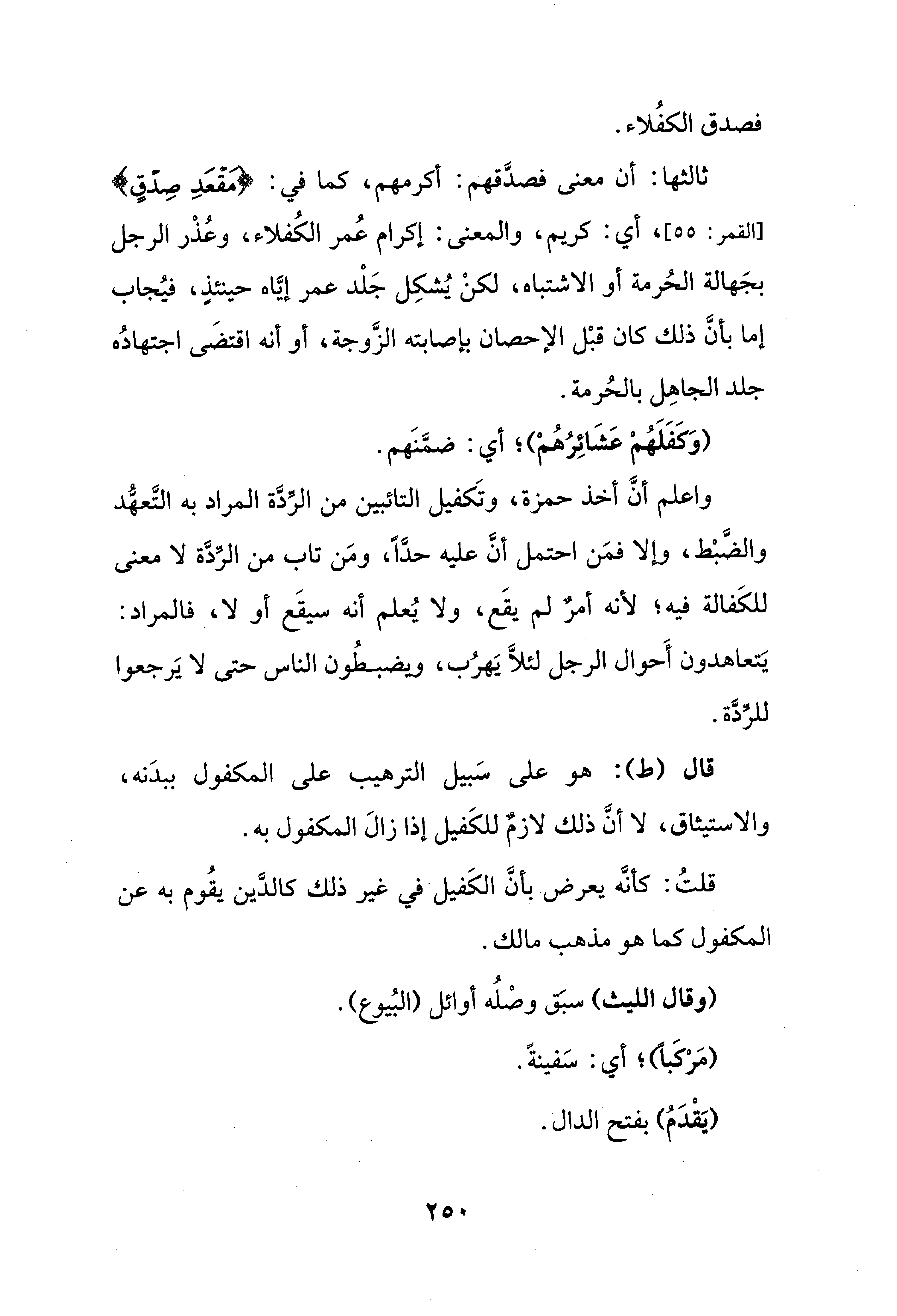 واعلم أنَّ أخذ حمزة، وتَكفيل التائبين من الرِّدَّة المراد به التَّعهُّد والضَّبْط، وإلا فمَن احتمل أنَّ عليه حدًّا، ومَن تاب من الرِّدَّة لا معنى للكَفالة فيه؛ لأنه أمرٌ لم يقَع، ولا يُعلم أنه سيقَع أو لا، فالمراد: يَتعاهدون أَحوال الرجل لئلَّا يَهرُب، ويضبطُون الناس حتى لا يَرجعوا للرِّدَّة.
