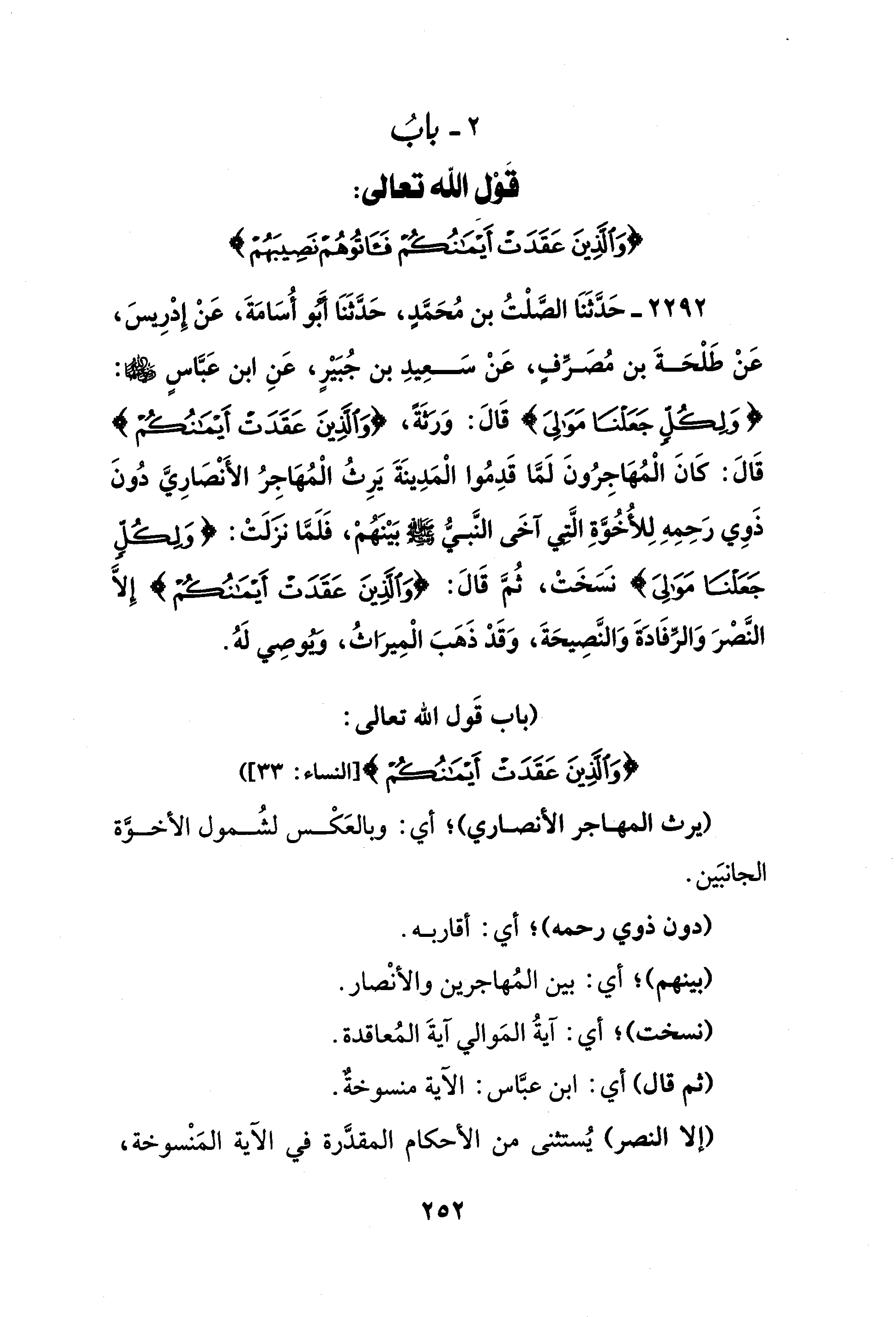 2292 - حَدَّثَنَا الصَّلْتُ بن مُحَمَّدٍ، حَدَّثَنَا أَبُو أُسَامَةَ، عَنْ إِدْرِيسَ، عَنْ طَلْحَةَ بن مُصَرِّفٍ، عَنْ سَعِيدِ بن جُبَيْرٍ، عَنِ ابن عَبَّاسٍ - رضي الله عنهما -: {وَلِكُلٍّ جَعَلْنَا مَوَالِيَ} قَالَ: وَرَثَةً، {وَالَّذِينَ عَقَدَتْ أَيْمَانُكُمْ} قَالَ: كَانَ الْمُهَاجِرُونَ لَمَّا قَدِمُوا الْمَدِينَةَ يَرِثُ الْمُهَاجِرُ الأَنْصَارِيَّ دُونَ ذَوِي رَحِمِهِ لِلأُخُوَّةِ الَّتِي آخَى النَّبيُّ - صلى الله عليه وسلم - بَيْنَهُمْ، فَلَمَّا نزَلَتْ: {وَلِكُلٍّ جَعَلْنَا مَوَالِيَ} نَسَخَتْ، ثُمَّ قَالَ: {وَالَّذِينَ عَقَدَتْ أَيْمَانُكُمْ} إلَّا النَّصْرَ وَالرِّفَادَةَ وَالنَّصِيحَةَ، وَقَدْ ذَهَبَ الْمِيرَاثُ، ويُوصِي لَهُ.