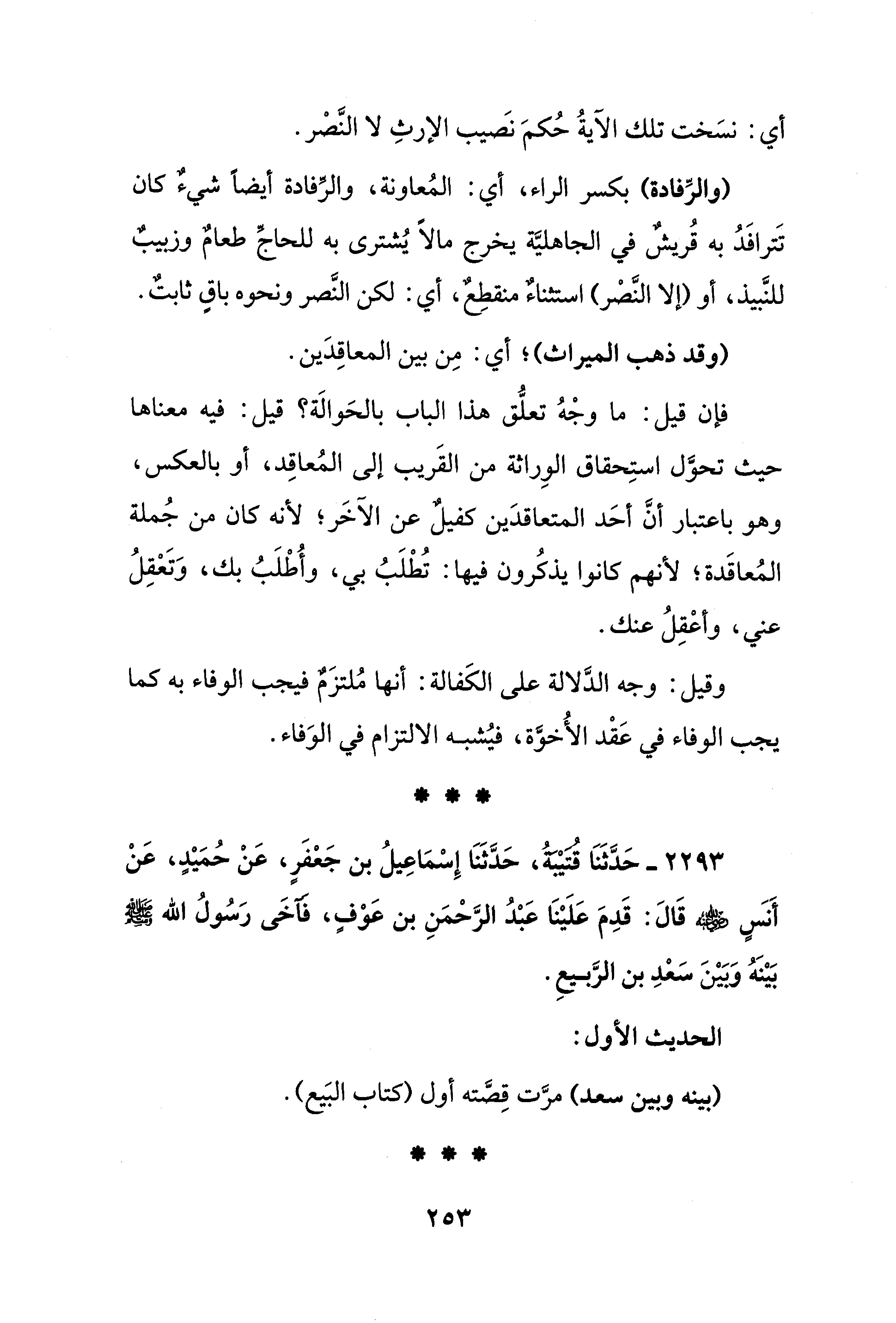 2293 - حَدَّثَنَا قُتَيْبَةُ، حَدَّثَنَا إِسْمَاعِيلُ بن جَعْفَرٍ، عَنْ حُمَيْدٍ، عَنْ أَنَسٍ - رضي الله عنه - قَالَ: قَدِمَ عَلَيْنَا عَبْدُ الرَّحْمَنِ بن عَوْفٍ، فَآخَى رَسُولُ الله - صلى الله عليه وسلم - بَيْنَهُ وَبَيْنَ سَعْدِ بن الرَّبيعِ.
