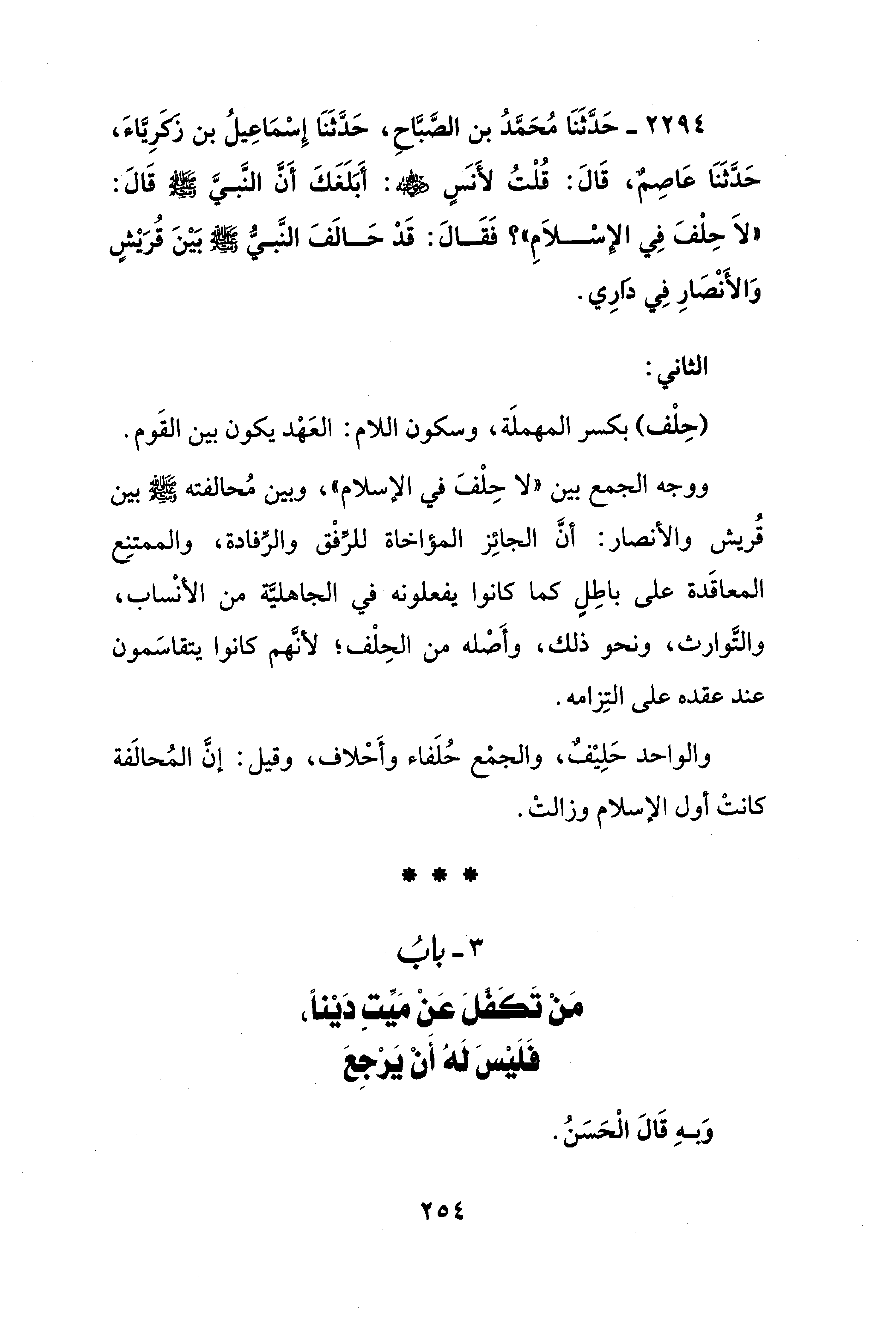 2294 - حَدَّثَنَا مُحَمَّدُ بن الصَّبَّاحِ، حَدَّثَنَا إِسْمَاعِيلُ بن زَكَرِيَّاءَ، حَدَّثَنَا عَاصِمٌ، قَالَ: قُلْتُ لأَنَسٍ - رضي الله عنه -: أَبَلَغَكَ أَنَّ النَّبيَّ - صلى الله عليه وسلم - قَالَ: "لاَ حِلْفَ في الإسْلاَمِ"؟ فَقَالَ: قَدْ حَالَفَ النَّبيُّ - صلى الله عليه وسلم - بَيْنَ قُرَيْشٍ وَالأَنْصَارِ فِي دَارِي.