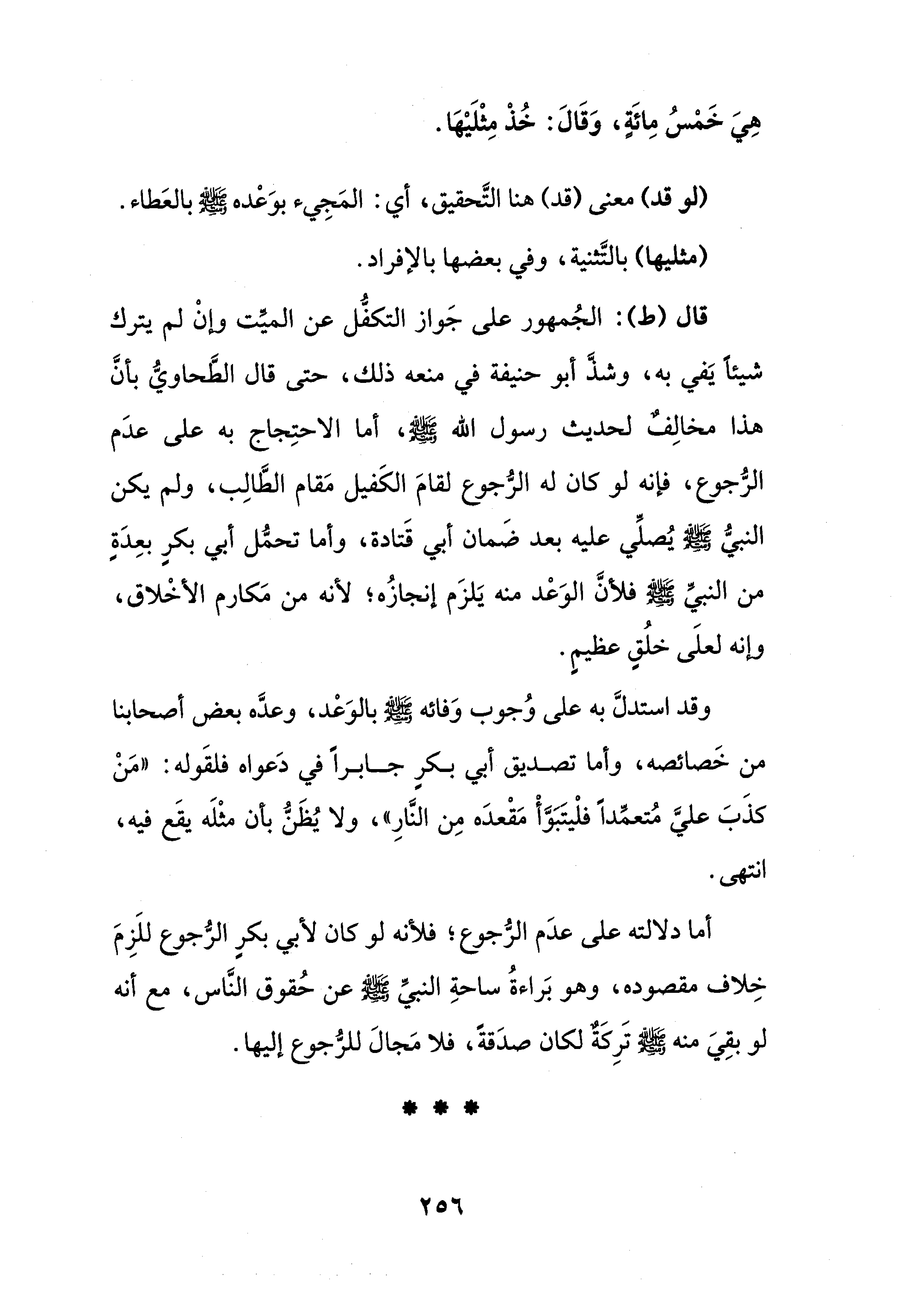 قال (ط): الجُمهور على جَواز التكفُّل عن الميِّت وإنْ لم يترك شيئًا يَفي به، وشذَّ أبو حنيفة في منعه ذلك، حتى قال الطَّحاويُّ بأنَّ هذا مخالِفٌ لحديث رسول الله - صلى الله عليه وسلم -، أما الاحتِجاج به على عدَم الرُّجوع، فإنه لو كان له الرُّجوع لقامَ الكَفيل مَقام الطَّالِب، ولم يكن النبي - صلى الله عليه وسلم - يُصلِّي عليه بعد ضَمان أبي قَتادة، وأما تحمُّل أبي بكرٍ بعِدَة من النبيِّ - صلى الله عليه وسلم - فلأنَّ الوَعْد منه يَلزَم إنجازُه؛ لأنه من مَكارم الأخْلاق، وإنه لعلَى خلُقٍ عظيمٍ.
