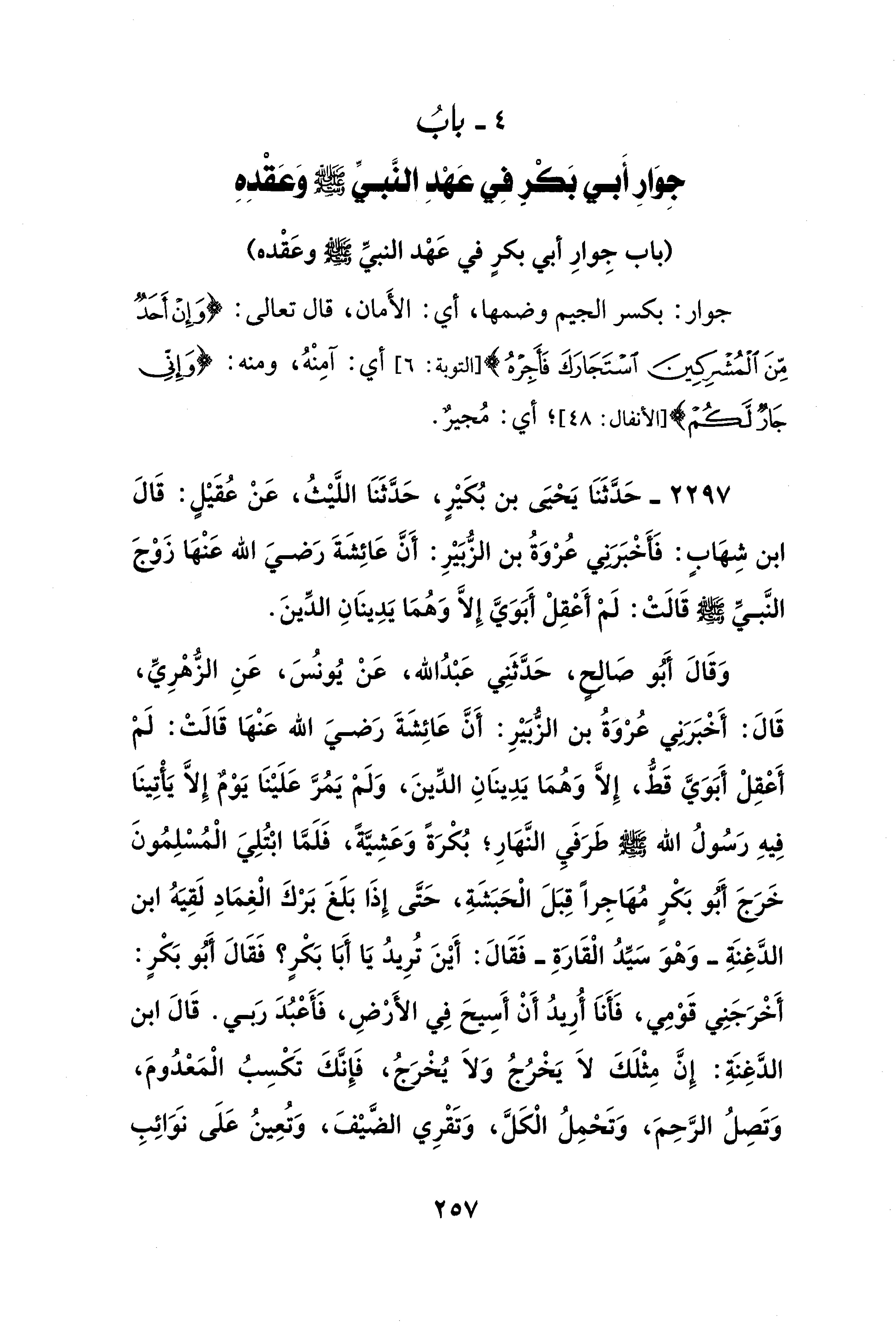 وَقَالَ أَبُو صَالِحٍ، حَدَّثَنِي عَبْدُ الله، عَنْ يُونس، عَنِ الزُّهْرِيِّ، قَالَ: أَخْبَرَني عُرْوَةُ بن الزُّبَيْرِ: أَنَّ عَائِشَةَ رَضيَ الله عَنْهَا قَالَتْ: لَمْ أَعْقِلْ أَبَوَيَّ قَطُّ، إِلَّا وَهُمَا يَدِينَانِ الدِّينَ، وَلَمْ يَمُرَّ عَلَيْنَا يَوْمٌ إِلَّا يَأْتِينَا فِيهِ رَسُولُ الله - صلى الله عليه وسلم - طَرَفَيِ النَّهَارِ؛ بُكْرَةً وَعَشِيَّةً، فَلَمَّا ابْتُلِيَ الْمُسْلِمُونَ خَرَجَ أَبَو بَكْرٍ مُهَاجِرًا قِبَلَ الْحَبَشَةِ، حَتَّى إِذَا بَلَغَ بَرْكَ الْغِمَادِ لَقِيَهُ ابن الدَّغِنَةِ -وَهْوَ سَيِّدُ الْقَارَةِ- فَقَالَ: أَيْنَ تُرِيدُ يَا أَبَا بَكْرٍ؟ فَقَالَ أَبُو بَكْرٍ: أَخْرَجَنِي قَوْمِي، فَأَناَ أُرِيدُ أَنْ أَسِيحَ فِي الأَرْضِ، فَأَعْبُدَ رَبي. قَالَ ابن الدَّغِنَةِ: إِنَّ مِثْلَكَ لاَ يَخْرُجُ وَلاَ يُخْرَجُ، فَإِنَّكَ تَكْسِبُ الْمَعْدُومَ، وَتَصِلُ الرَّحِمَ، وَتَحْمِلُ الْكَلَّ، وَتَقْرِي الضَّيْفَ، وَتُعِينُ عَلَى نَوَائِبِ