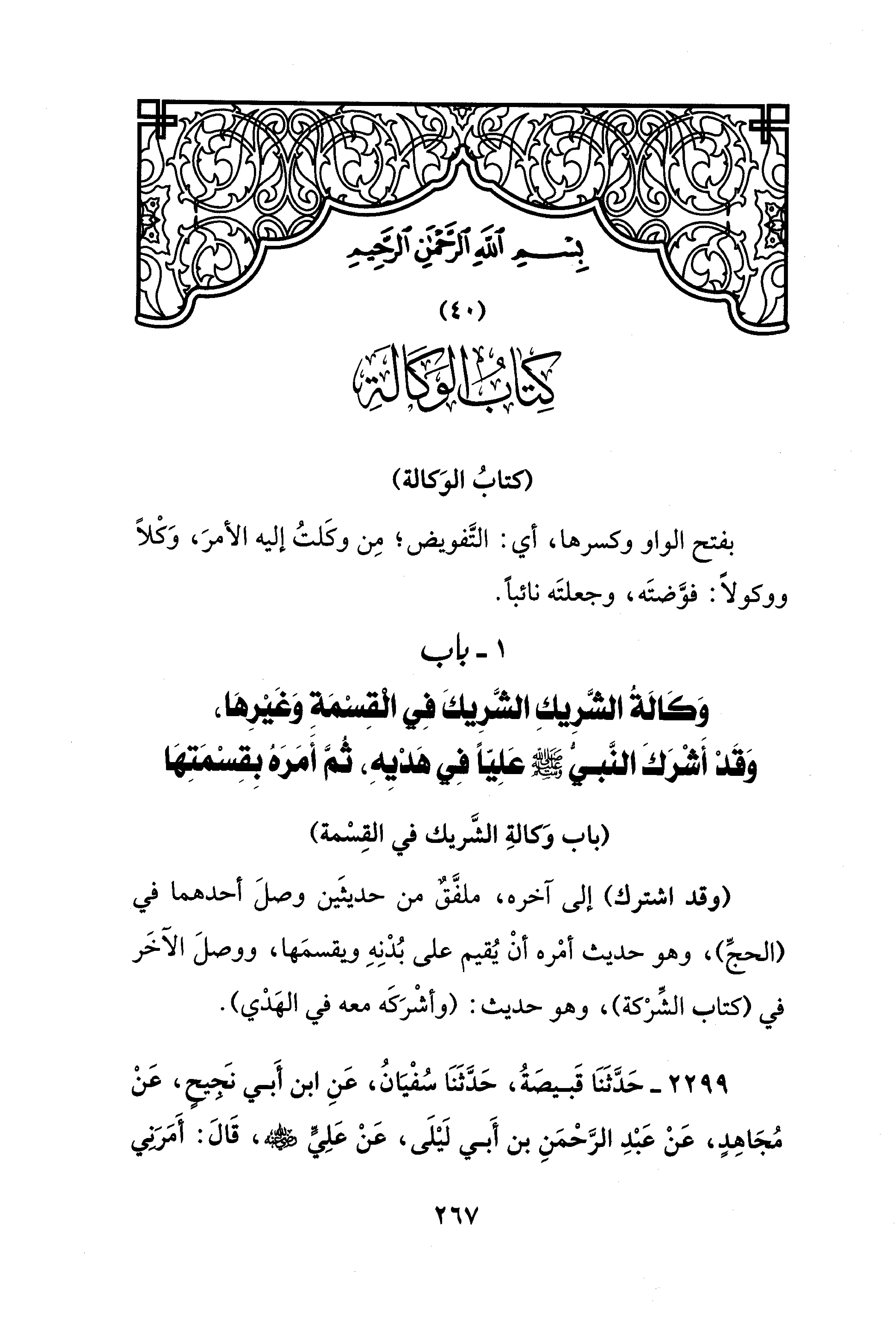 2299 - حَدَّثَنَا قَبيصَةُ، حَدَّثَنَا سُفْيَانُ، عَنِ ابن أَبي نَجِيحٍ، عَنْ مُجَاهِدٍ، عَنْ عَبْدِ الرَّحْمَنِ بن أَبي لَيْلَى، عَنْ عَلِيٍّ - رضي الله عنه -، قَالَ: أَمَرَنِي