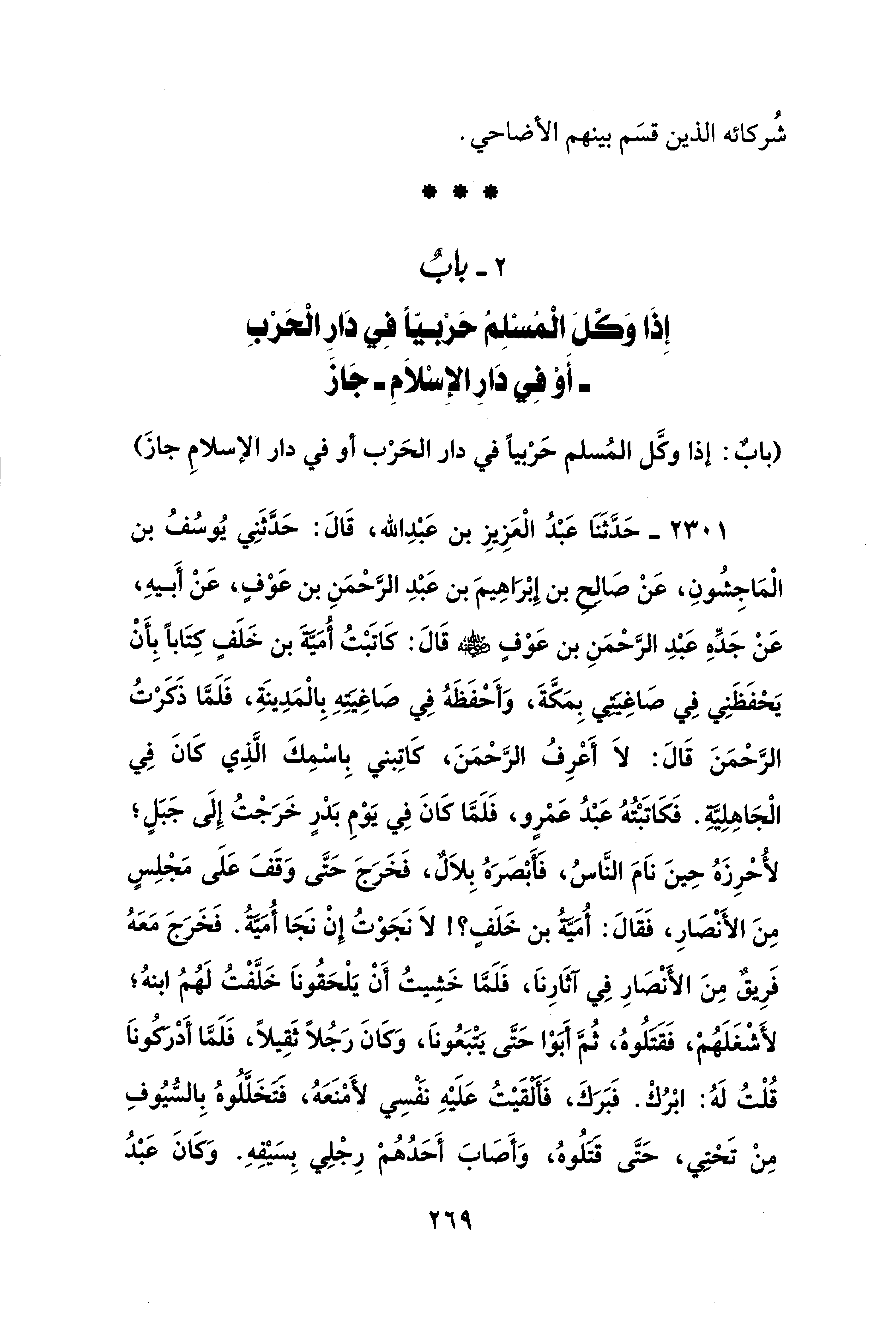 2301 - حَدَّثَنَا عَبْدُ الْعَزِيزِ بن عَبْدِ الله، قَالَ: حَدَّثَنِي يُوسُفُ بن الْمَاجِشُونِ، عَنْ صَالِحِ بن إِبْرَاهِيمَ بن عَبْدِ الرَّحْمَنِ بن عَوْفٍ، عَنْ أَبيهِ، عَنْ جَدِّهِ عَبْدِ الرَّحْمَنِ بن عَوْفٍ - رضي الله عنه - قَالَ: كَاتَبْتُ أُمَيَّةَ بن خَلَفٍ كِتَابًا بِأَنْ يَحْفَظَنِي فِي صَاغِيَتِي بِمَكَّةَ، وَأَحْفَظَهُ فِي صَاغِيَتِهِ بِالْمَدِينَةِ، فَلَمَّا ذَكَرْتُ الرَّحْمَنَ قَالَ: لاَ أَعْرِفُ الرَّحْمَنَ، كَاتِبني بِاسْمِكَ الَّذِي كَانَ فِي الْجَاهِلِيَّةِ. فَكَاتَبْتُهُ عَبْدُ عَمْرٍو، فَلَمَّا كَانَ فِي يَوْمِ بَدْرٍ خَرَجْتُ إِلَى جَبَلٍ؛ لأُحرِزَهُ حِينَ نَامَ النَّاسُ، فَأَبْصَرَهُ بِلاَلٌ، فَخَرَجَ حَتَّى وَقَفَ عَلَى مَجْلِسٍ مِنَ الأَنْصَارِ، فَقَالَ: أُمَيَّةُ بن خَلَفٍ؟! لاَ نَجَوْتُ إِنْ نَجَا أُمَيَّةُ. فَخَرَجَ مَعَهُ فَرِيقٌ مِنَ الأَنْصَارِ فِي آثَارِناَ، فَلَمَّا خَشِيتُ أَنْ يَلْحَقُوناَ خَلَّفْتُ لَهُمُ ابنهُ؛ لأَشْغَلَهُمْ، فَقتَلُوهُ، ثُمَّ أَبَوْا حَتَّى يَتْبَعُوناَ، وَكَانَ رَجُلًا ثَقِيلًا، فَلَمَّا أَدْرَكوناَ قُلْتُ لَهُ: ابْرُكْ. فَبَرَكَ، فَأَلْقَيْتُ عَلَيْهِ نفسِي لأَمْنَعَهُ، فتخَلَّلُوهُ بِالسُّيُوفِ مِنْ تَحْتِي، حَتَّى قَتَلُوهُ، وَأَصَابَ أَحَدُهُمْ رِجْلِي بِسَيْفِهِ. وَكَانَ عَبْدُ