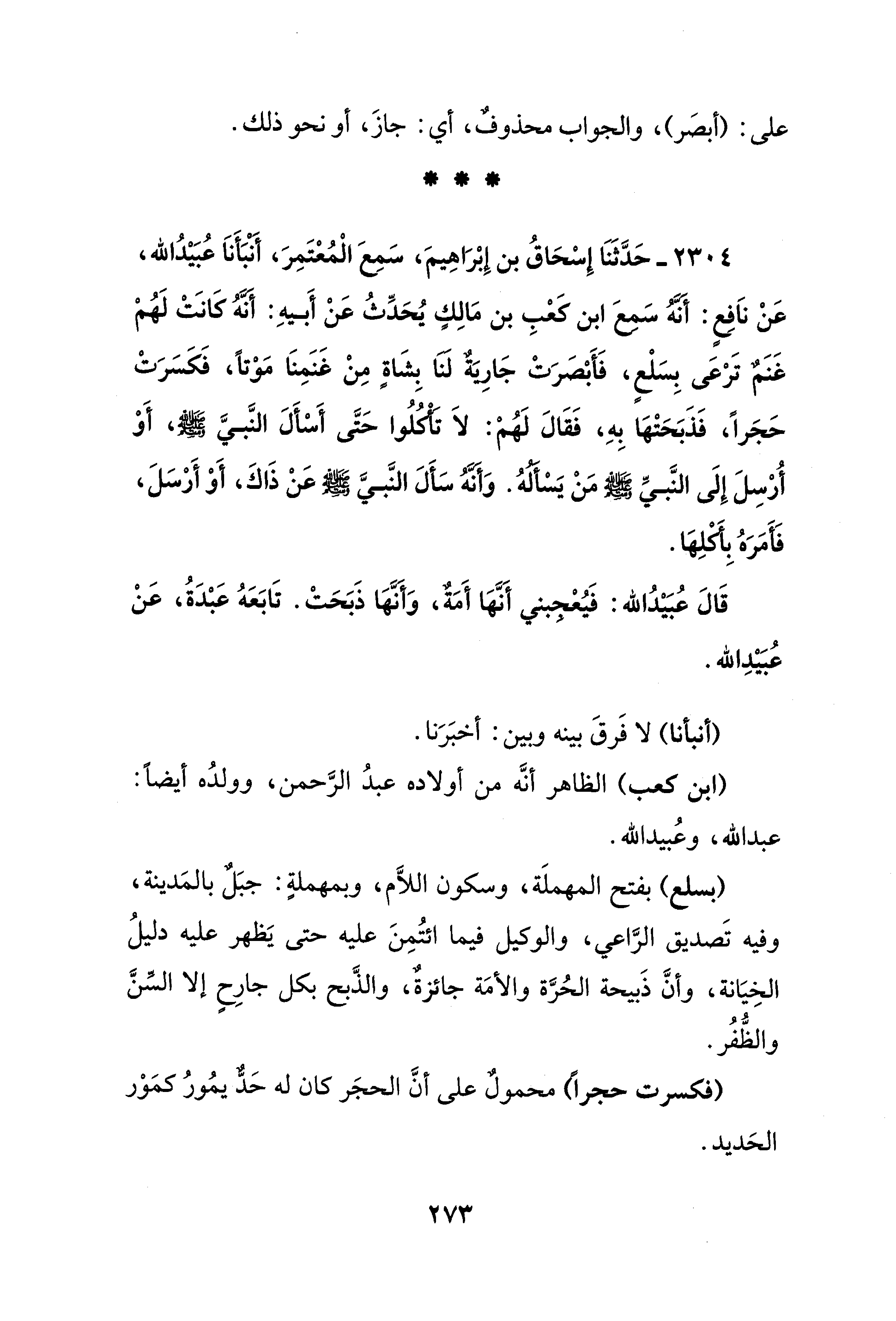 2304 - حَدَّثَنَا إِسْحَاقُ بن إِبْرَاهِيمَ، سَمعَ الْمُعْتَمِرَ، أنبَأَناَ عُبَيْدُ الله، عَنْ ناَفِعٍ: أَنَّهُ سَمِعَ ابن كَعْبِ بن مَالِكٍ يُحَدِّثُ عَنْ أَبيهِ: أَنَّهُ كَانَتْ لَهُمْ غَنَمٌ تَرْعَى بِسَلْعٍ، فَأَبْصَرَتْ جَارِيَةٌ لَنَا بِشَاةٍ مِنْ غَنَمِنَا مَوْتًا، فَكَسَرَتْ حَجَرًا، فَذَبَحَتْهَا بِهِ، فَقَالَ لَهُمْ: لاَ تَأْكُلُوا حَتَّى أَسْأَلَ النَّبيَّ - صلى الله عليه وسلم -، أَوْ أُرْسِلَ إِلَى النَّبيِّ - صلى الله عليه وسلم - مَنْ يَسْأَلُهُ. وَأَنَّهُ سَأَلَ النَّبيَّ - صلى الله عليه وسلم - عَنْ ذَاكَ، أَوْ أَرْسَلَ، فَأَمَرَ بِأكلِهَا.