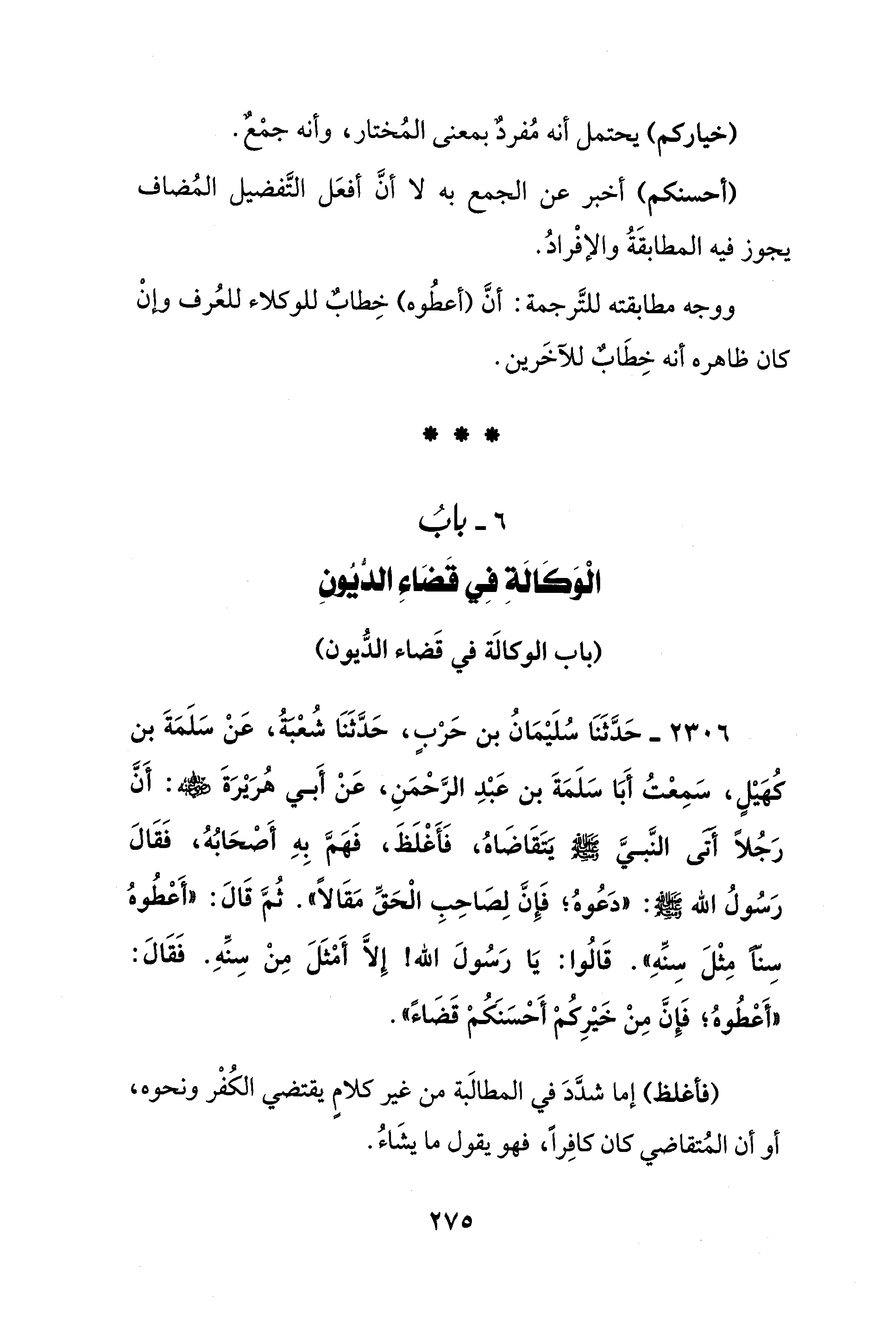 2306 - حَدَّثَنَا سُلَيْمَانُ بن حَرْبٍ، حَدَّثَنَا شُعْبَةُ، عَنْ سَلَمَةَ بن كُهَيْلٍ، سَمِعْتُ أَبَا سَلَمَةَ بن عَبْدِ الرَّحْمَنِ، عَنْ أَبي هُرَيْرَةَ - رضي الله عنه -: أَنَّ رَجُلًا أَتَى النَّبيَّ - صلى الله عليه وسلم - يَتَقَاضَاهُ، فَأَغْلَظَ، فَهَمَّ بِهِ أَصْحَابُهُ، فَقَالَ رَسُولُ الله - صلى الله عليه وسلم -: "دَعُوهُ؛ فَإِنَّ لِصَاحِبِ الْحَقِّ مَقَالًا". ثُمَّ قَالَ: "أَعْطُوهُ سِنًّا مِثْلَ سِنِّهِ". قَالُوا: يَا رَسُولَ الله! إِلَّا أَمْثَلَ مِنْ سِنِّهِ. فَقَالَ: "أَعْطُوهُ؛ فَإِنَّ مِنْ خَيْرِكُمْ أَحْسَنَكُمْ قَضَاءً".