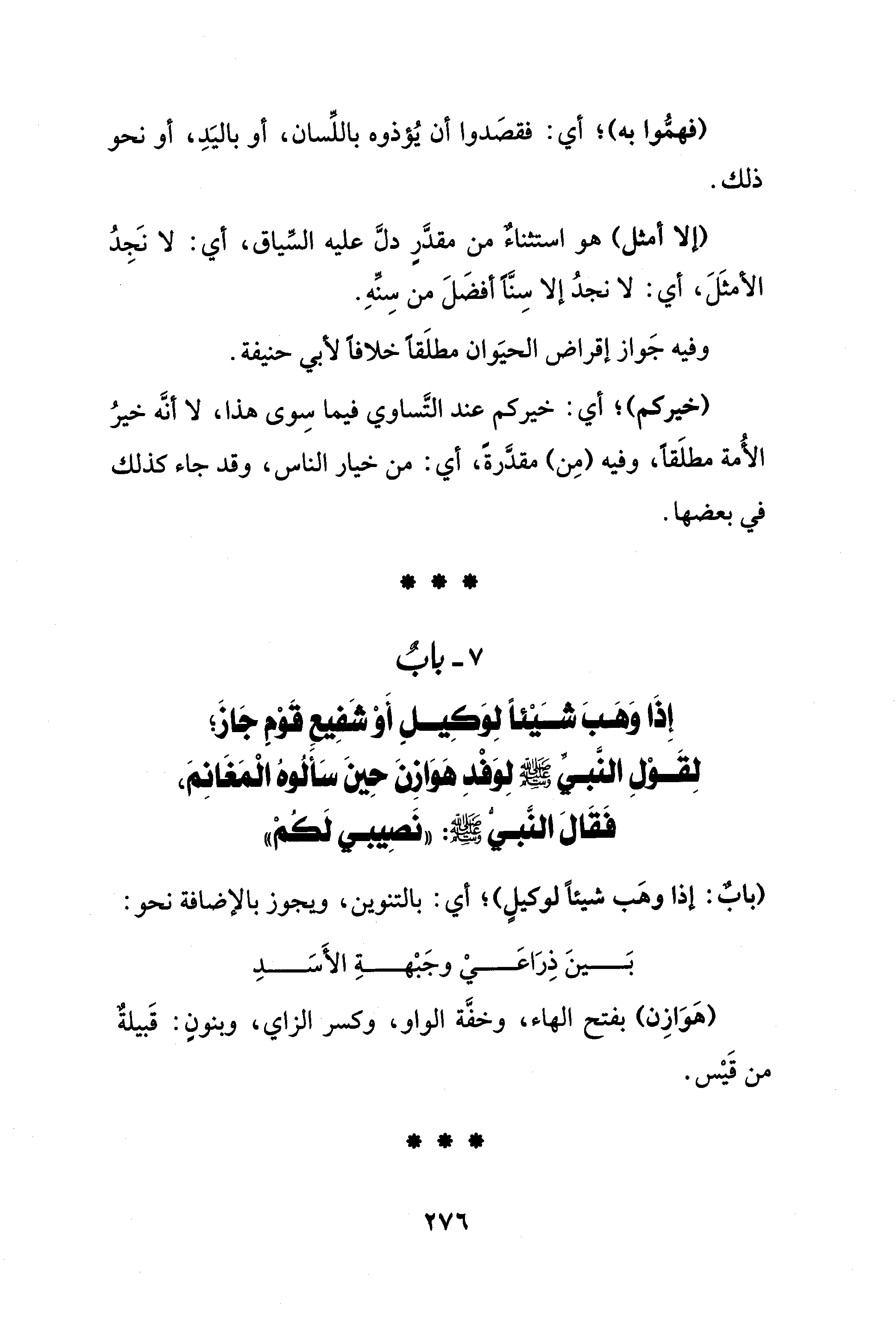 7 - بابٌ إِذَا وَهَبَ شَيْئًا لِوَكِيل أَوْ شَفِيعِ قَوْمٍ جَازَ؛ لِقَوْلِ النَّبيِّ - صلى الله عليه وسلم - لِوَفْدِ هَوَازِنَ حِينَ سَأَلُوهُ الْمَغَانِمَ، فَقَالَ النَّبيُّ - صلى الله عليه وسلم -: "نَصِيبي لَكُمْ"