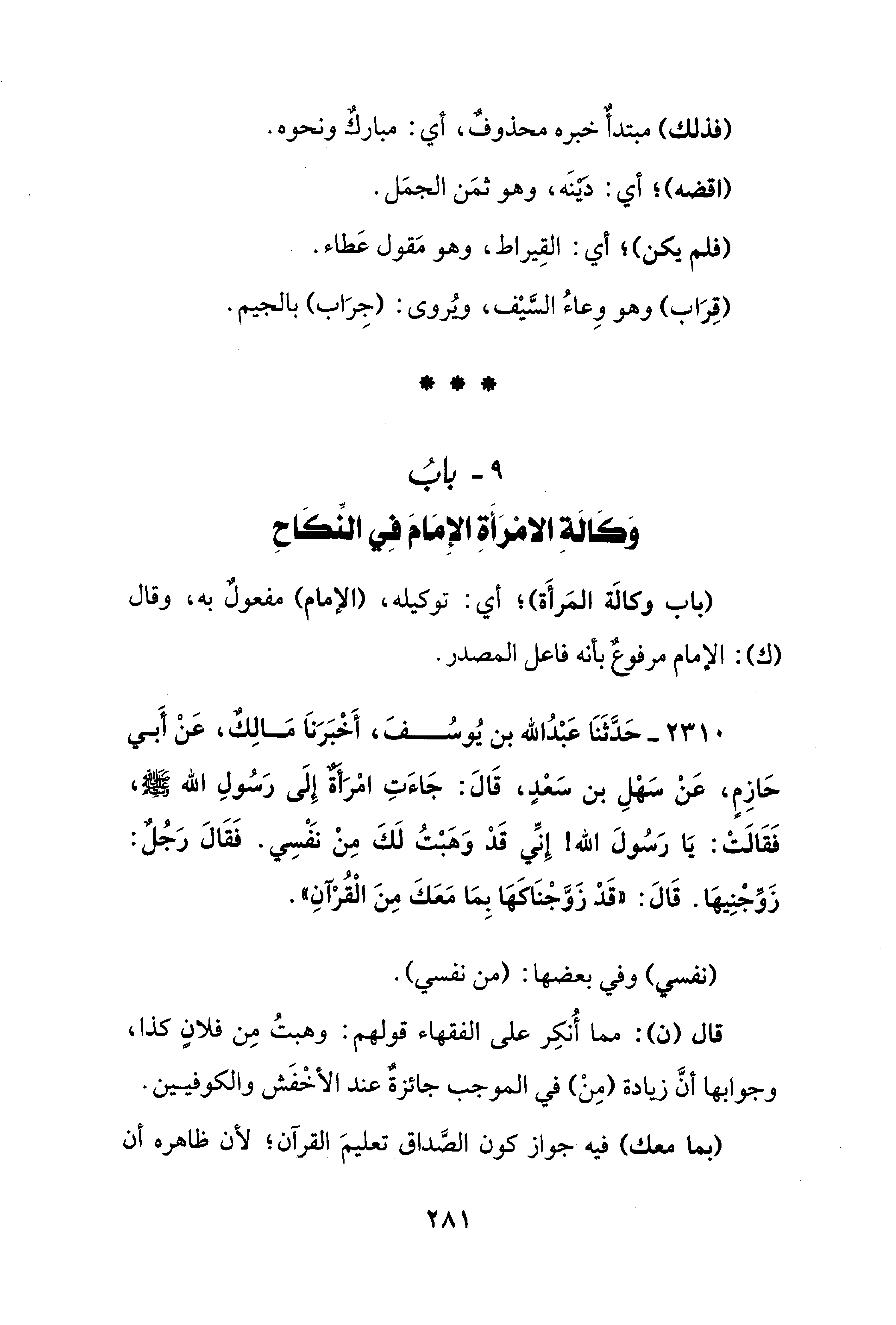 2310 - حَدَّثَنَا عَبْدُ الله بن يُوسُفَ، أَخْبَرَنَا مَالِكٌ، عَنْ أَبي حَازِمٍ، عَنْ سَهْلِ بن سَعْدٍ، قَالَ: جَاءَتِ امْرَأَةٌ إِلَى رَسُولِ الله - صلى الله عليه وسلم -، فَقَالَتْ: يَا رَسُولَ الله! إِنِّي قَدْ وَهَبْتُ لَكَ مِنْ نَفْسِي. فَقَالَ رَجُلٌ: زَوِّجْنِيهَا. قَالَ: "قَدْ زَوَّجْنَاكَهَا بِمَا مَعَكَ مِنَ الْقُرْآنِ".