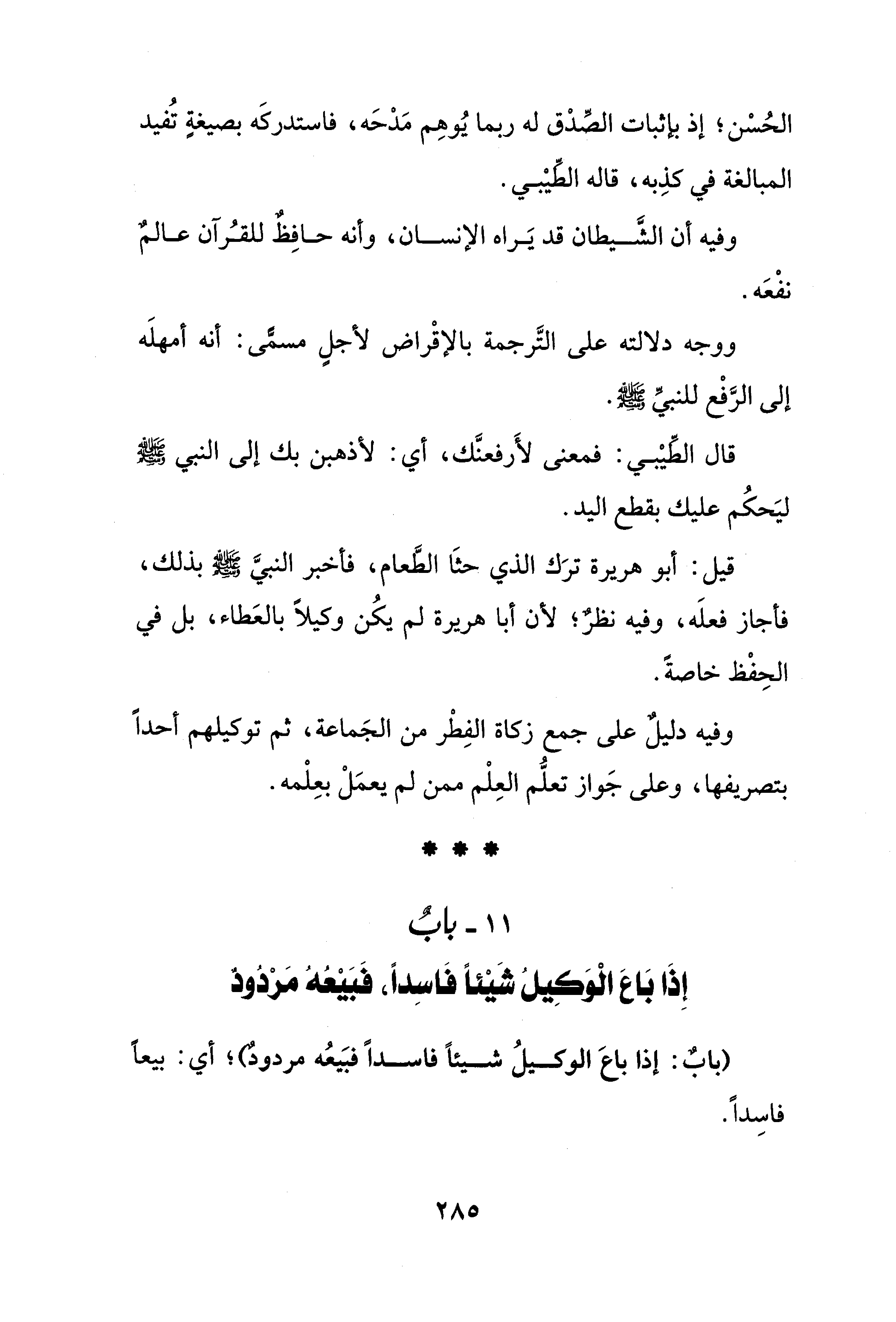 قيل: أبو هريرة ترَك الذي حثَا الطَّعام، فأخبر النبيَّ - صلى الله عليه وسلم - بذلك، فأجاز فعلَه، وفيه نظرٌ؛ لأن أبا هريرة لم يكُن وكيلًا بالعَطاء، بل في الحِفْظ خاصةً.