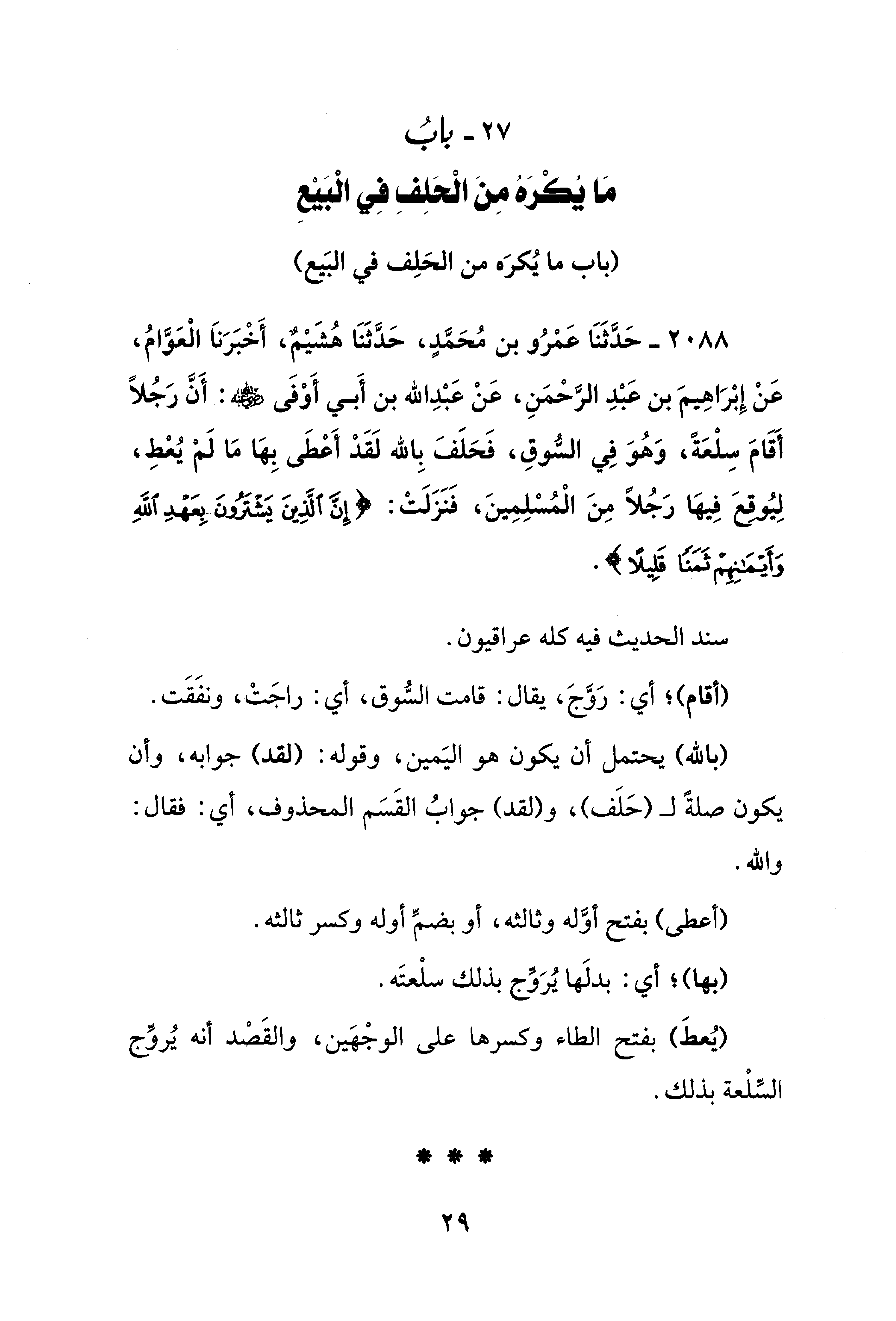 2088 - حَدَّثَنَا عَمرُو بن مُحَمَّدٍ، حَدَّثَنَا هُشَيْمٌ، أَخْبَرَناَ الْعَوَّامُ، عَنْ إِبْرَاهِيمَ بن عَبْدِ الرَّحْمَنِ، عَنْ عَبْدِ الله بن أَبي أَوْفَى - رضي الله عنه -: أَنَّ رَجُلًا أَقَامَ سِلْعَةً، وَهُوَ فِي السُّوقِ، فَحَلَفَ بِالله لَقَدْ أَعطَى بِها مَا لَم يُعطِ، لِيُوقِعَ فِيها رَجُلًا مِنَ الْمُسْلِمِينَ، فَنَزَلَتْ: {إِنَّ الَّذِينَ يَشْتَرُونَ بِعَهْدِ اللَّهِ وَأَيْمَانِهِم ثَمَنًا قَلِيلًا}.