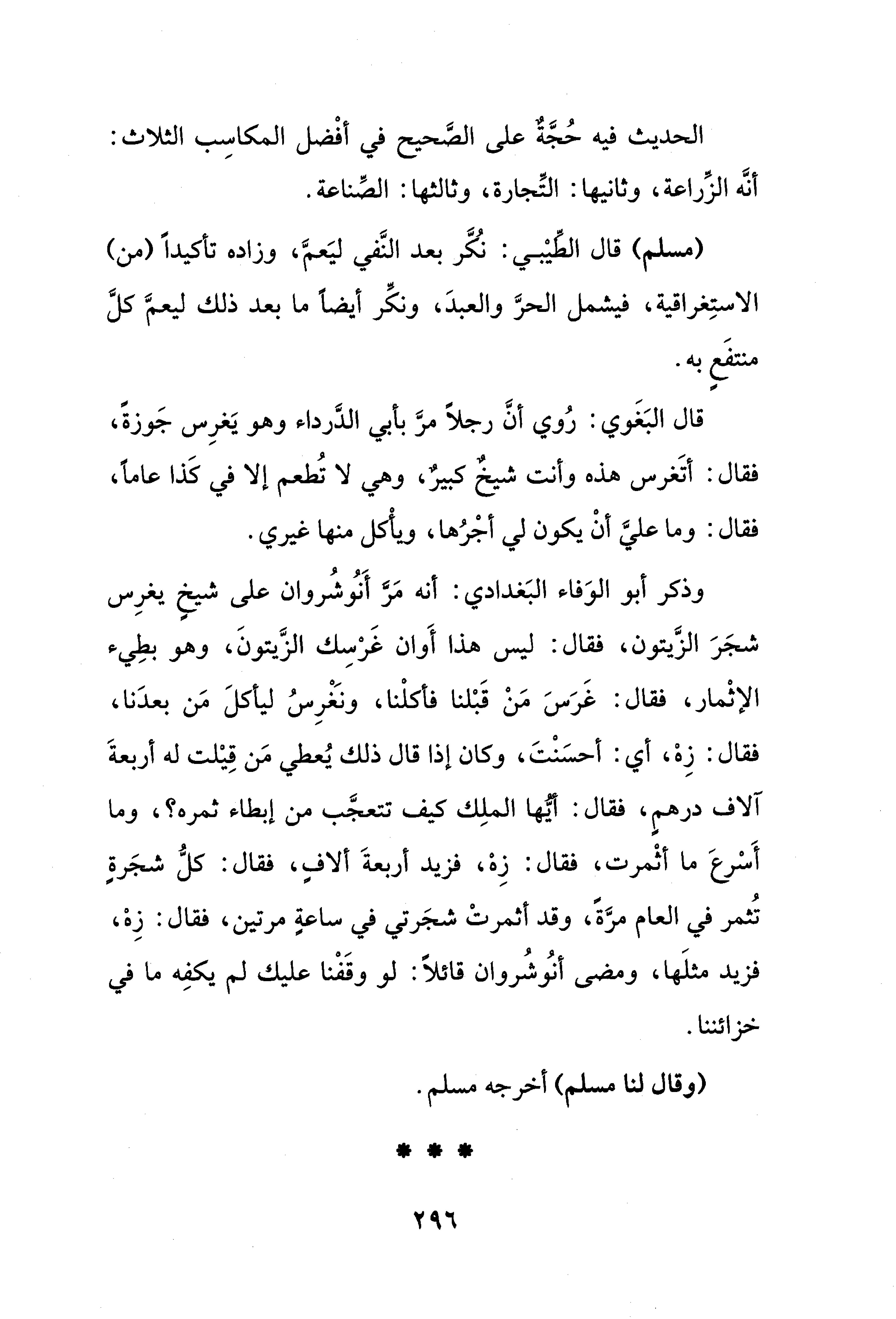 قال البَغَوي: رُوي أنَّ رجلًا مرَّ بأبي الدَّرداء وهو يَغرِس جَوزةً، فقال: أتَغرس هذه وأنت شيخٌ كبيرٌ، وهي لا تُطعم إلا في كَذا عامًا، فقال: وما عليَّ أنْ يكون لي أجْرُها، ويأْكل منها غيري.